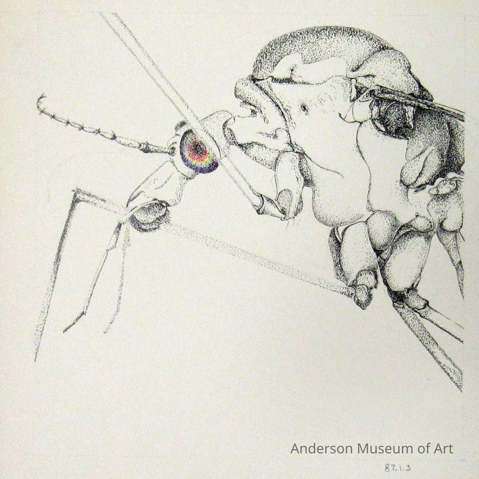 Close up of an insect's head. The body is coming in from the right. There are four visible legs. Two are going off the right of the page. One is overlapping its eye and the other is pointed left almost touching the left side of the page. The eye is the only thing colored and is a rainbow. There are traces of pencil marks still left.Type of Drawing