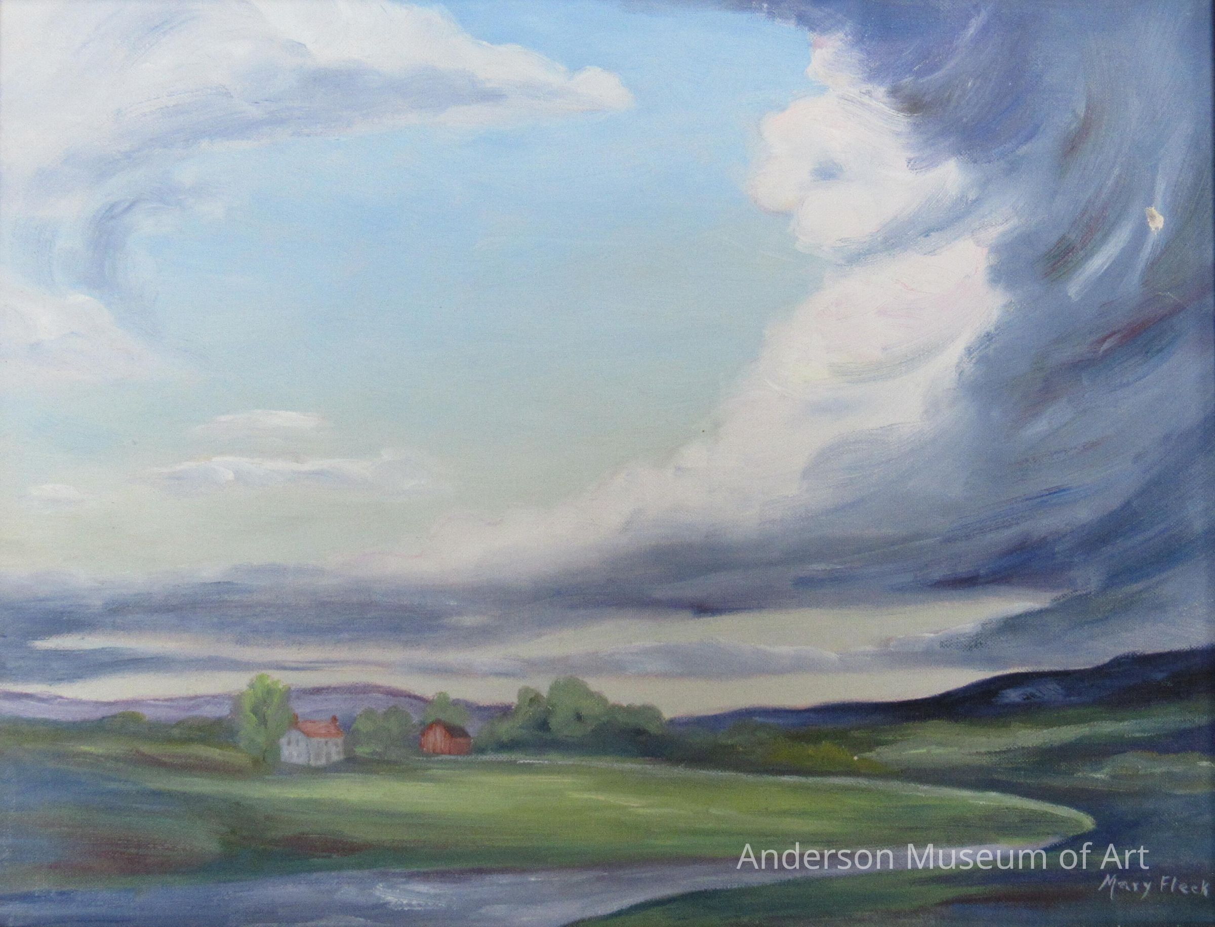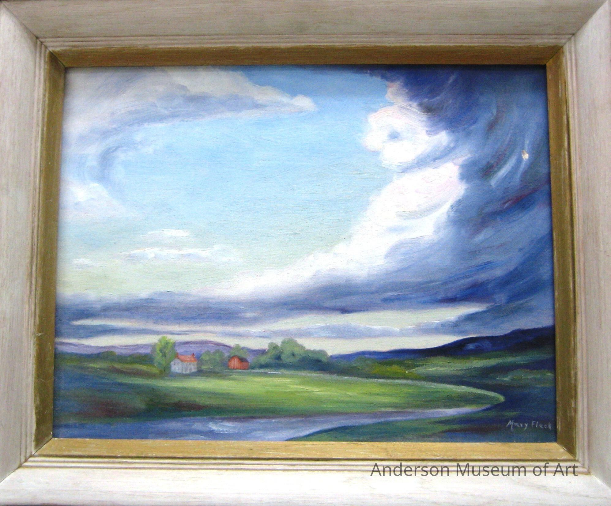 A landscape is depicted showing a red and white farm house and red barn in the lower 1/4 of the composition. A crescent shaped dark cloud front is in the upper right portion of the composition and is composed of whites, purples, blues, suggestions of maroon, and green. The ground under the clouds is mostly purples and blues but where the brighter parts of the sky are, the ground is light green and has tints of pale yellow.Type of Painting
