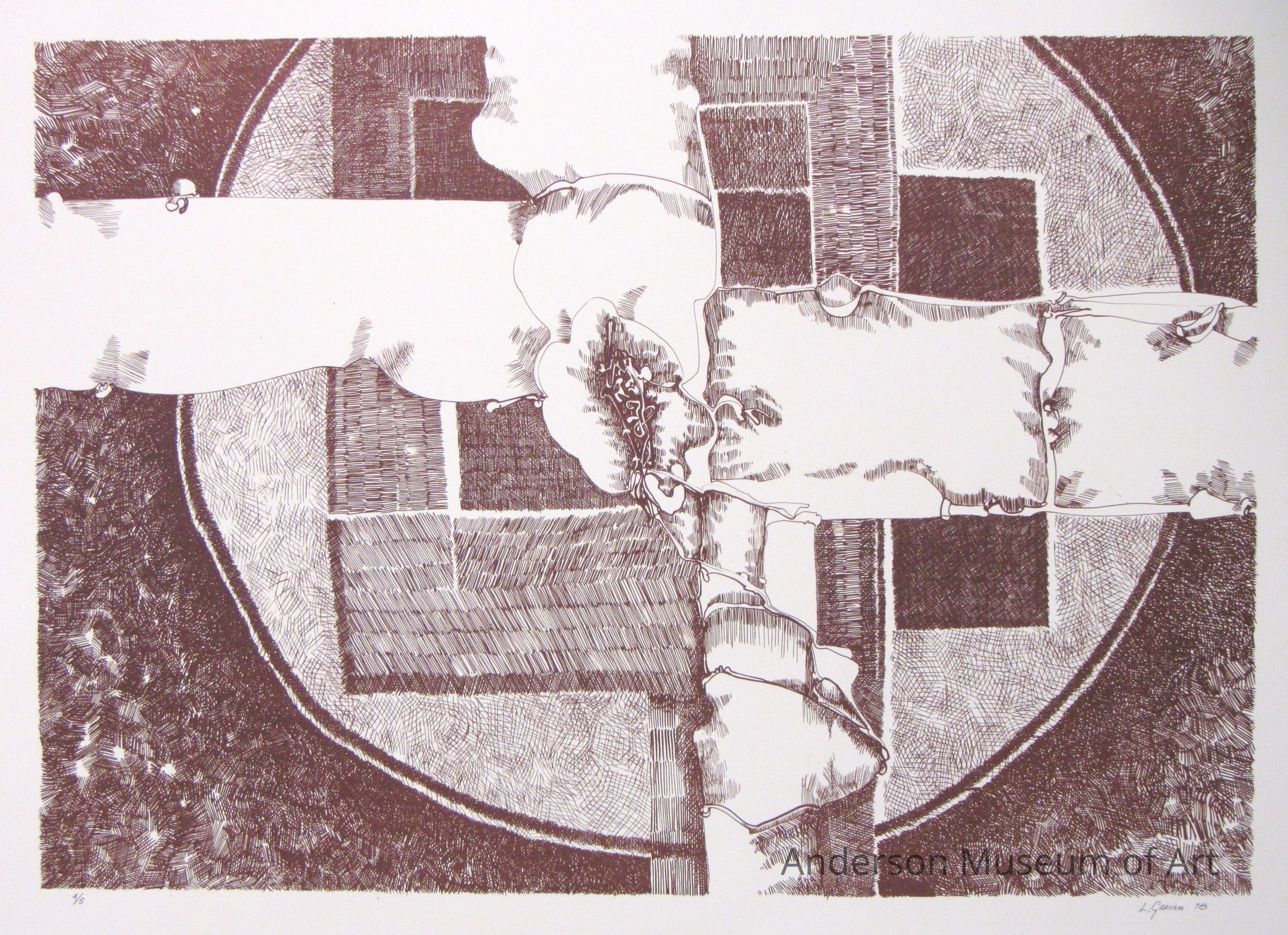 A brown abstract design formed by a chicken scratch method, it has a large circle with squares within it, and a large cross-like clearing overlapping the circles and squares. The area around the circle have thick, dark, hatch marks. The circle has a dark hatch mark ring but the rest is made up of light marks. The rectangles within the circle are of various shades with the darkest on the right. Edition 4/5. Signed L. Graham 78 in the lower right corner.Collection