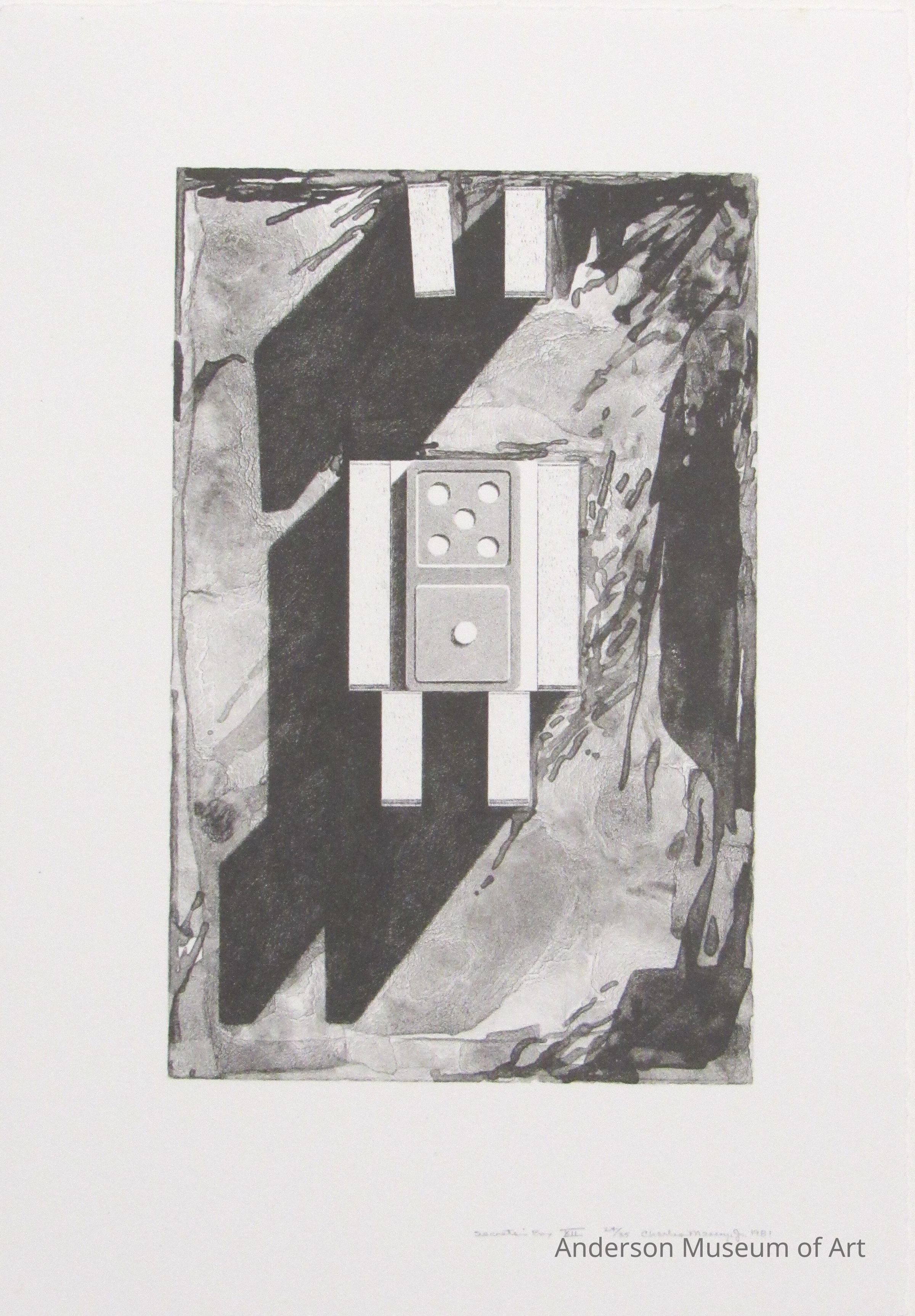 The dominio faces up with five dots on the top and one on the bottom. The domino is lying on a board with two protruding rectangles from the bottom. All of these casts a shadow to the lower-left corner. Print 24/35.Collection