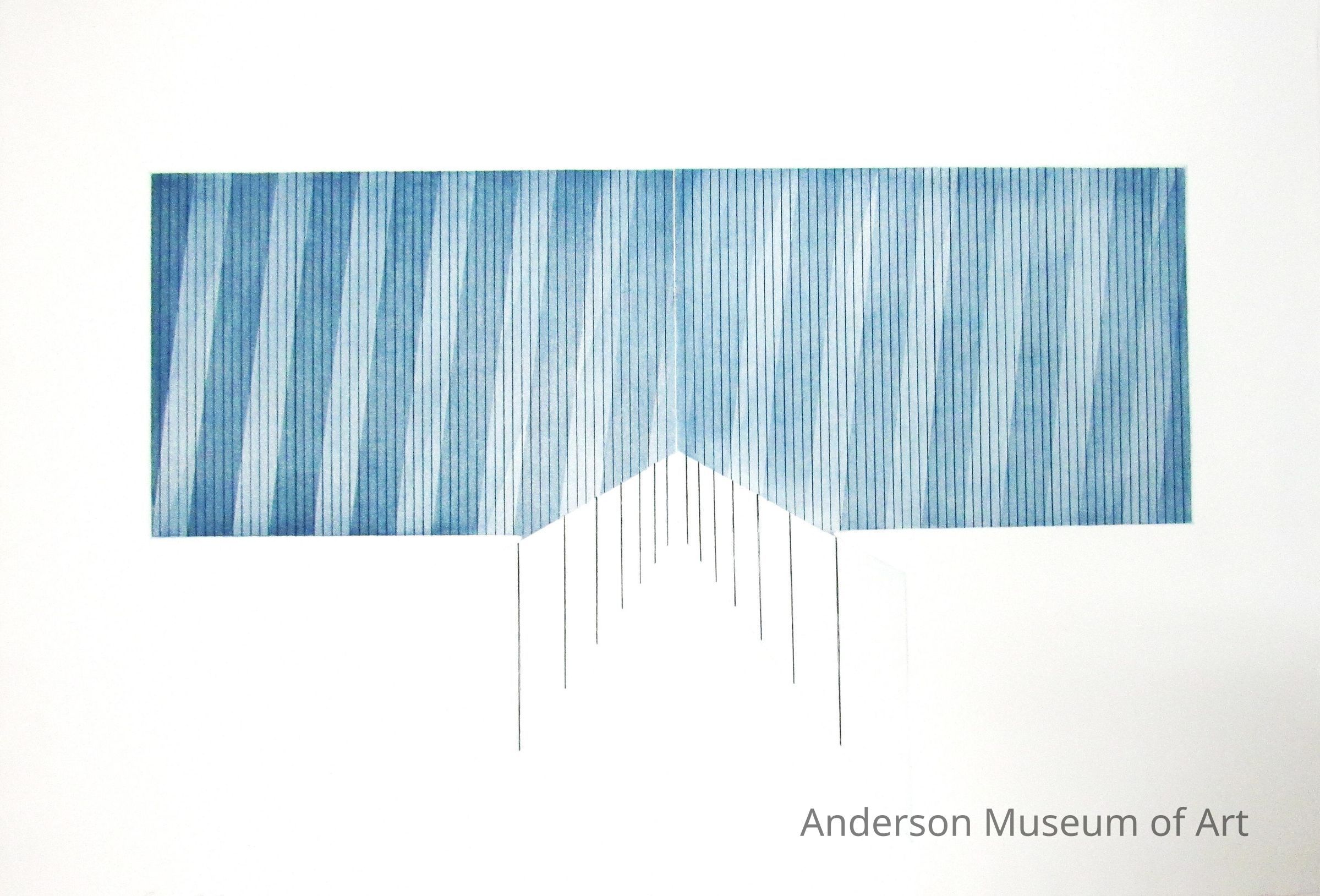 Color etching and aquatint on medium-heavy weight white textured paper with watermark in the lower right corner. Image is abstract consisting of two horizontal rectangles centered in the sheet with alternating bands of medium and light blue angled to the right, and parallel dark blue narrow lines over these bands of color. Where the two rectangles join are two more rectangles that seem to project forward, these are very light blue, and they have vertical parallel light blue lines, and they form a "V". The print is numbered, signed, and dated in the lower-left corner, "13/40 R Smith (19) 72." The sheet is deckled along the bottom and right edge, the top and left edges are torn.Collection