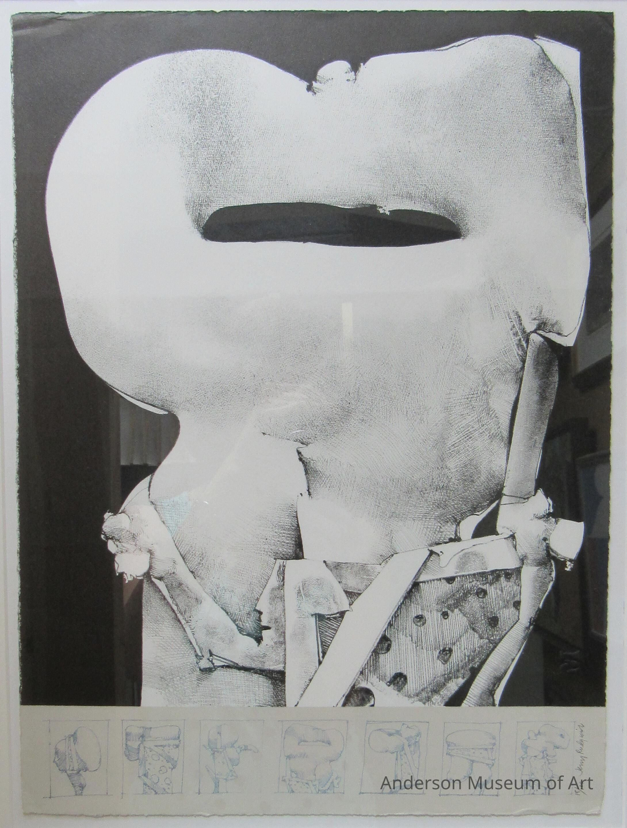 18/100 A very sculptural looking white mass on black covers the upper 7/8 of the page. The form has finger prints and forms of clothing. The bottom 1/8 is on gray. It has seven separate squares each with a mass compatible to the one at the top. There are printed in blue, signed and numbered. Signed "Jerry Rudquist: in the lower right corner.Acquisition