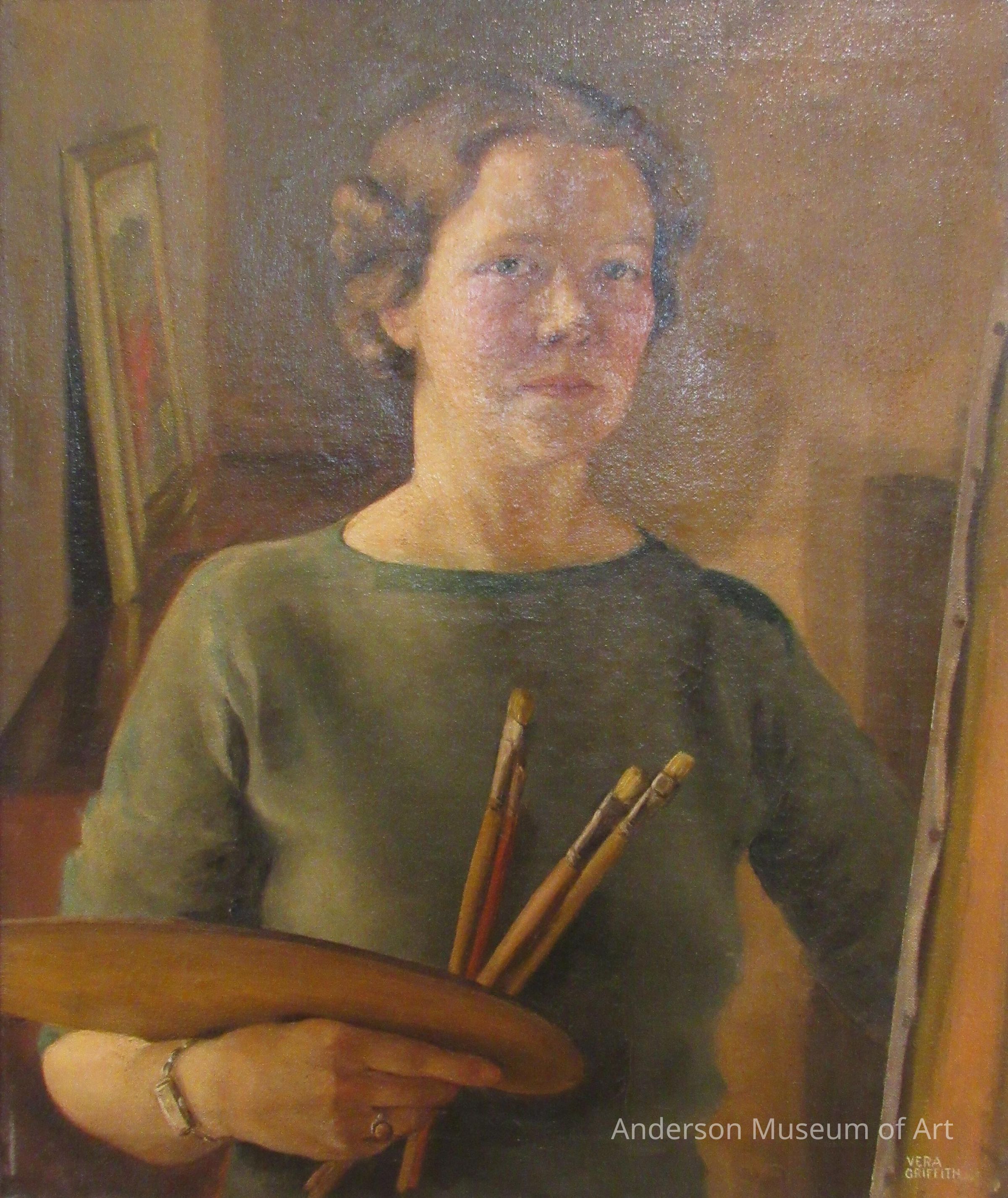 Self-portrait of the artist, Vera Griffith, from the waist up. Vera is standing facing the viewer at an easel. The easel is on the right. In her right hand are four paintbrushes and a palette is resting on her wrist. She also has a ring on her finger and a watch on her right hand. Vera is dressed in a dark green shirt/dress. Over her right shoulder is a piece of furniture with a piece of artwork resting on it against the wall. The painting has dark earth tones.
