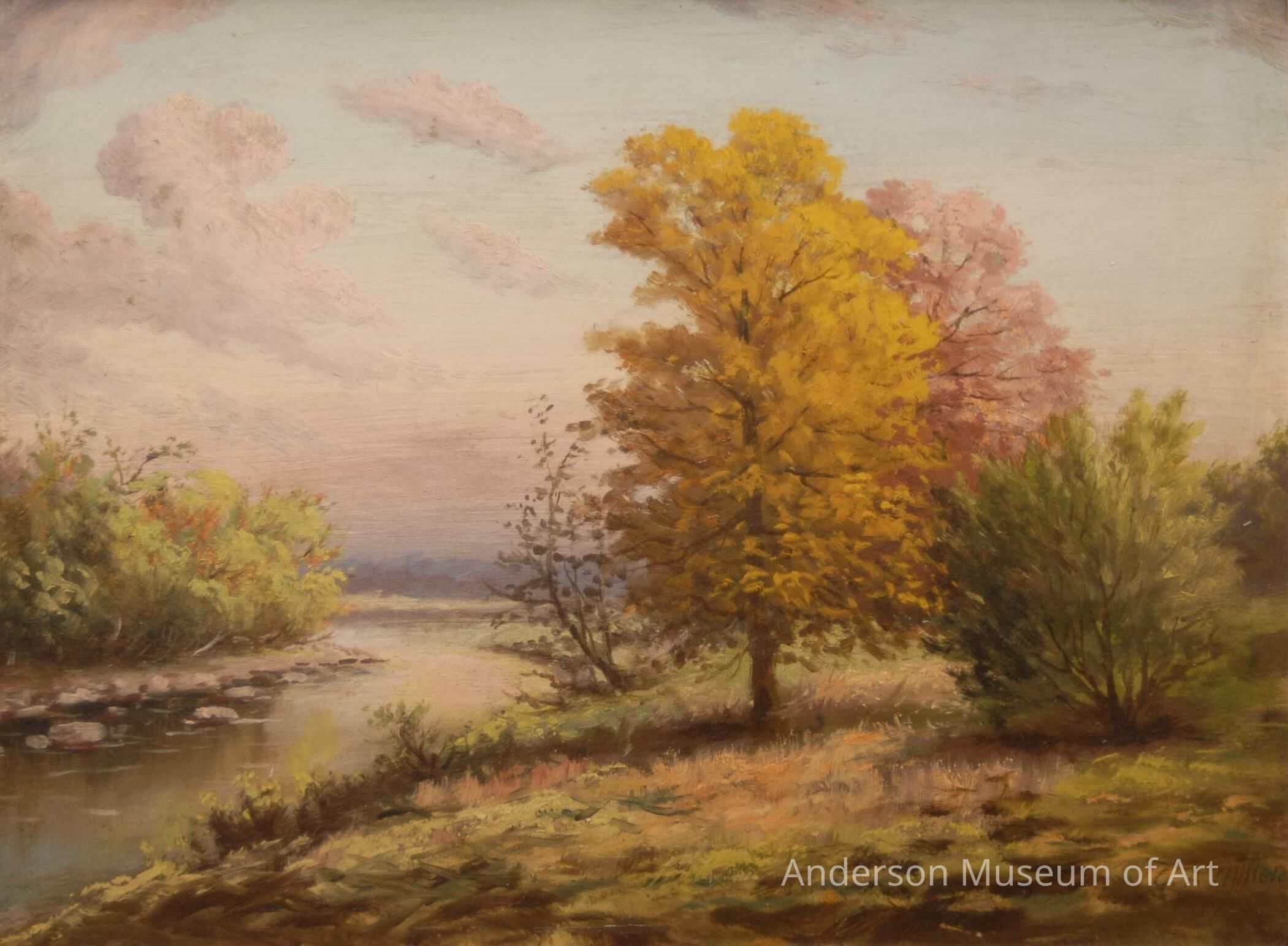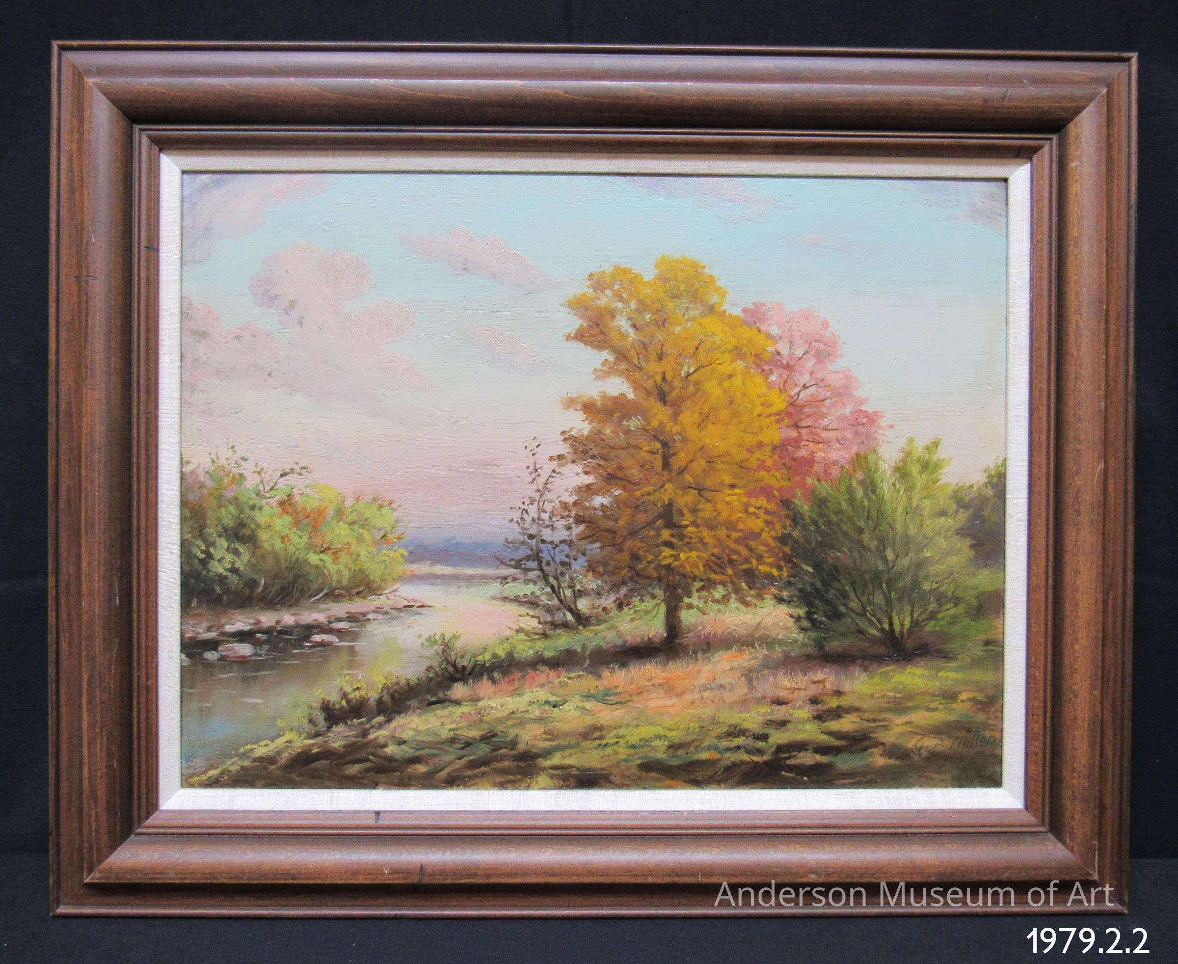 Colorful landscape with a stream running through the left center to the lower left corner. Four trees dominate the right half of the paintings. The focal tree is a golden yellow with a pink tree to its right and a small green tree to the right foreground. Bushes are located on the left side of the stream and a rocky bank. The scene appears to be early autumn. It is signed and dated "G. A. Miller 1926" in pencil in the lower right corner.