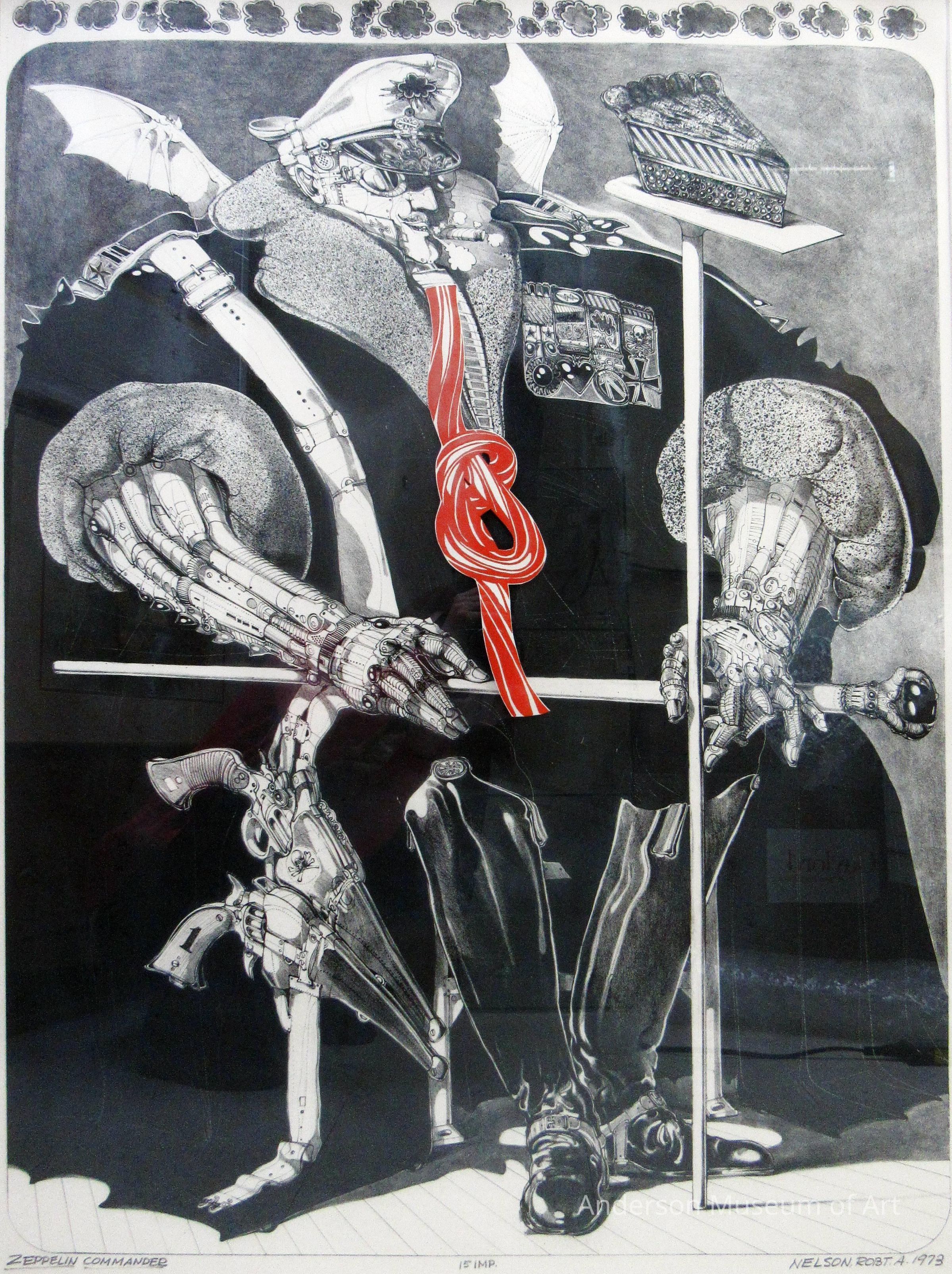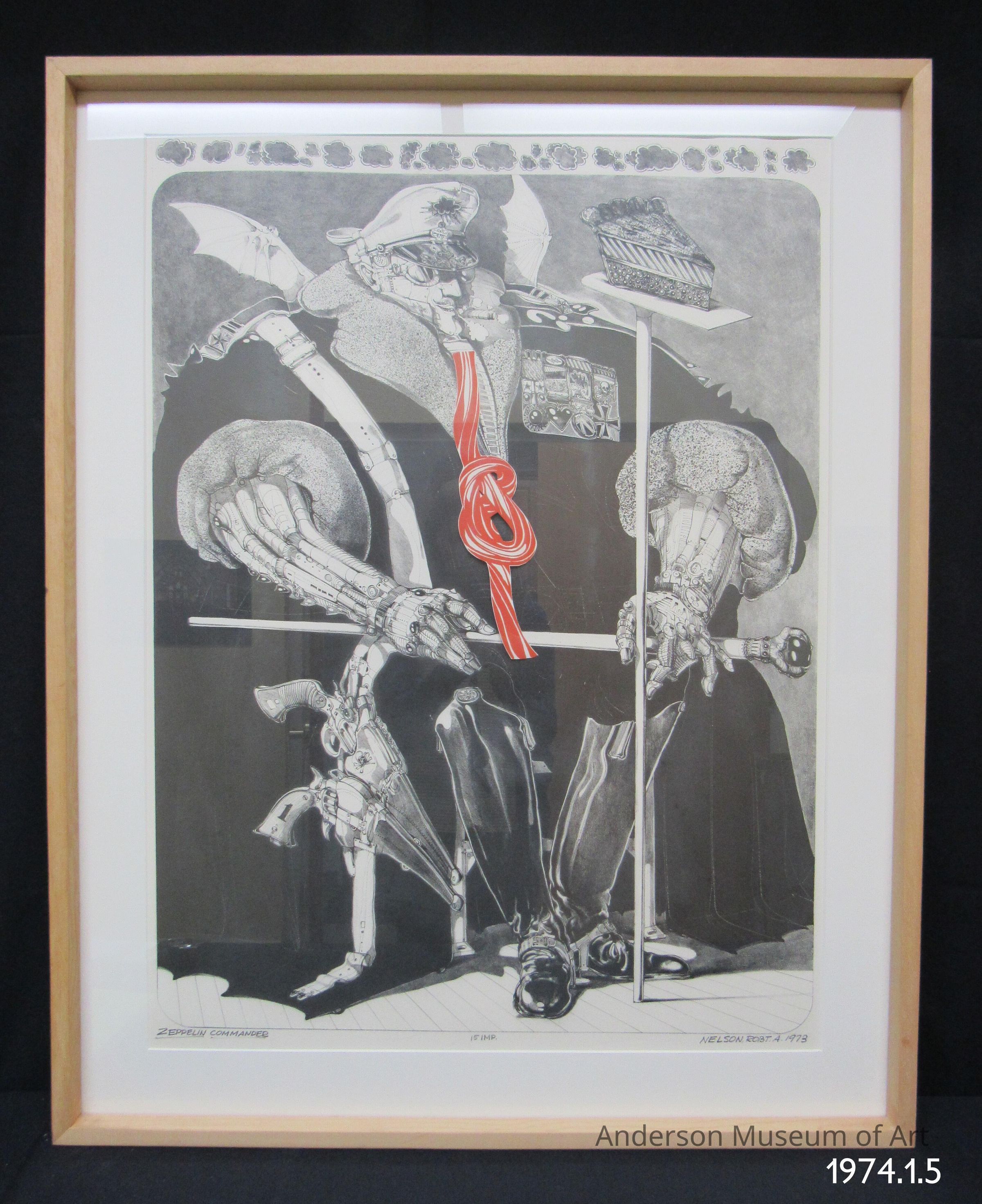 Lithograph print and ink drawing. A mechanical man made of metal with cigar in mouth wearing a long black coat with puffed sleeves. He is wearing a white pilots hat and knee high black boots. There is a white strap hanging over his right shoulder with two hand guns holstered at knee height. He is also wearing glasses and has two small white bat like wings. There is a grouping of metals over his heart. Across his lap is scepter. Coming from his neck, and the only color, is a red rope that is in a knot half way through. In front of the man is a tall pole with a piece of pic sitting on top and at face height with the man. The man's head is not proportionate, much smaller, than the rest of his body. Along the top and outside of the rounded corner image are small clouds. "15 IMP. "Collection