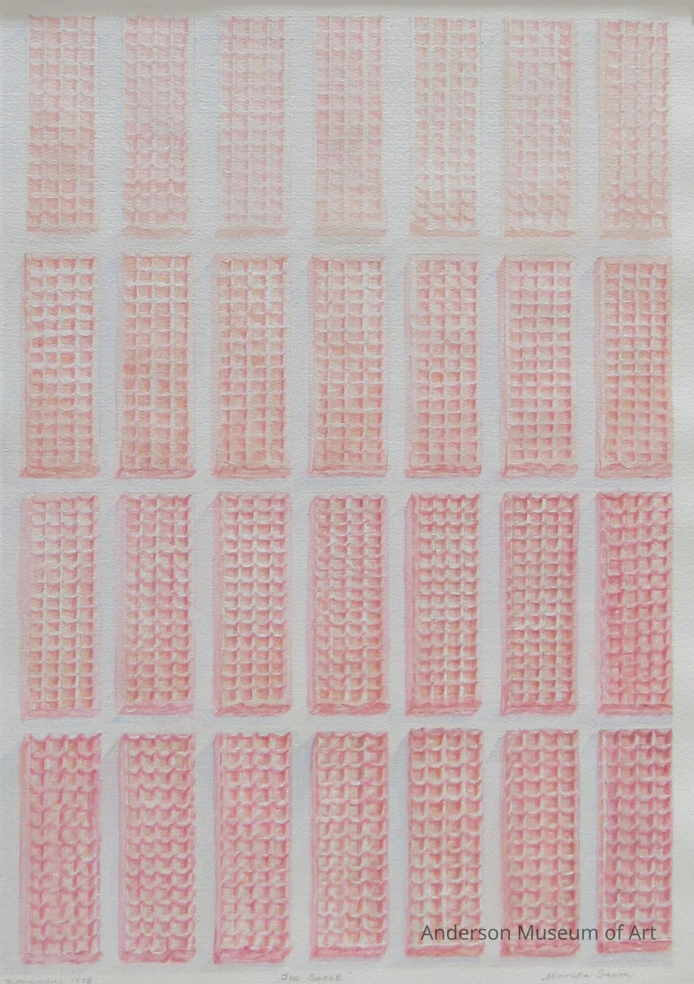 Rectangular objects with coffered surfaces ranging from very light pink to an intense tone of fuchsia. Colors are lightest in the top left corner and get darker as they angle toward the bottom right corner. I believe the rectangular objects are strawberry wafers, hence the title "Too Sweet". Signed in the lower right corner "Marsha Saxon."