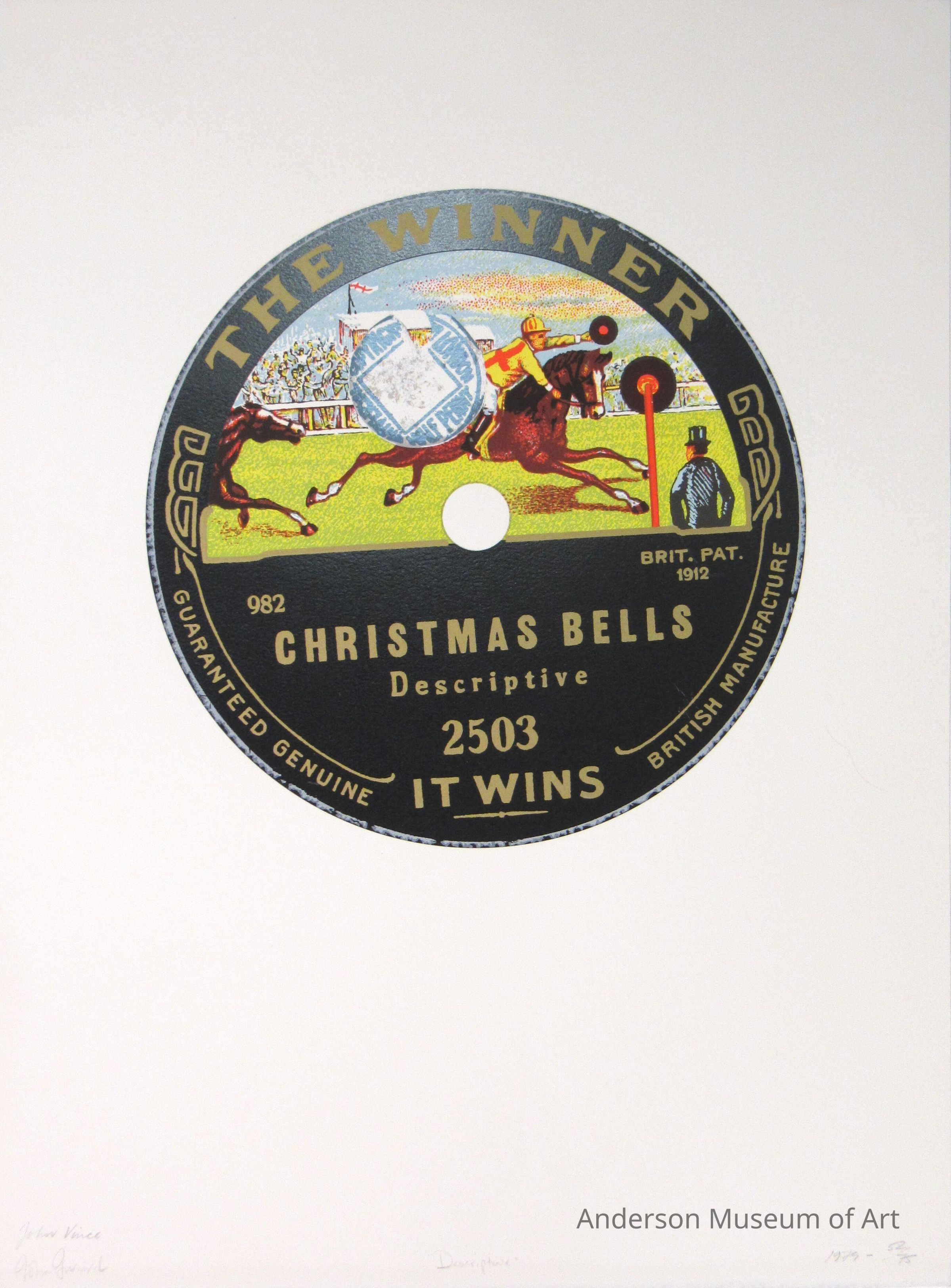 Print of a horse racing scene. The entire image is contained within a large black circle that mimics a record. The black circle has a light white and grey border around the edge. Around the inside edge in gold font reads "The Winner / Guaranteed Genuine / British Manufacture". In the top half is a color scene of a jockey in a yellow and red uniform on his brown horse about to cross the finish line. There is the head of a horse coming in behind him from the left. At the bottom right is a man in a black suit and top hat facing the race. In the background to the left is a crowd of people in front of a building. There is a blue and white area made to look like a sticker that covers the back of the winning horse. In blue it reads "Copyright / London / Half Penny". The bottom half is all black with gold text that reads "982 / Brit. Pat. 1912 / Christmas Bells / Descriptive / 2503/ It Wins". Signed in pencil 1979 edition 52/75.