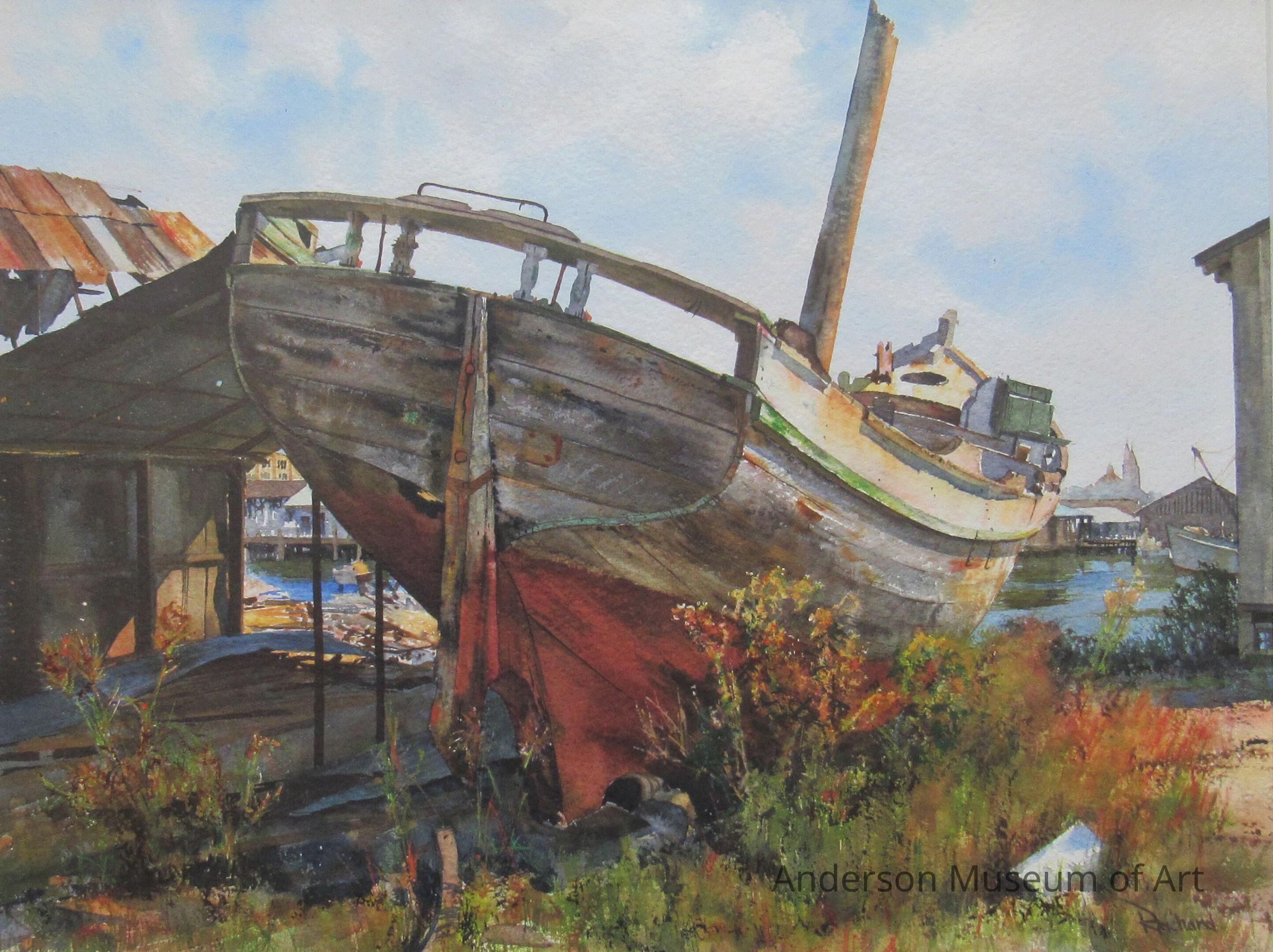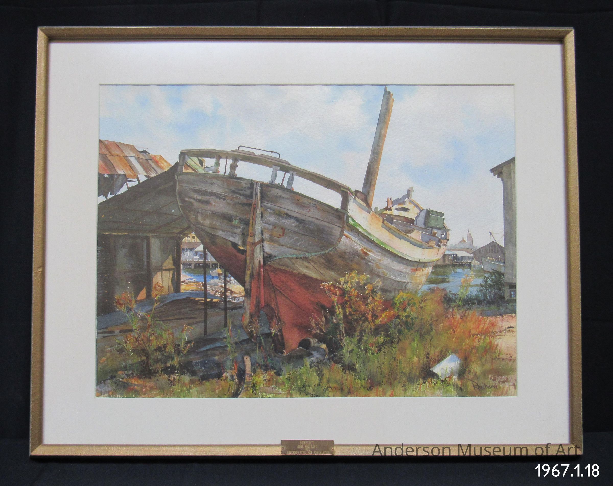 An old sailboat is seen from the back. It is on the shore, has a broken mast and rudder, and is generally in a bad state of repair. The under area of the boat is painted red. There are weeds growing around the hull. There is a lean-to building on the left of it. Water can be seen, behind as well as a dock and various buildings. It is signed "Reichard" in the lower right corner.Type of Painting