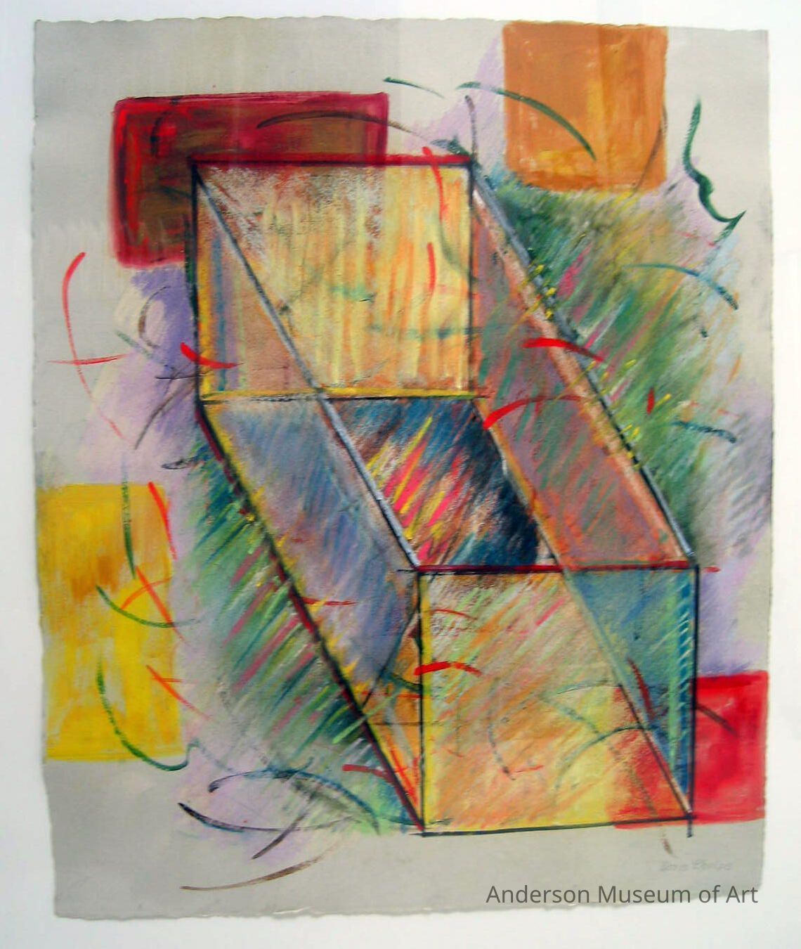 Clear but multicolored rectangular box. The short sides are yellow, and the long right side is red, and the long left side blue. Some green shading/shadow lines come from the bottom left edge and the top-right edge. There is an orange square to the right of the top right corner. A red rectangle behind the back short side/top left corner. A yellow vertical rectangle along the bottom left side of the paper and a red rectangle at the bottom right corner and going off the page's right side.Collection