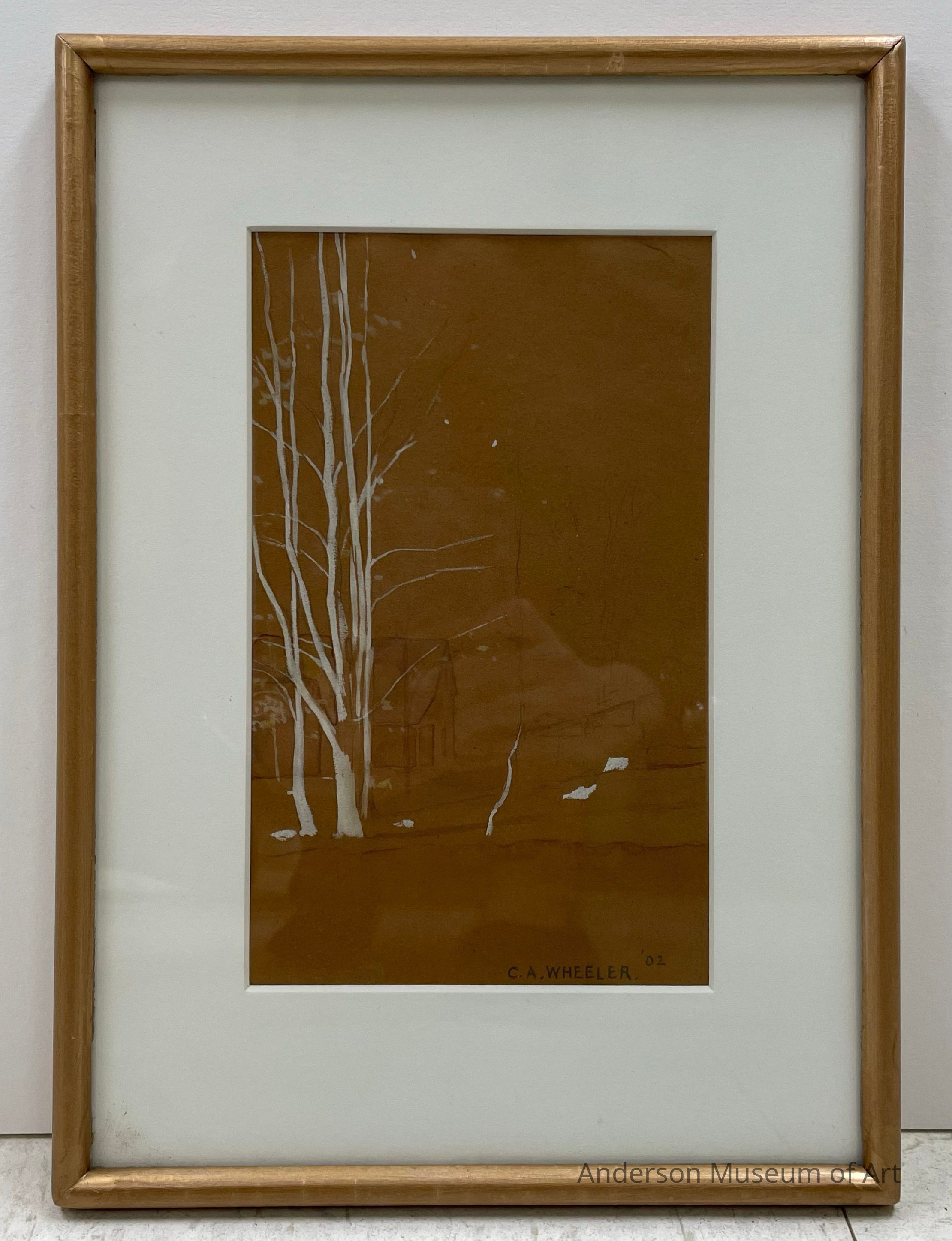 Pencil, watercolor, and gouache on tan pulp paper, depicting a house in the left middle ground with other out buildings to the right. In front of the house stands 3 or 4 trees heightened with white gouache. A light reddish wash is over the house, and a light greenish wash is in the foreground. Some very faint trees are noticeable in the far middle ground on the right side. The entire image is faded markedly. The work is signed on the bottom right corner in pencil, "C. A. Wheeler. (19)'02."
