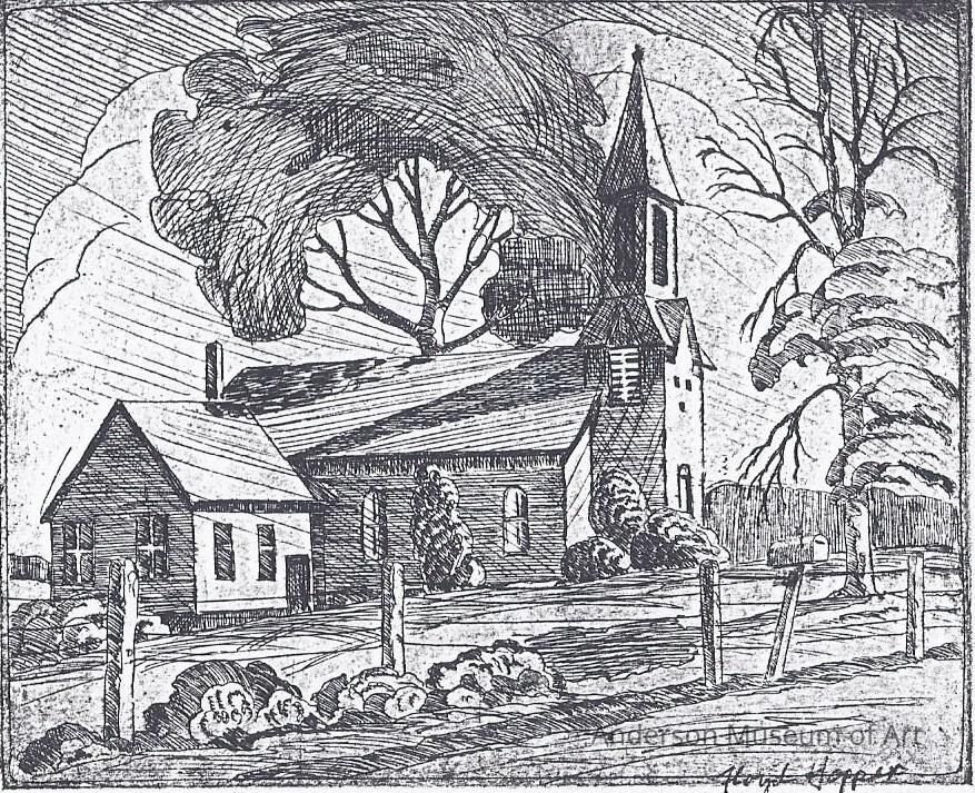 Image of a country church with a large white cloud in the distant background. The church is constructed in an L formation. It has a tall belfry at the front of the building, while the backend of the building (the part that takes the bend in the L) appears to be a later addition since its architecture does not match the front. Behind the church there grows a tall tree that towers over the church, casting its shadow on the roof of the building. There is a lawn in front of the church that is surrounded by a barbed-wire fence. On a post near the road is a rural mailbox with the red pick-up flag hoised. On the lawn in front of the building, there is a tall tree that is dying. It stands in UR and UC of the picture plane. its upper limbs are barren, as are a few of its lower limbs.Acquisition