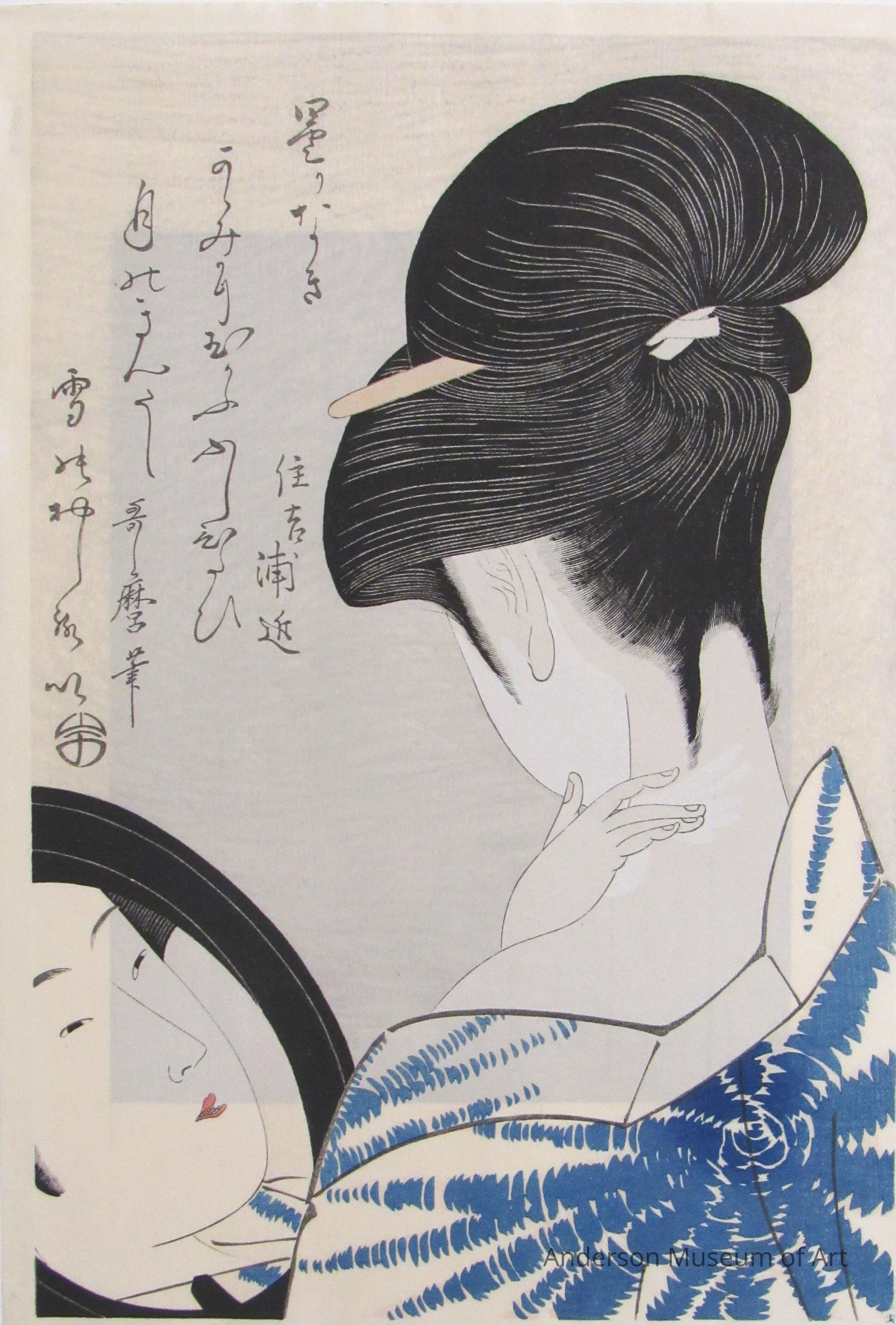 Image of a geisha applying white makeup to her neck. Her back is to the viewer, and the viewer sees her face through the reflection in the mirror (which is on the dressing table). Her hair is pulled back off her neck, and she is wearing a kimono with a large, abstracted blue floral motif. Above the mirror are words written in Japanese characters.