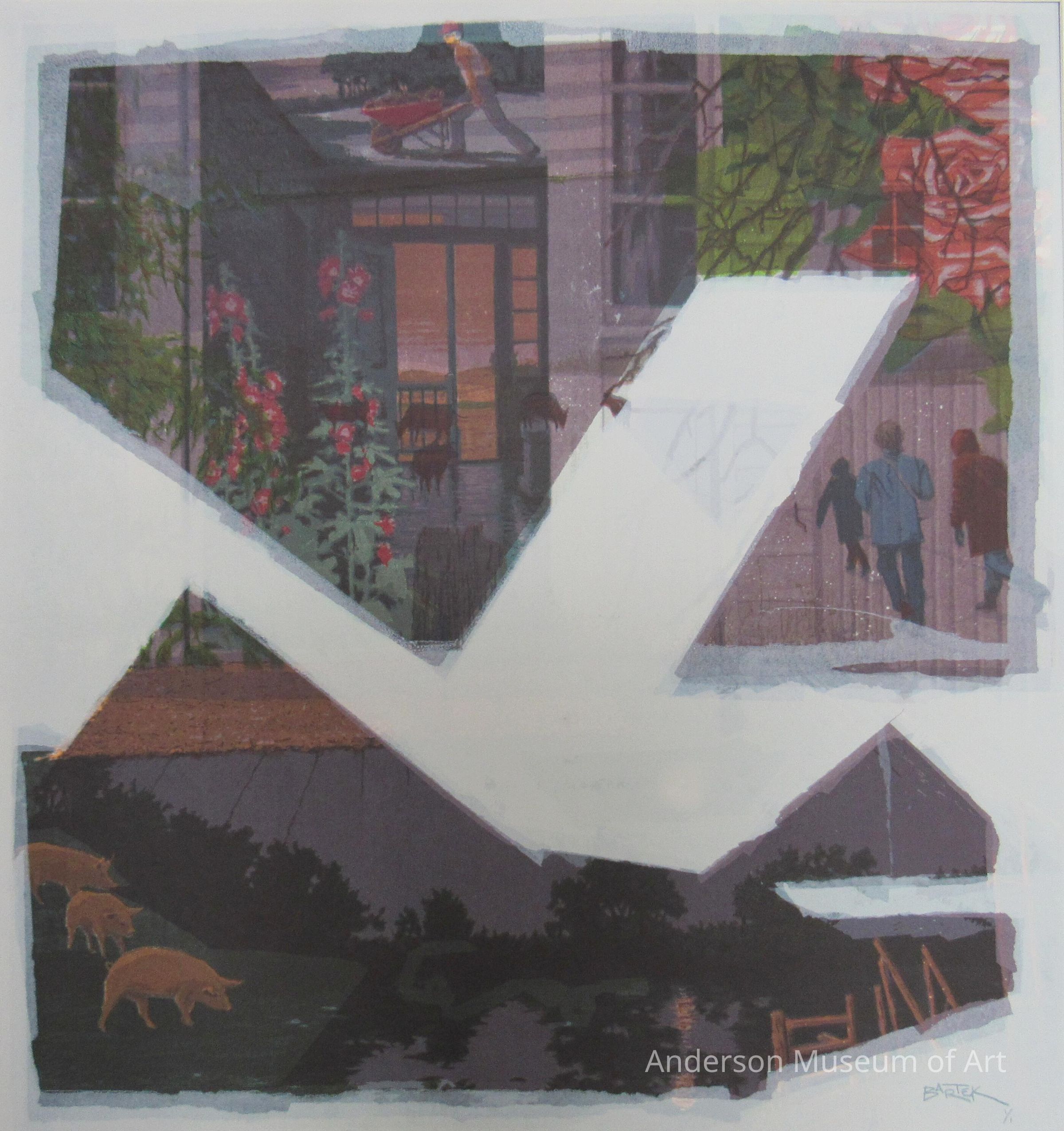 Central image appears to be attempting to overcome time/space relationships. Overall image is very rural. UC is a man pushing a red wheelbarrow. UL is a tree and configuration which appears to be a wood fence. UR appears to be roses in bloom; immediately below are three human forms that appear to be walking in the snow. C appears to be several cows and an open patio or entrance door of a house and fields beyond. LL are three pigs in evening landscape, and to their right is a rising moon and some fence rails. Entire pictorial plane is surrounded by white field which, LC and LR, invades and in jagged fashion traverses plan. This plane depicts the interior structure of an Egyptian pyramid. "BARTEK 1/1" written in colored pencil LR. No apparent manufacturer's watermark.Collection