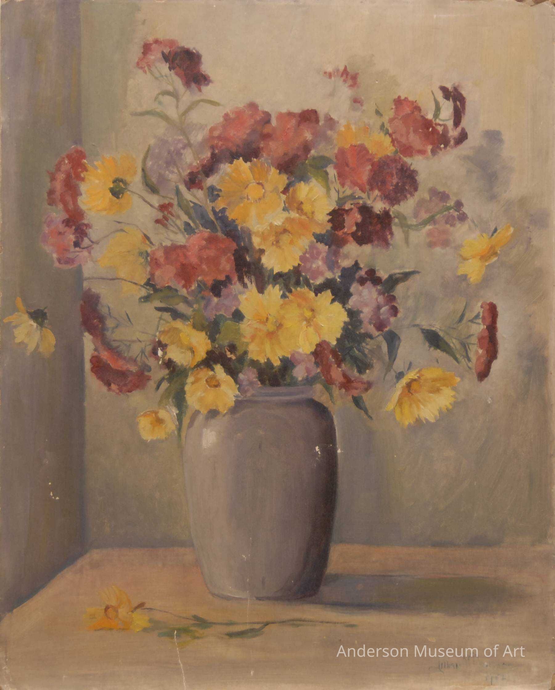 Gray vase with flowers presumably cosmos as stated in the title. Flower colors include shades of yellow, purple, and red. One yellow flower is lying in front of the vase in the foreground. Light source is coming from the left creating a light shadow of flowers on the back wall and vase on the ground. The vase appears to be in front of a corner.Type of Painting