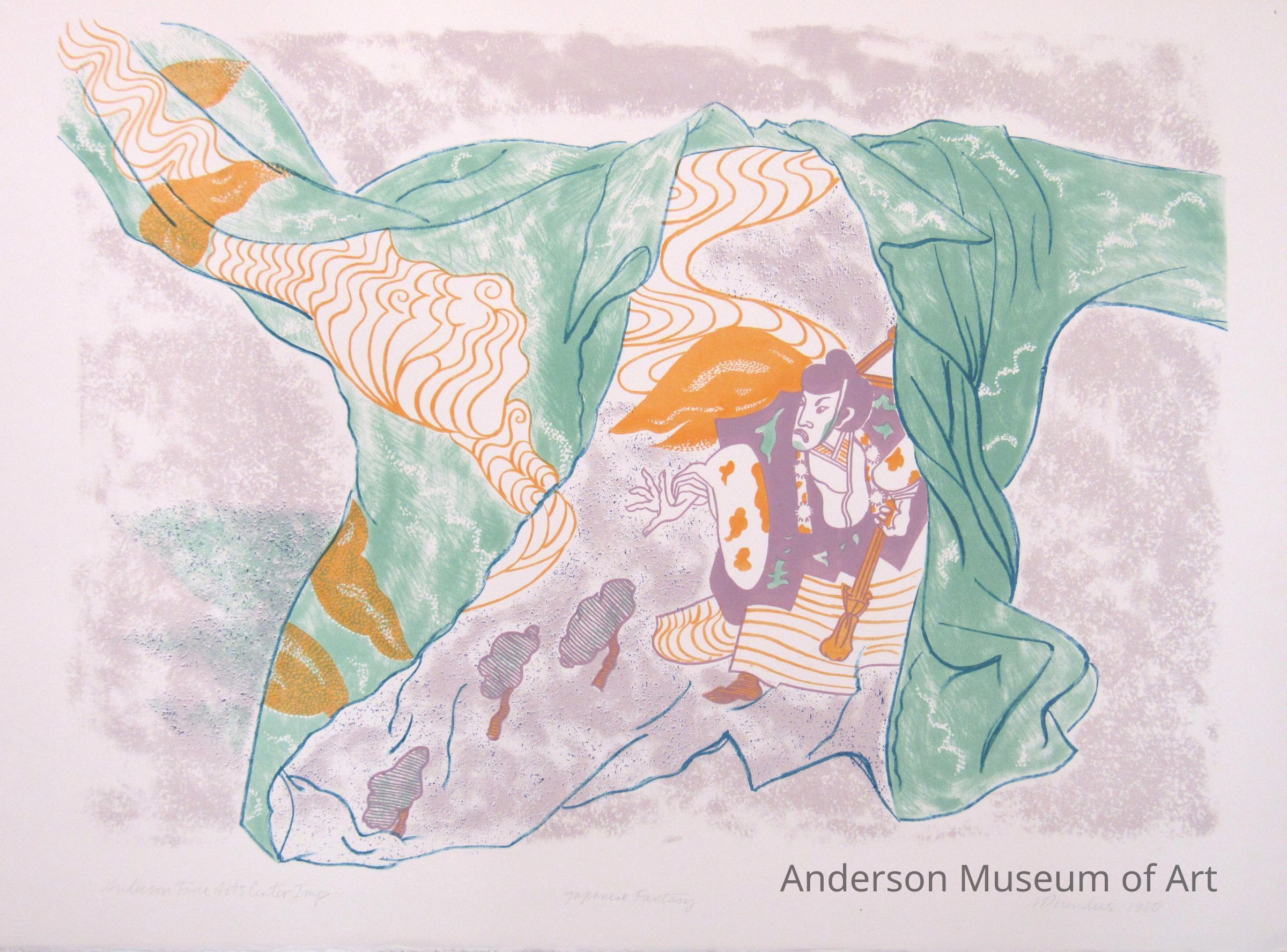 the lower left side of the shirt. The background is a light textured pattern in light violet or lavender. The print is signed in pencil below the image to the left "Anderson Fine Arts Center Imp. (ression?)," it is titled in pencil below the image center "Japanese Fantasy," and is signed and dated in pencil below the image to the right, "Al Pounders 1980."