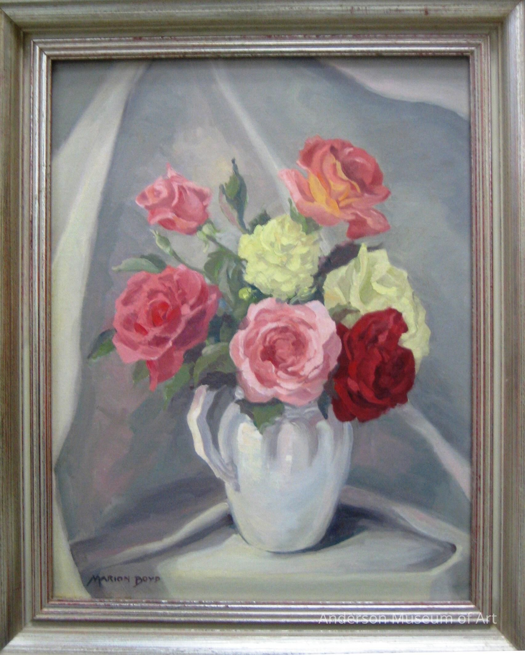 A traditional still-life of a vase of roses. The vase is centered in the canvas and there are seven rose blossoms painted in red, pinks, and yellow. The background consists of a fabric that has been draped to form a backdrop. The folds come together off the canvas in the upper left portion of the composition.Type of Painting
