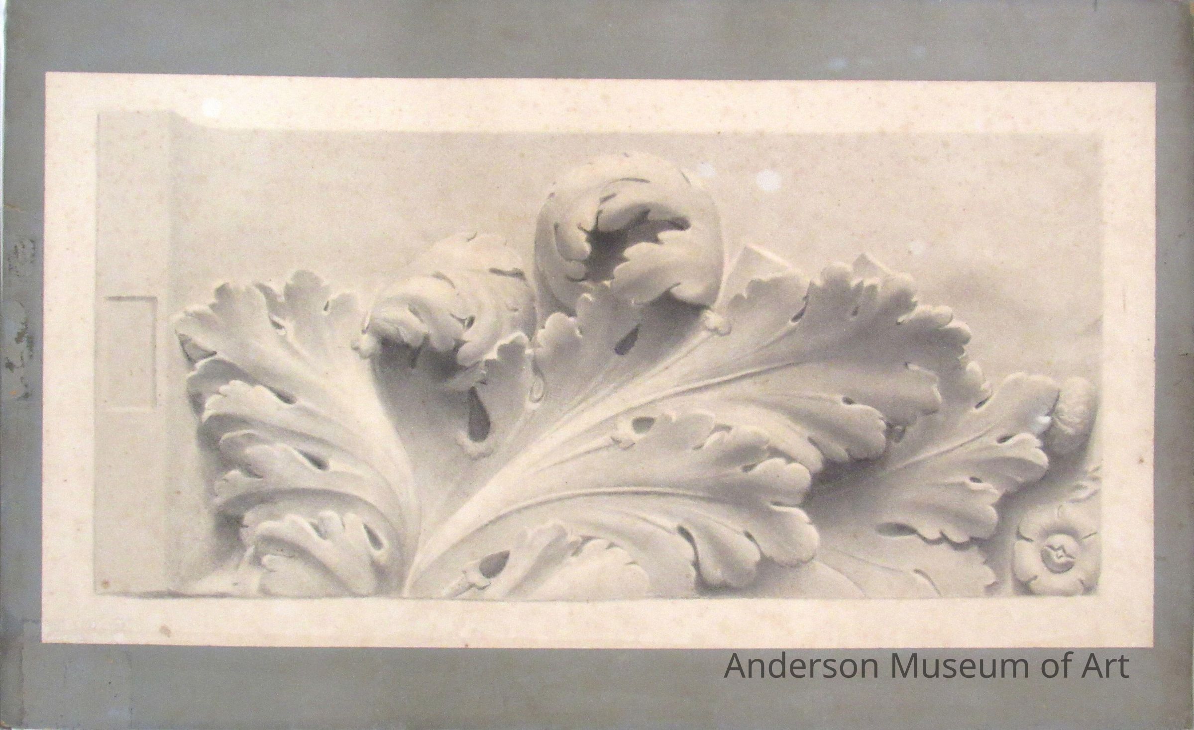 Rendering of a frieze decoration, acanthus leaf. Detailed close up of a a couple of these leaves which are coming from the bottom up and lead off the page to the right. There is a white border around the drawing. Unsigned.Type of Drawing
