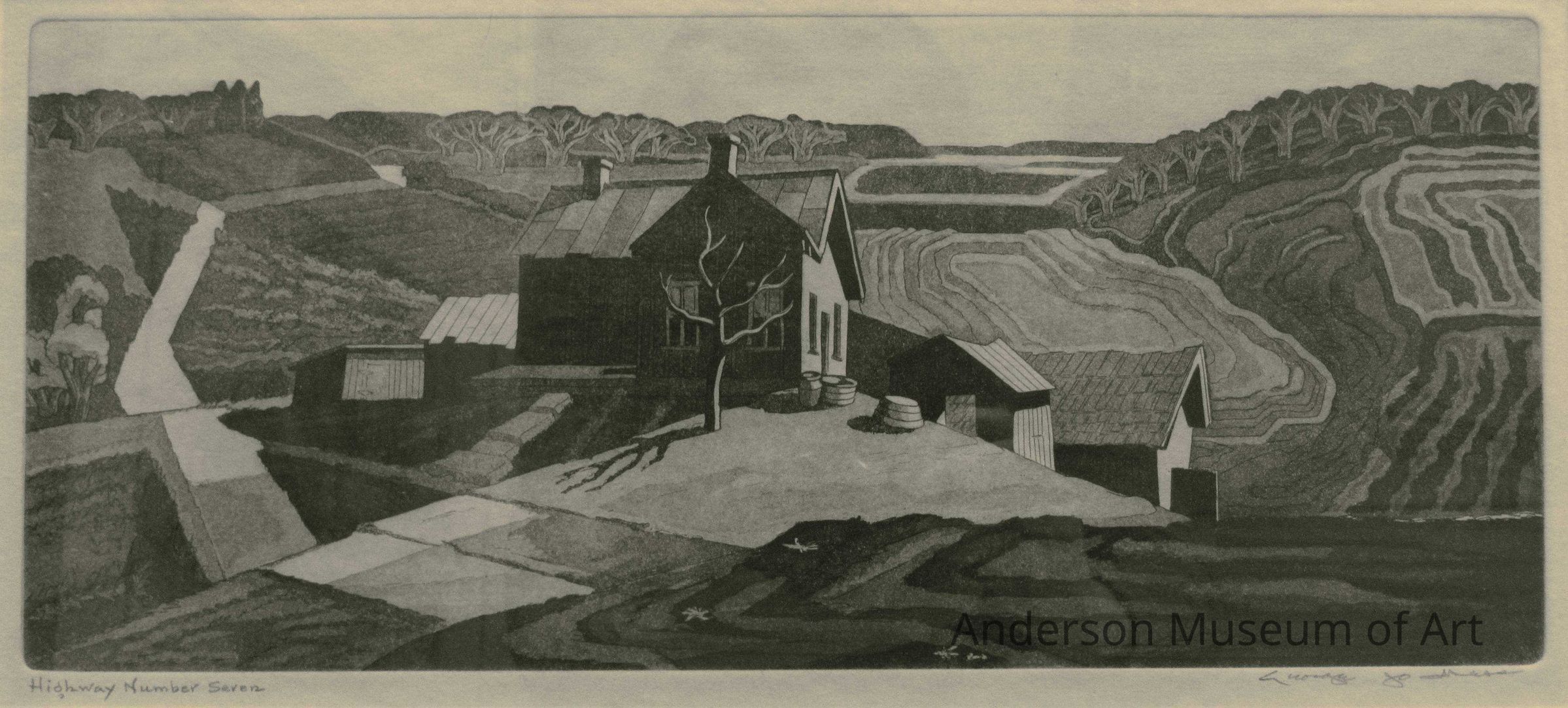 Etching and aquatint in black ink on off-white paper depicting a farmhouse in the center on a slight hill surrounded by out buildings. A lone leafless tree stands before the house to the right of this tree are a milk can and two wood tubs. Cultivated fields are around the buildings on all sides, and rows of trees are in the background with hills and sky in the distance. A very angular road stats in the left foreground and extends into the background. The print is titled in pencil in the lower left corner below the image "Highway Number Seven" and is signed in the right corner below the image "George Jo Mess." The print is framed in a simple thin wooden moulding painted white.Collection