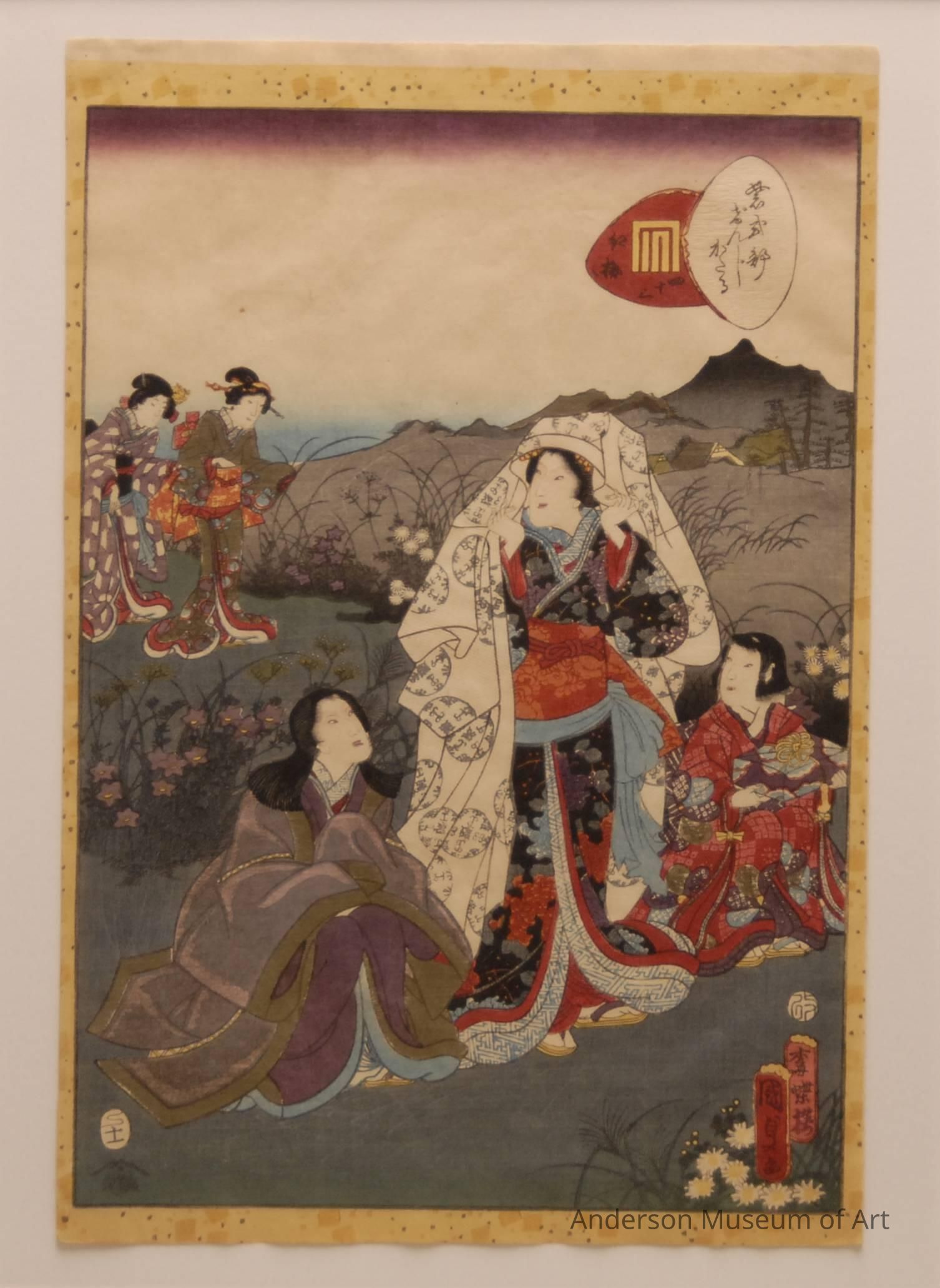 Color woodcut on medium-weight rice paper. Image depicts figures bearing gifts in a landscape (possibly a wedding). In the foreground are three figures on a diagonal. The first (to the left) appears to be a man in violet robes who is kneeling looking up to the second figure, which is a woman standing in a floral patterned robe of red and black. She is holding a veil or cloak over her head which is white with a ciruclar pattern upon it. The veil is embossed with a fine "screen like" pattern. The third figure is kneeling in a red patterned robe and is holding a wrapped gift. In the middle ground on the left