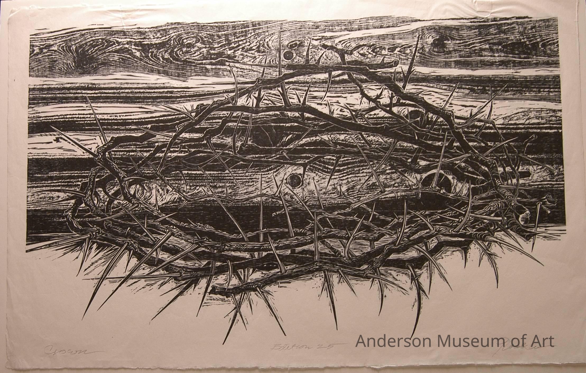 Black and white image of thorny bushes that appear to be in the shape of a crown. There appears to be a bare and aged wooden wall with knotholes UC, UR, LC, RC, and RL behind the crown. The piece is printed on this rice paper. LL, below picture plane, is written in pencil "Crown;" right of this and also in pencil is written "Edition 25;" and right of this in pencil is written "Gloeckler." The throne in the picture is enormous and menacing.Collection