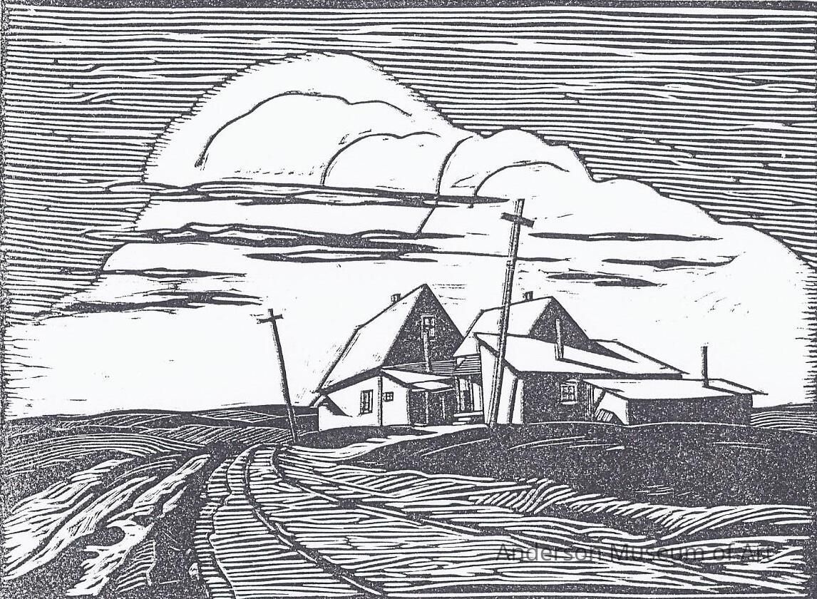 Crisp image of a rural farm scene. Appears to be a rear view of the farm seen in 89.6.5. The land surrounding the farm is rolling farmland, typical in American Midwest. There appears to be a road (possibly a railroad) that begins one-third of the way across the lower picture plane and extends to the far right-hand corner. Its vanishing point is approx. one-third of the way up the picture from the bottom and approx one-third of the way across the picture plane, beginning from the lefthand side. There is an enormous cloud in the distance, looming over the horizon. The farmhouse and what appears to be two outbuildings are in the foreground in the lower right quarter of the picture. As in 89.6.5, the farm building shares its space with two telephone poles, the one on the left-leaning left and the one on the right-leaning right. Same image as1989.6.6.Acquisition