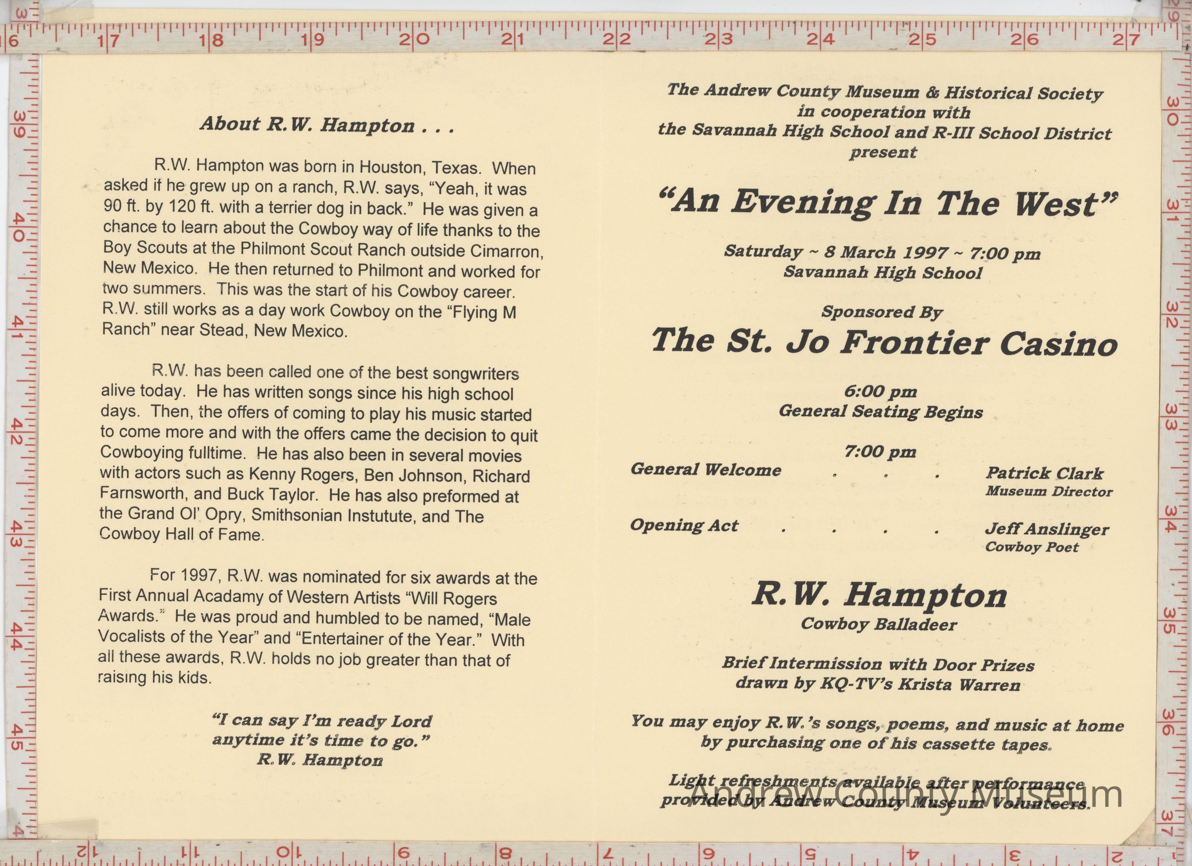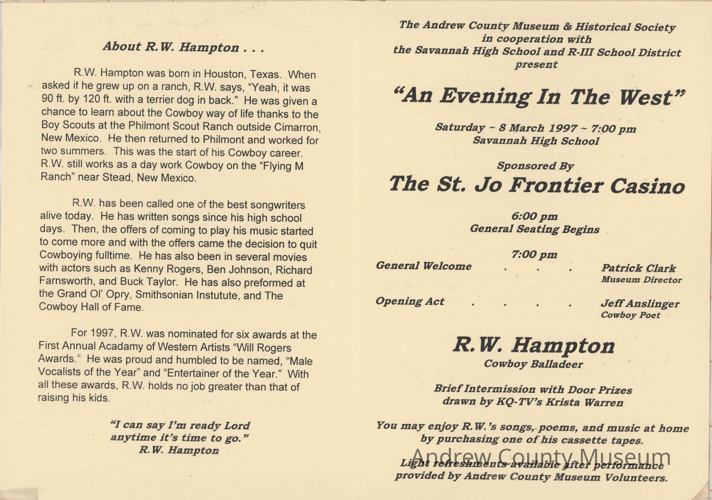 These programs were given to guests to the first "An Evening In The West" event in 1997. It brought much attention that it the event was scheduled annually until 2007. R.W. Hampton was one of the attractions to the event along with Jeff Anslinger and others. The purpose of the event was to benefit the Andrew County Museum to raise funds. The event was held at the gymnasium of Savannah High School where performers would take the stage and perform for the audience in attendance. This event brought not just Andrew County together, but it brought together communities from other counties including Buchanan.Exhibitions