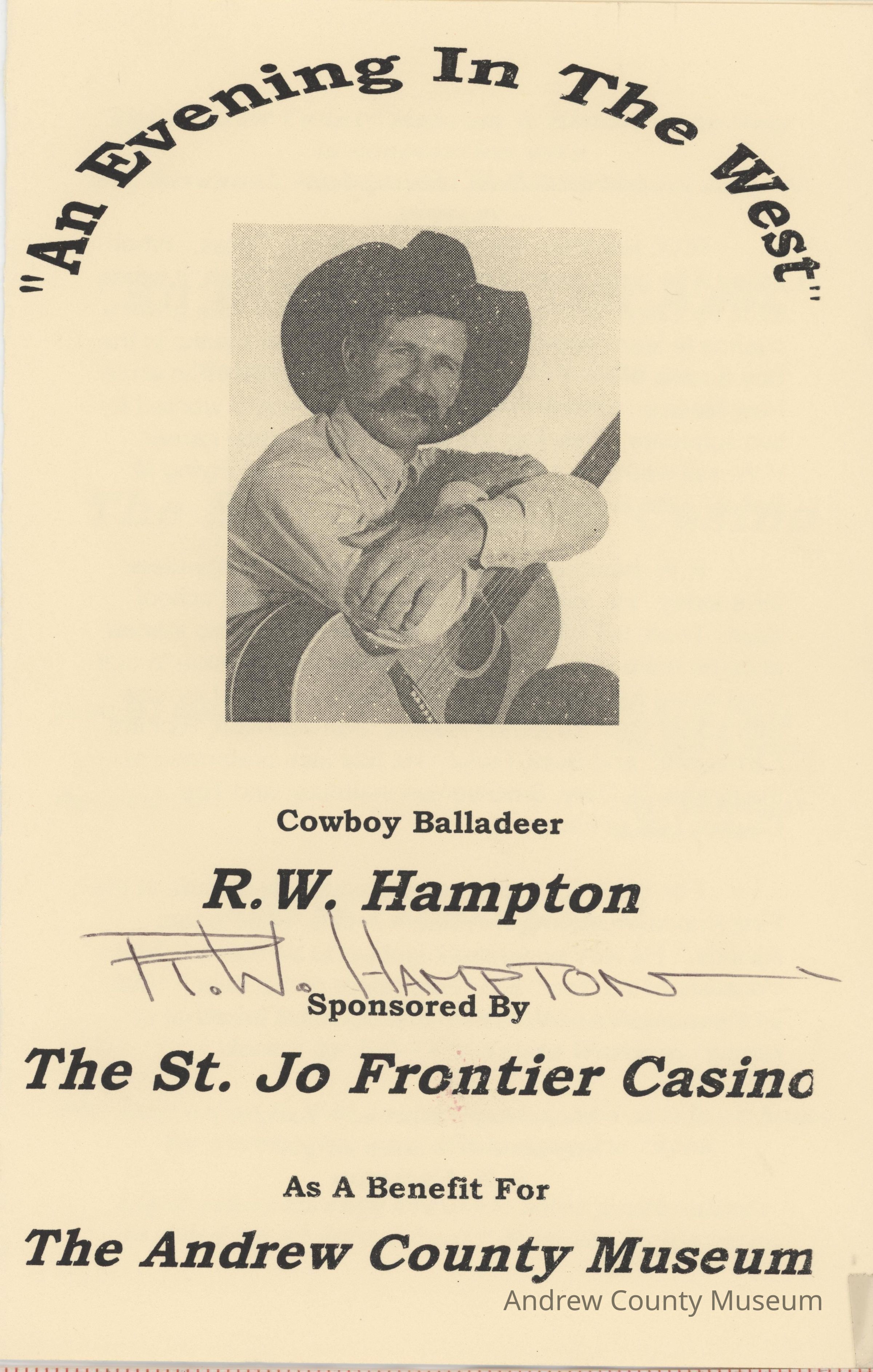 The light beige colored program of 1997, "An Evening in the West," features R.W. Hampton with a photograph of him in his cowboy hat and a collared shirt. His guitar is in his lap, with his arms crossed on top of the guitar. A copy of his signature on the program below his photograph and his name with a “Sponsored by The St. Jo Frontier Casino." The first page of the program is an "about page" by R.W. Hampton. Another page of the festivities that are held at Savannah High School, sponsored by St. Jo Frontier Casino, with an event schedule. The last page gives a special thanks page for those who contributed to the event ranging from companies from both Andrew and Buchanan counties along with individuals.Lexicon