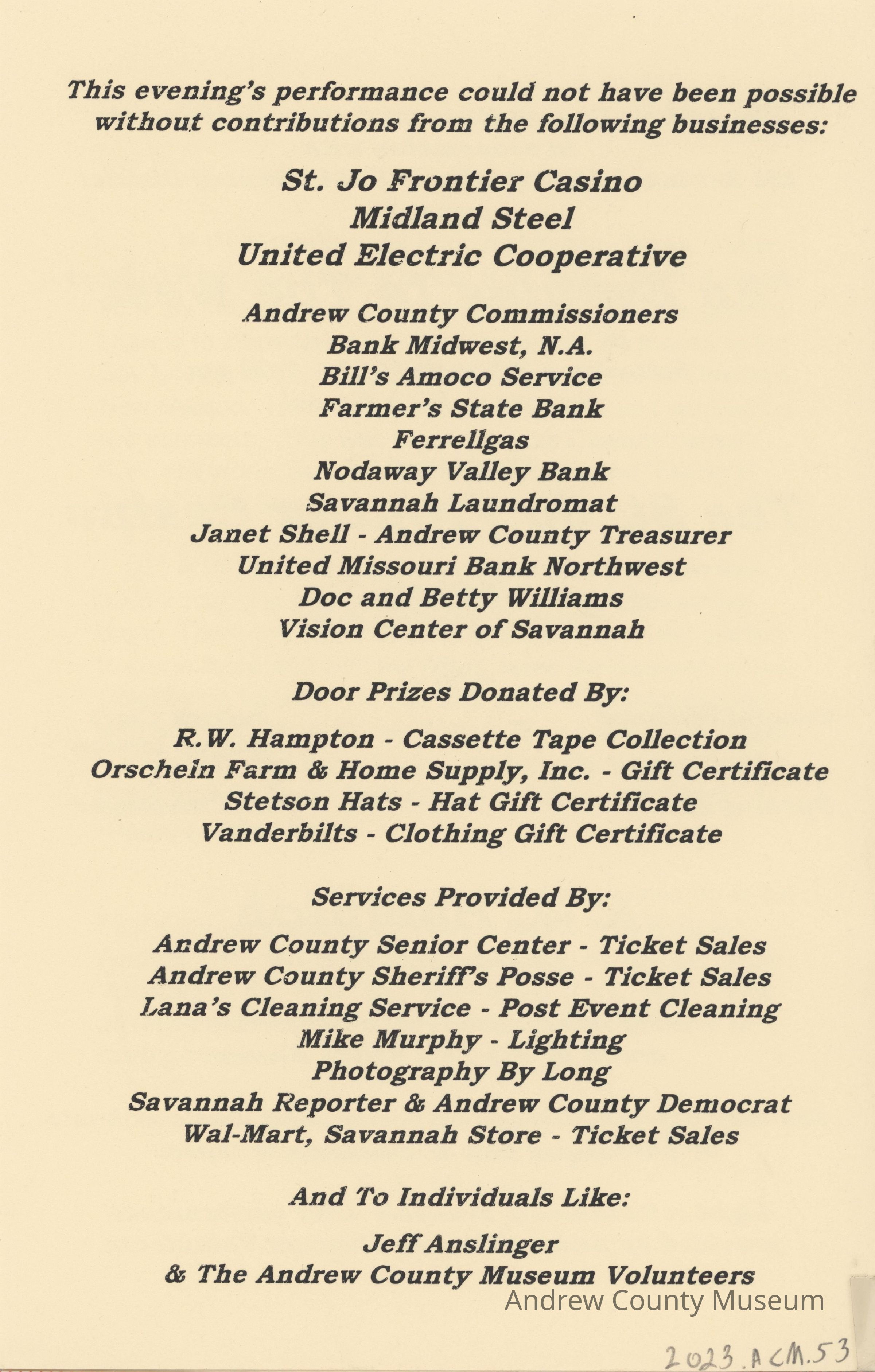 These programs were given to guests at the first "An Evening in The West" event in 1997. R.W. Hampton was one of the attractions at the event, along with Jeff Anslinger and others. The event's mission was to help raise funds for the Andrew County Museum. The event was held at the gymnasium of Savannah High School, where performers would take the stage and perform for the audience in attendance. This event brought not just Andrew County together; it brought communities from other counties, including Buchanan, together.