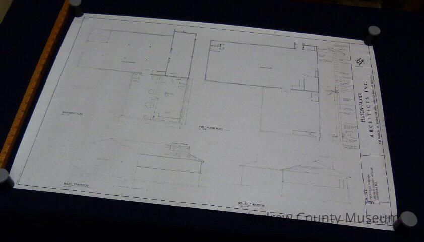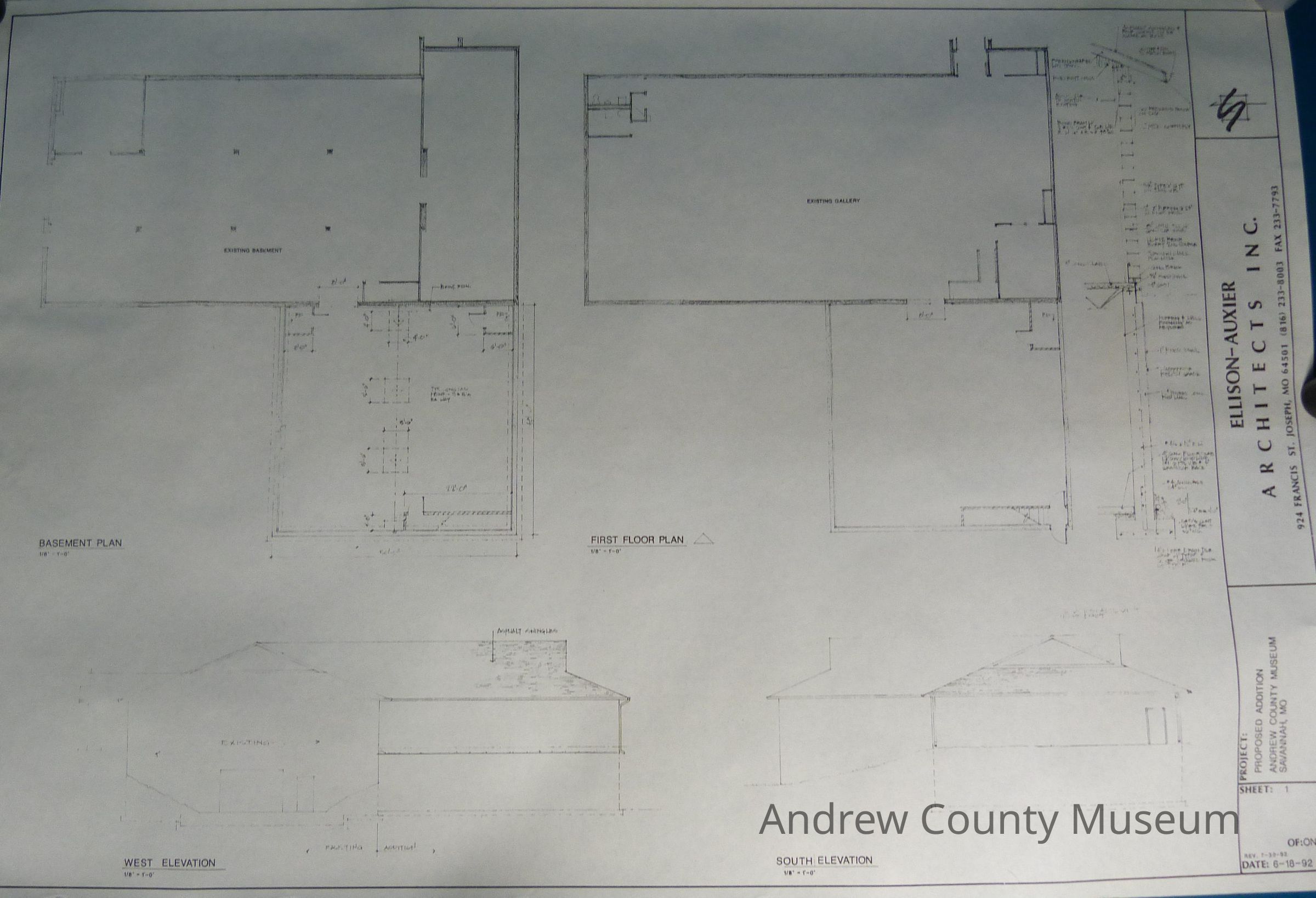 Proposed Addition to Andrew County Museum. Black and white, reviewed 7-30-92 and dated 6-18-92. By the Ellison-Auxier Architects Inc. The blueprint outlines the Museum labeling, at the time, the already existing portions of the museum and including the planned addition to the museum. This added addition would become the Duncan Gallery. The blueprint includes a top-down view of inside the museum and an outside side view of the museum showing what the museum will look like with the addition.Lexicon