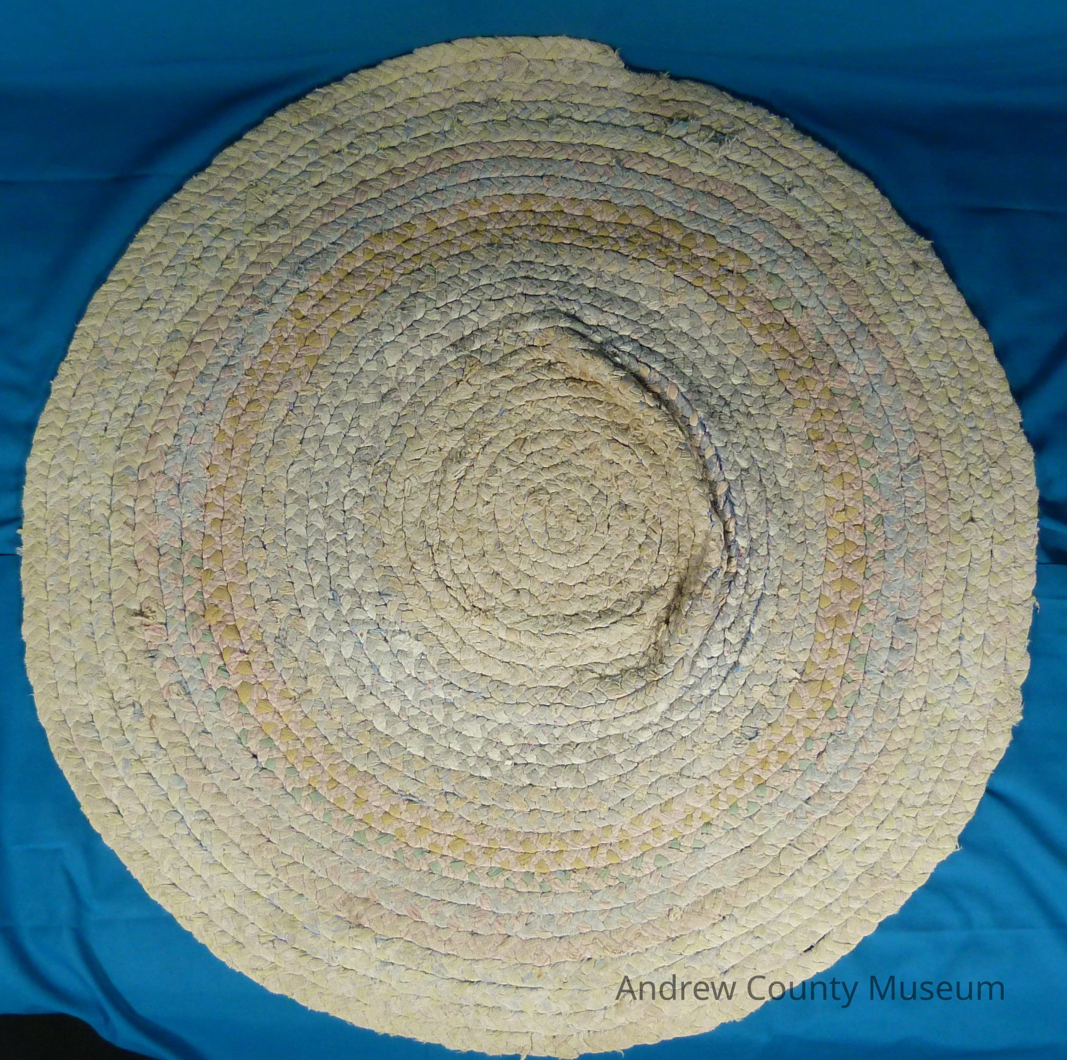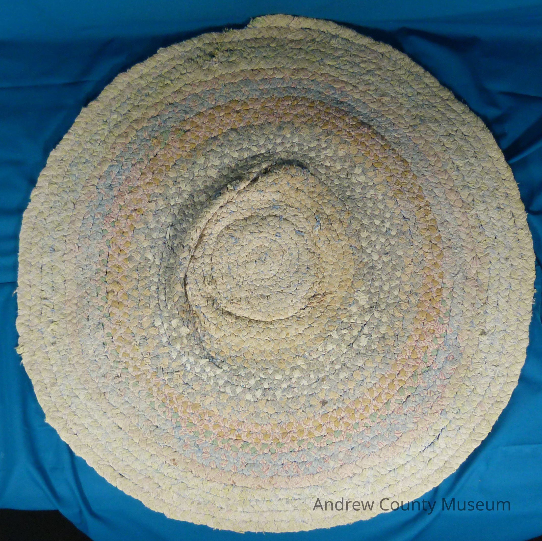 The rug is circular and handmade. The rug is multicolored and made up of pastel colors. There is a distinct pattern used in the weaving of the fabrics. The outer edge of the rug ends abruptly. The rug starting from the edge and following it to the center creates a swirl that goes from the outer edge to the center. The front and back are hard to tell apart, but on the back side stitching and thread can be easily seen to show which side would have to face up and which would be on the floor.