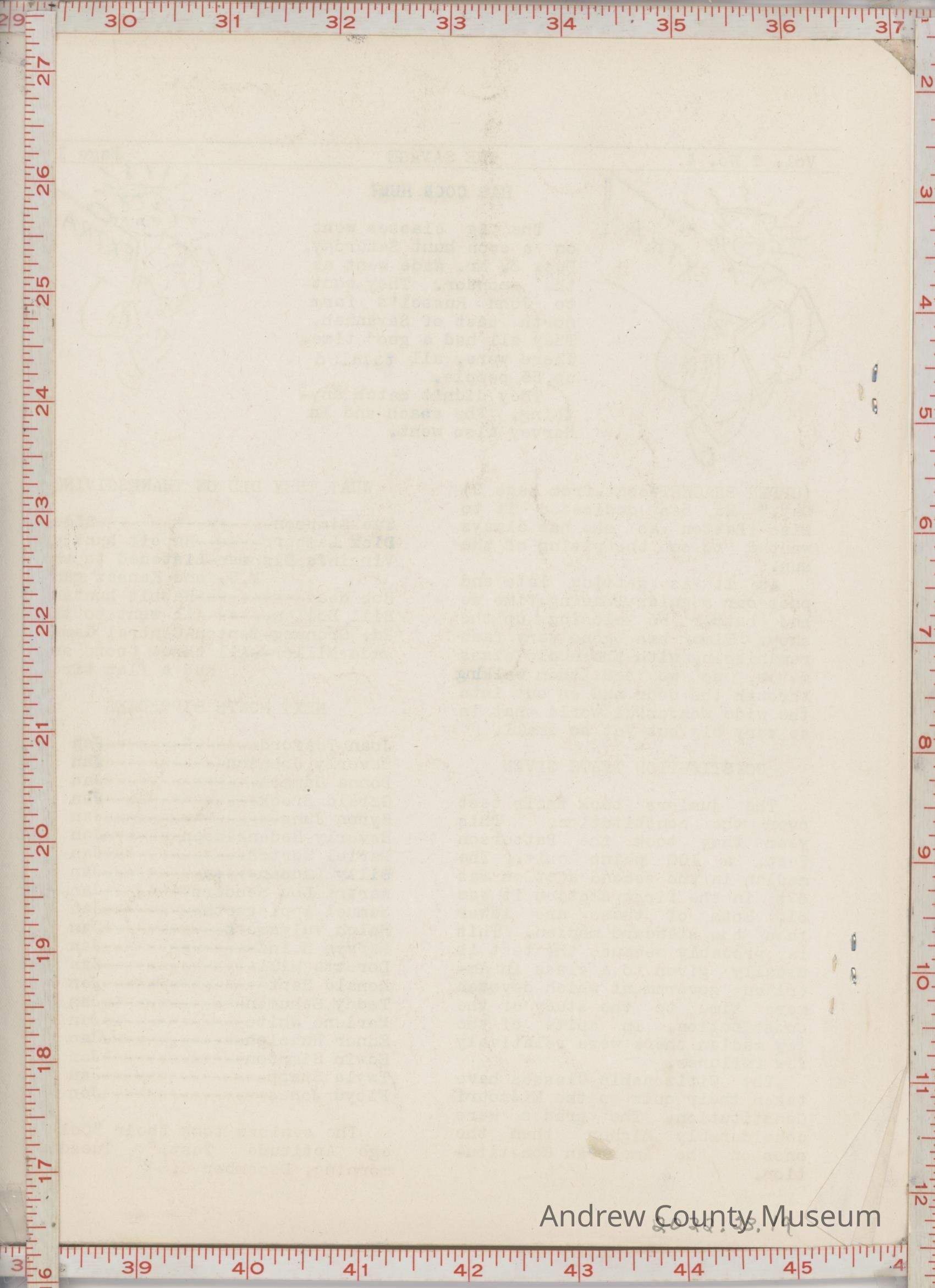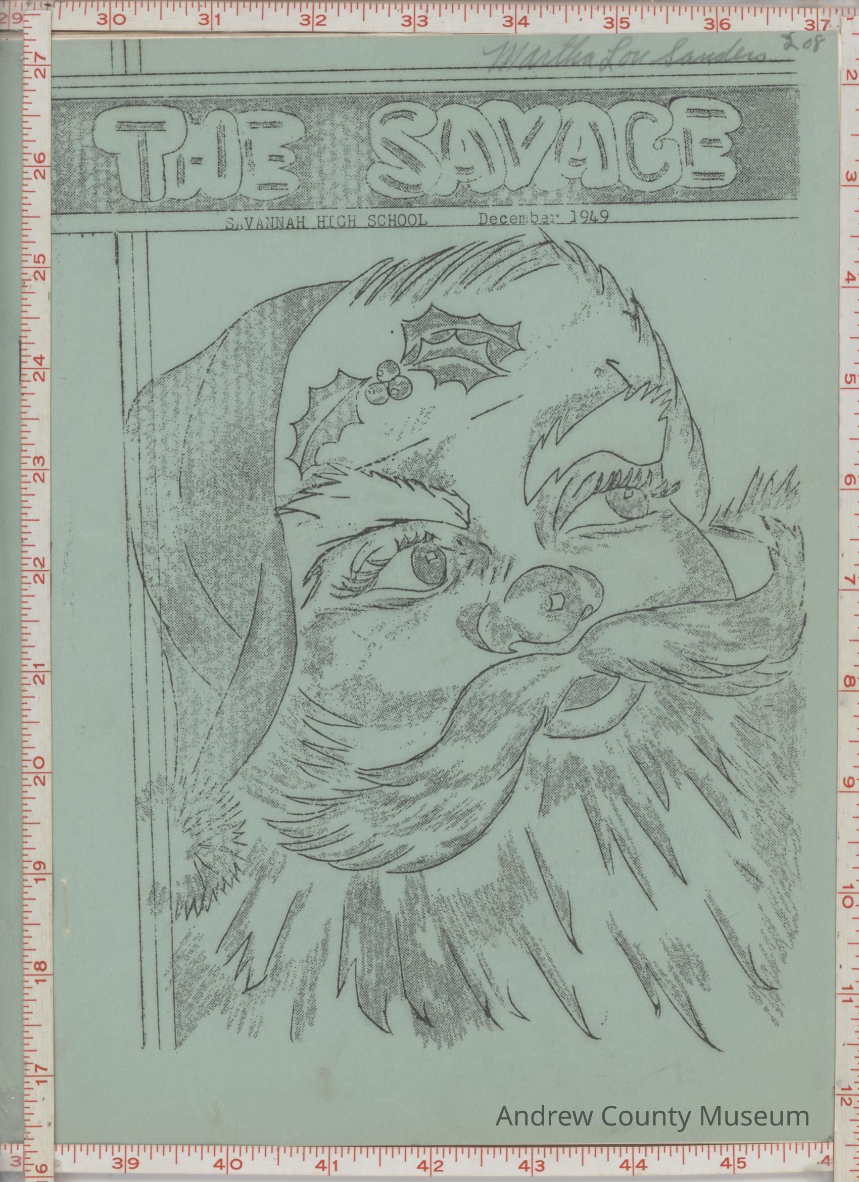 "The Savage" published by Savannah High School , December 1949 with a green construction paper cover with a hand drawn sketch of the face of Santa Clause. There are 18 numbered pages inside with articles and illustrations created by students printed in black on cream colored paper. The cover and pages are stapled together to form a booklet, on the left edge with two staples. In pencil on the top edge center and moving to the right is handwritten, "Martha Lou Sanders 208."Lexicon