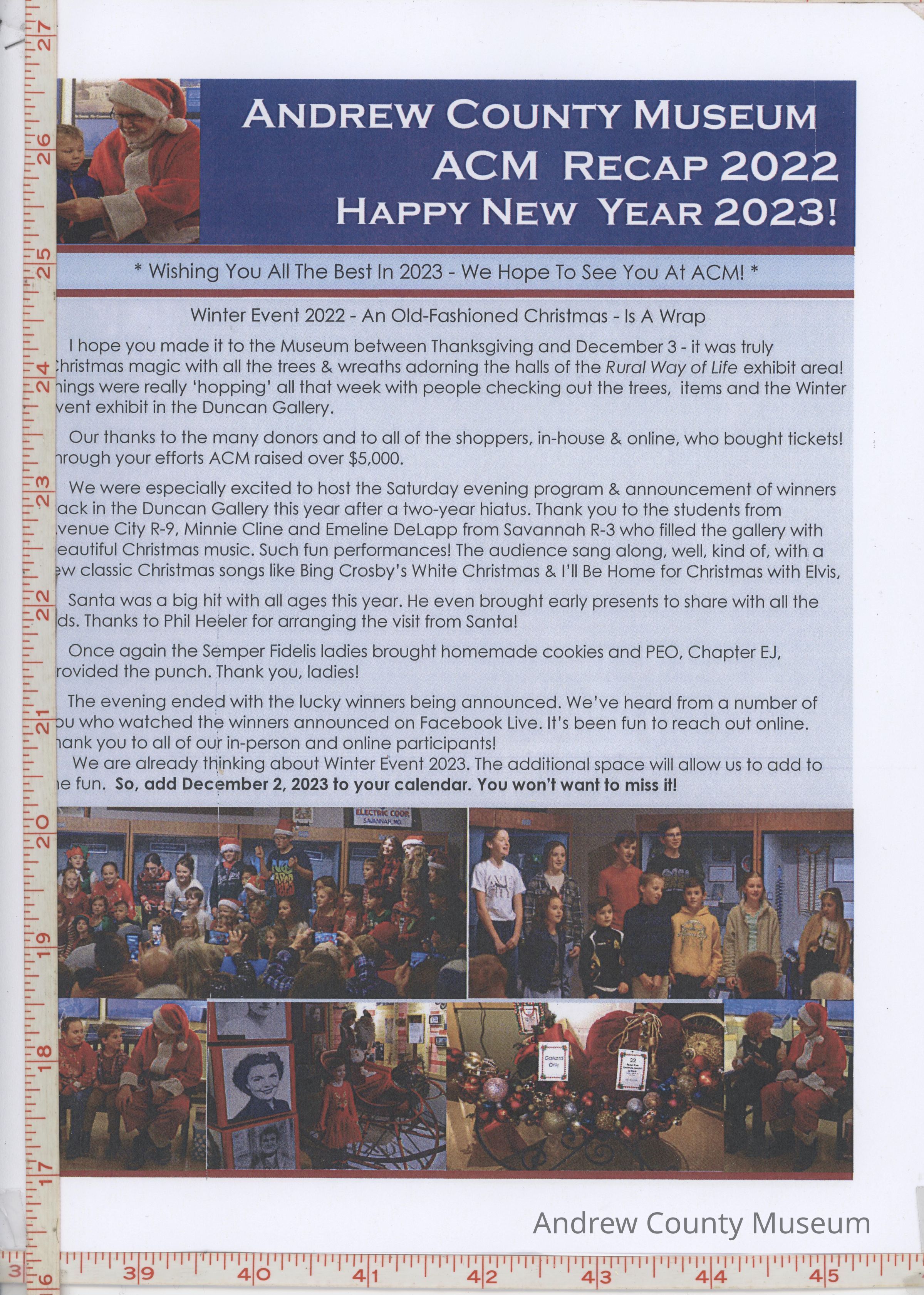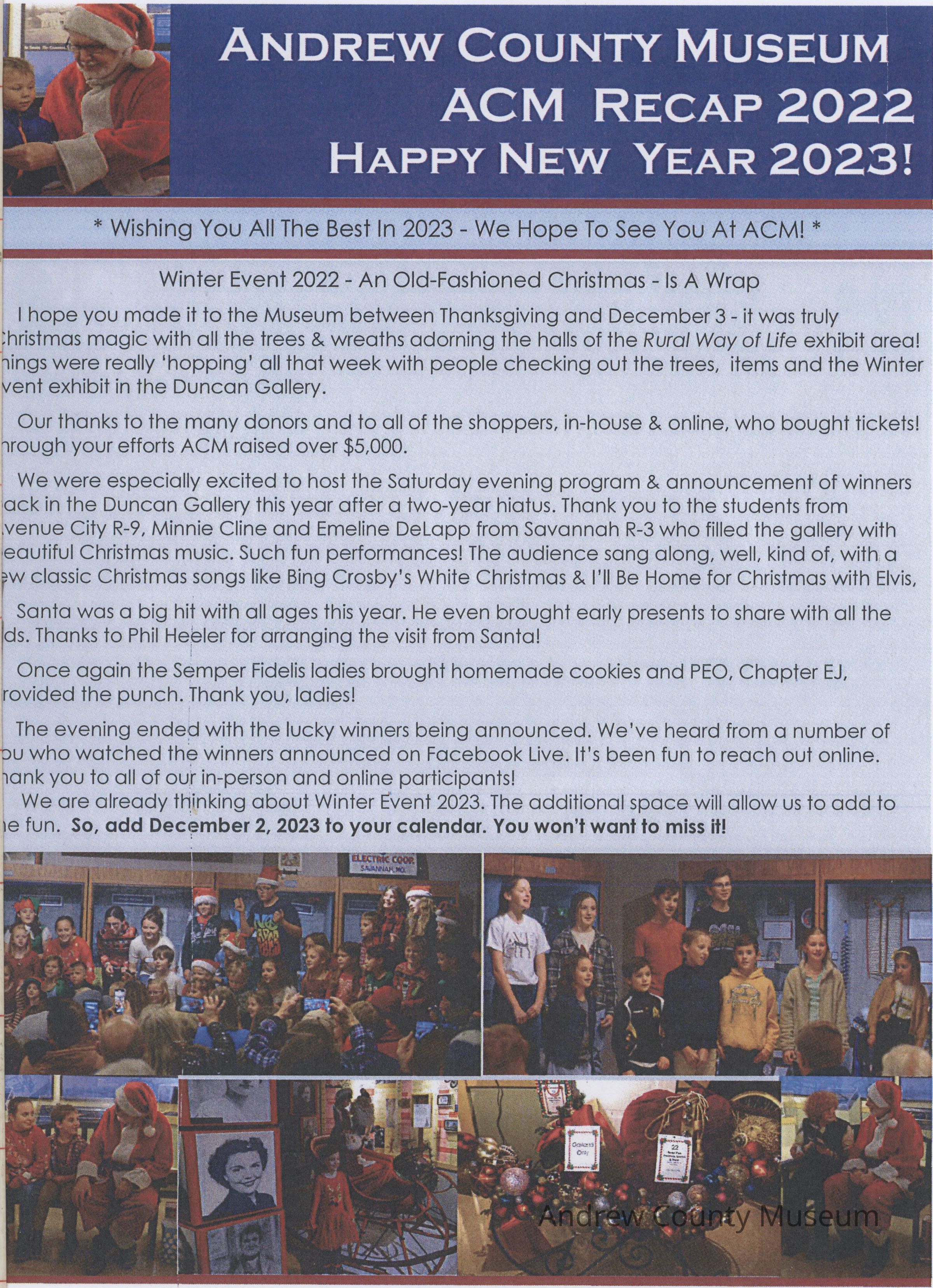 Recaps the events that occurred in 2022 at the Andrew County Museum. The newsletter also highlights the Winter Event in December 2022. The newsletter rings in the new year and encourages guests to visit to see what else is happening at the museum in the upcoming year.