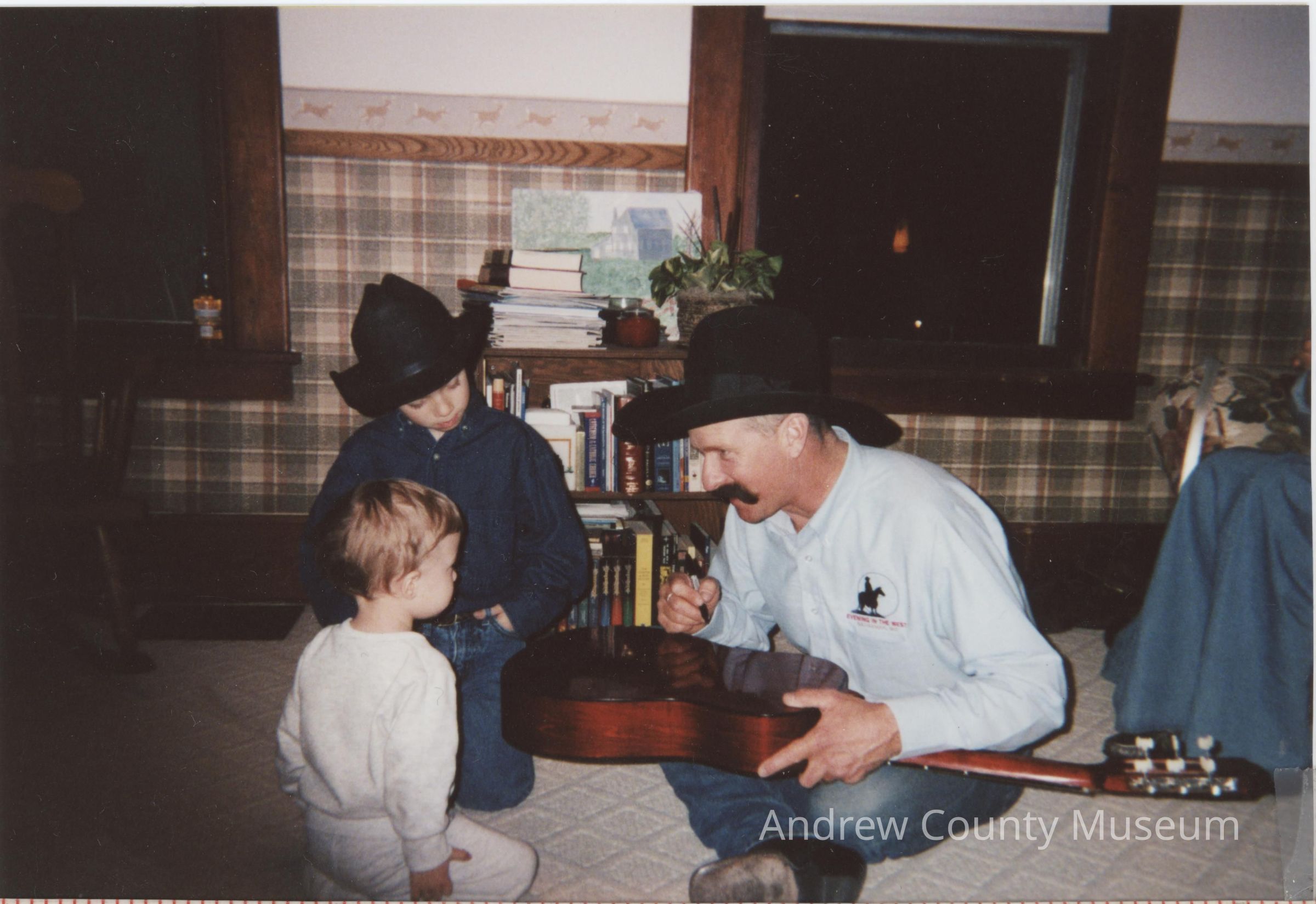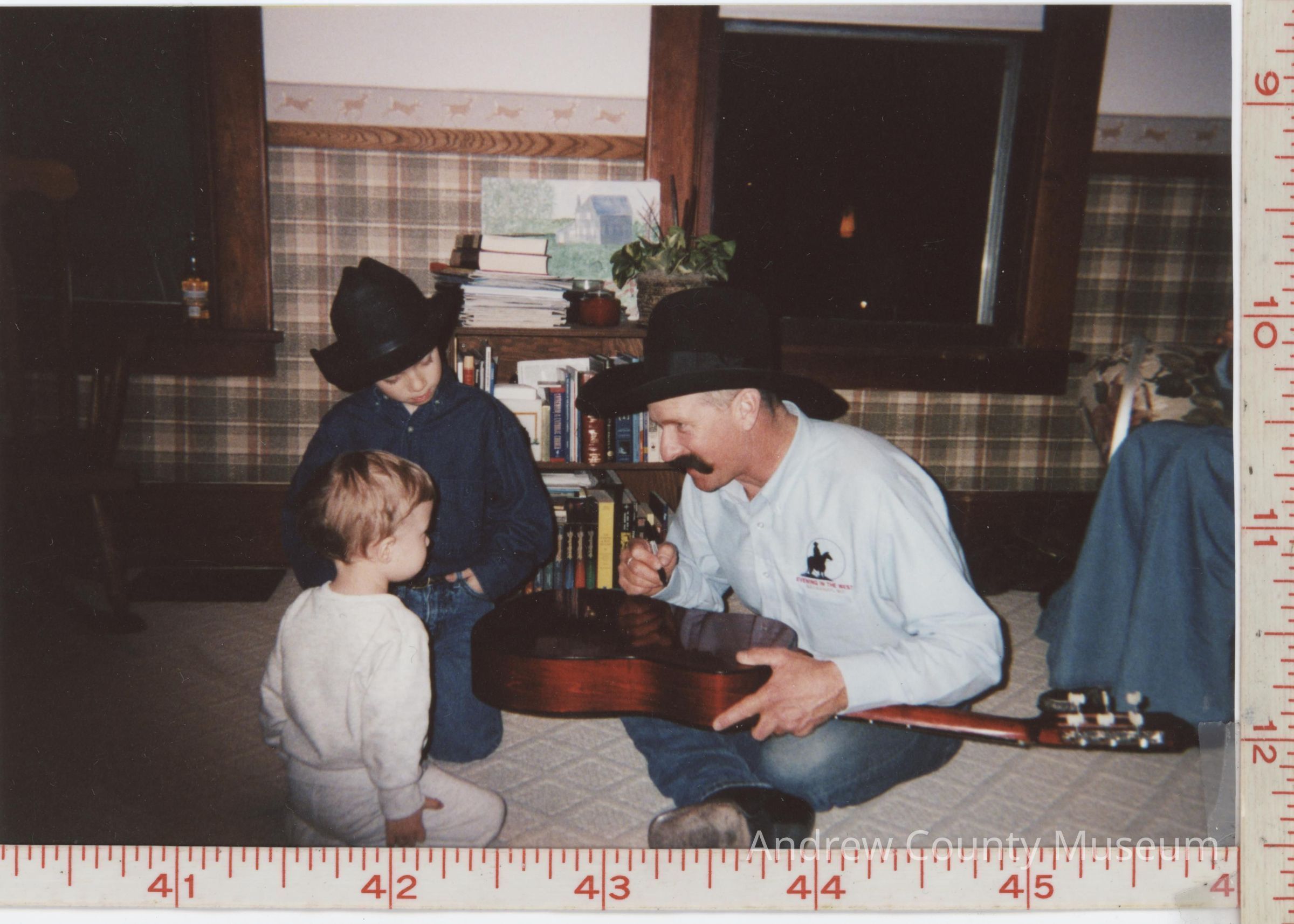 This is a photograph of R.W. Hampton sitting in someone's living room signing a guitar. He is sitting on the floor with two children in front of a small bookcase. The carpet is white with a crisscross pattern. It looks like someone in a skirt is sitting in the chair behind him. It is nighttime outside because the windows are dark. The photo has a lot of shadow to it. R.W. and one of the children are dressed in a black cowboy hat, a button-down shirt, and jeans. The second child looks to be dressed in pajamas. R.W. in the photo is looking directly at the smaller child sitting in front of him and the older child is watching R.W. sign the guitar.