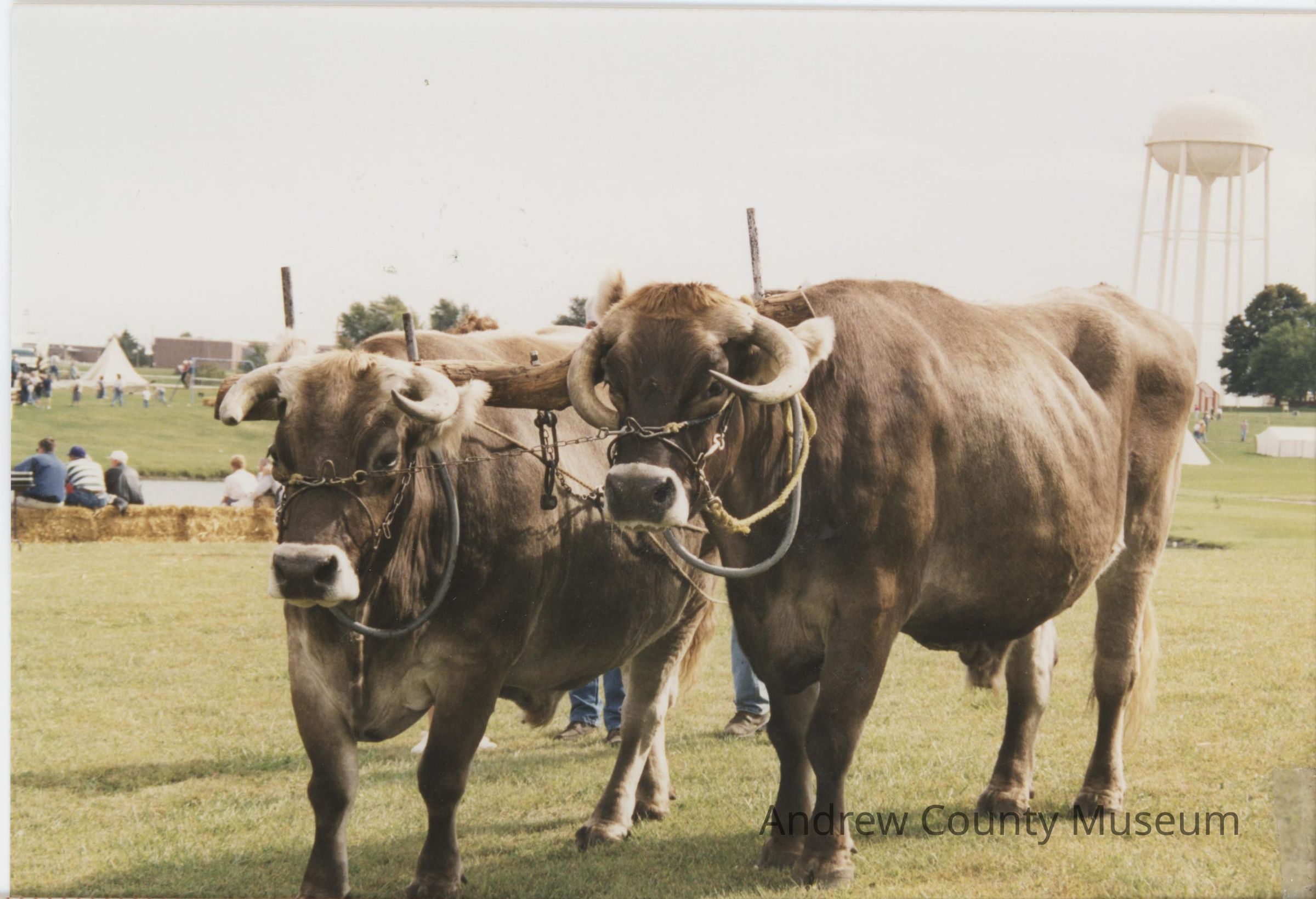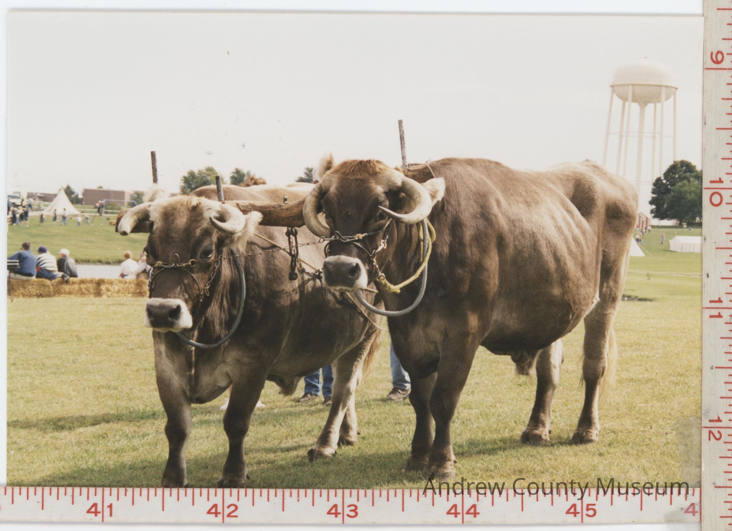 Photographed here are two oxen in the center during the Platte Purchase Days at Duncan Park. The ox on the right-hand side has one horn lower than the other. The oxen are strapped together as if they were ready to pull a plow. There is a wooden beam setting on the oxen. Underneath, the oxen can be seen with human legs with jeans, but the rest of the people are behind the oxen. On the top right corner, the Savannah water tower is seen, along with a red and white building underneath the tower. To the right are a couple of trees in front of the tower. On the left-hand side, in the distance, there are a couple of buildings, this being where Savannah High School is located. In front of the building, but still in the background, can be seen a Teepee and a crowd walking by. Next is a pond with people sitting on a row of hay bales. On the back, there is some tape and part of a Velcro patch to help the photo hang for a display.Photograph Details