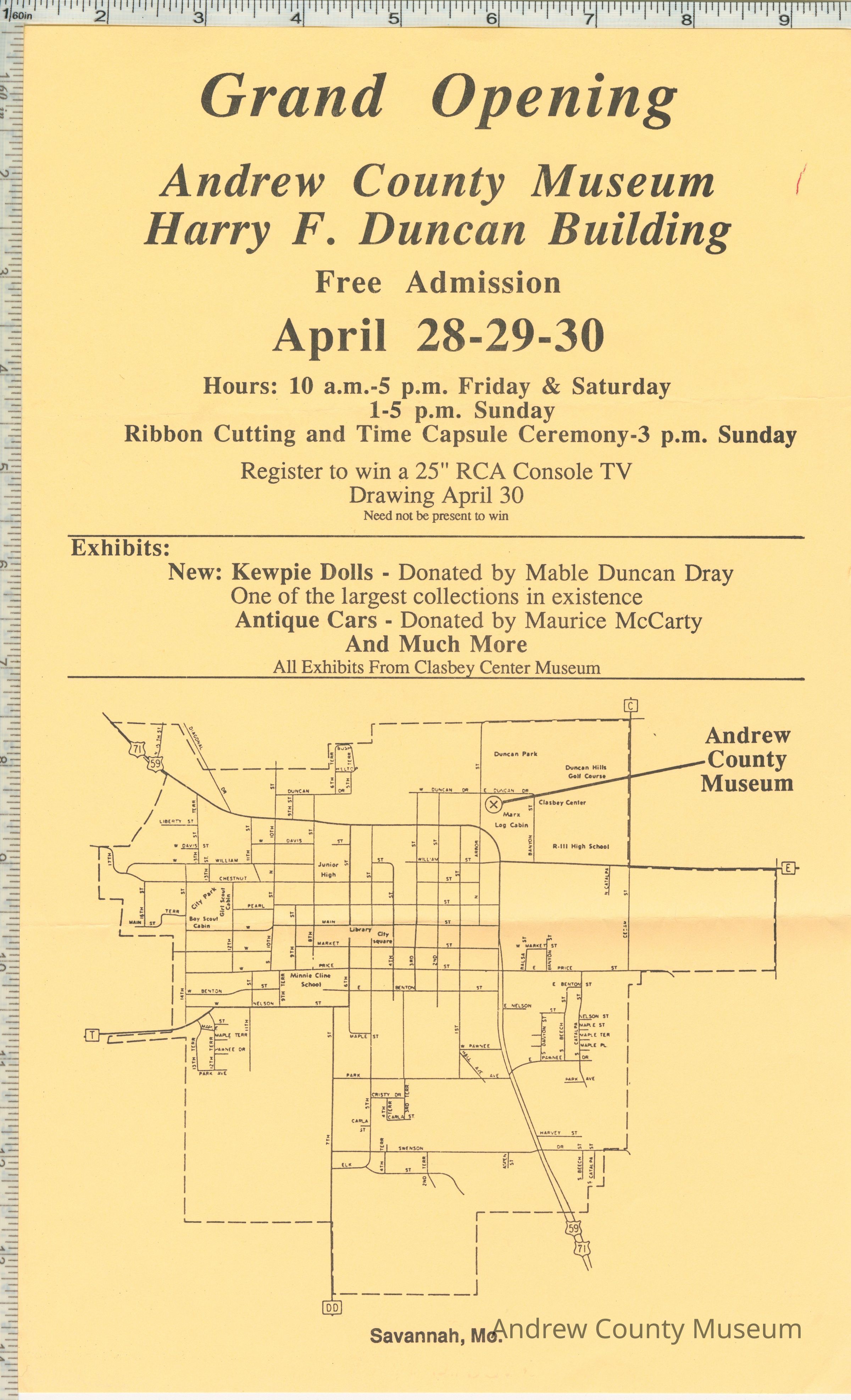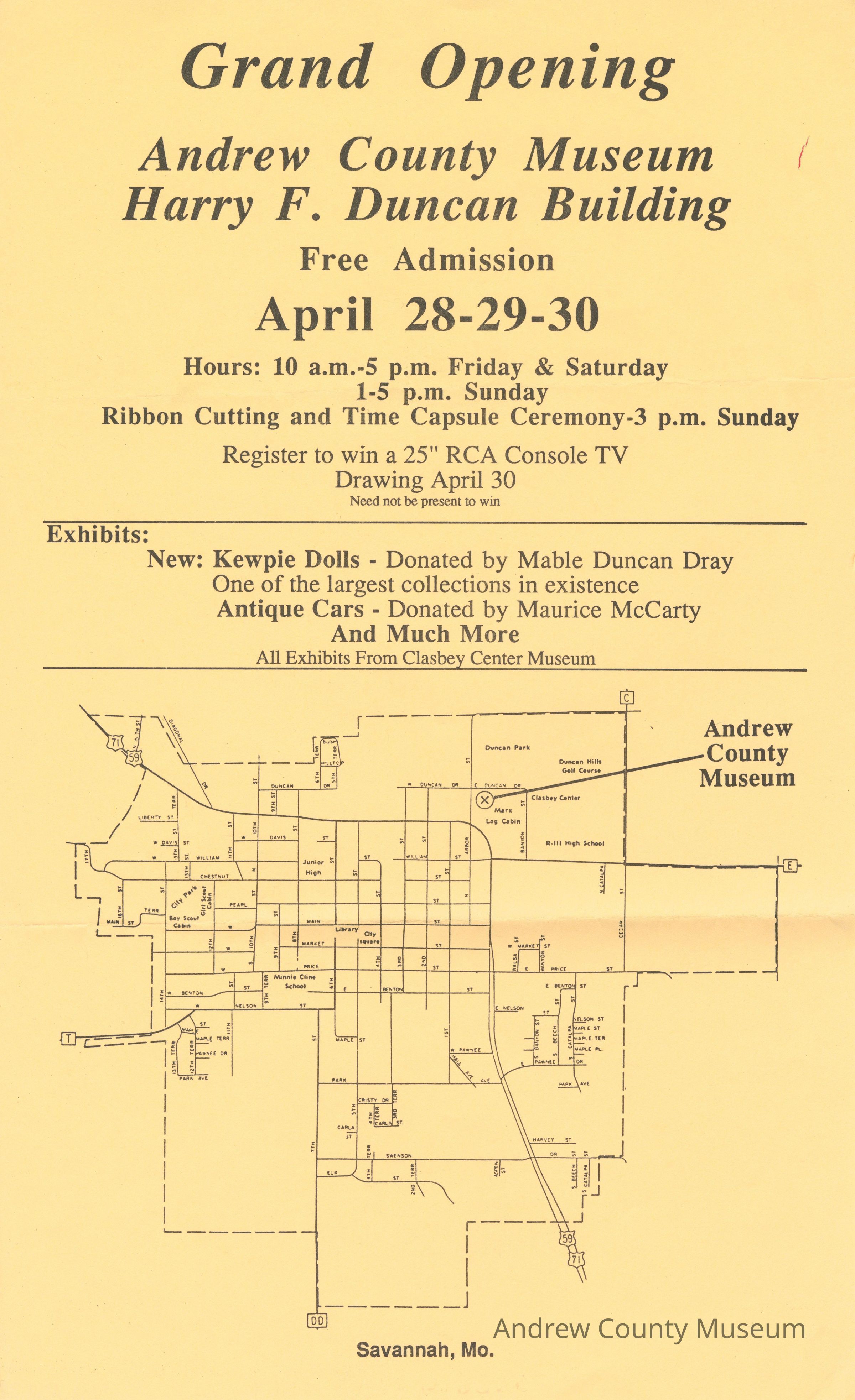 This is a poster advertising the grand opening of the Andrew County Museum Harry F. Duncan Building.Lexicon