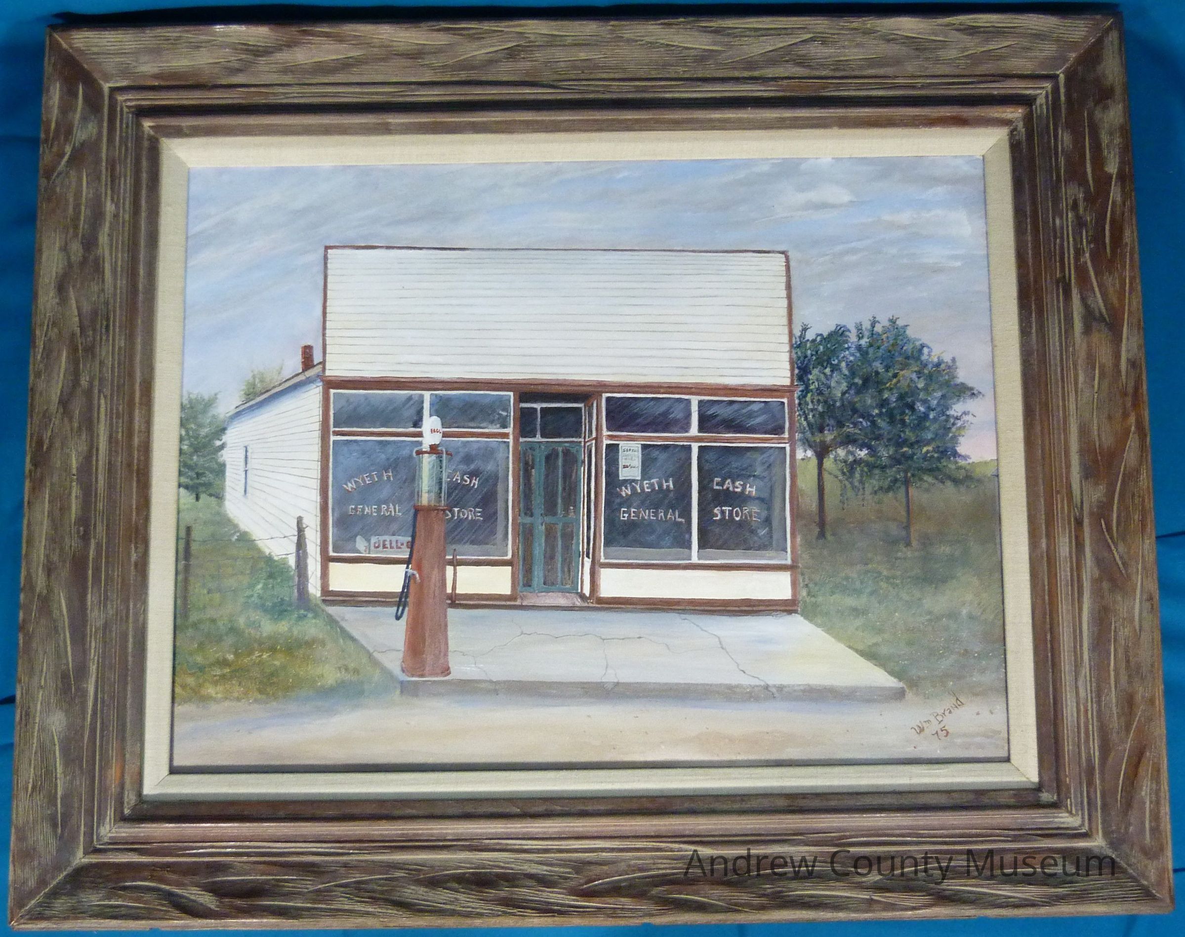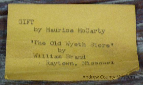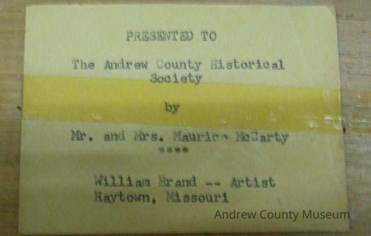 that has "PRESENTED TO/The Andrew County Historical/Society/by/Mr. and Mrs. Maurice McCarty/****William Brand -- Artist/Raytown, Missouri.Language