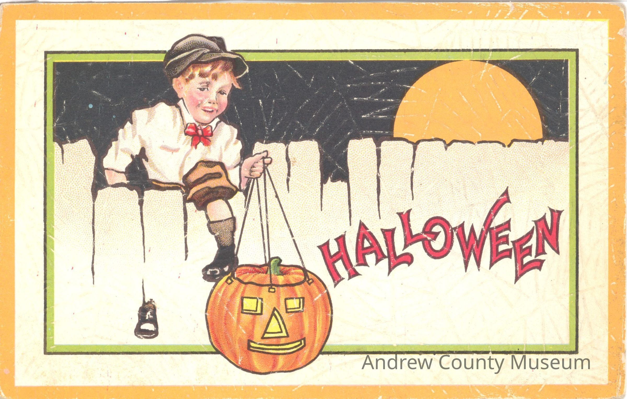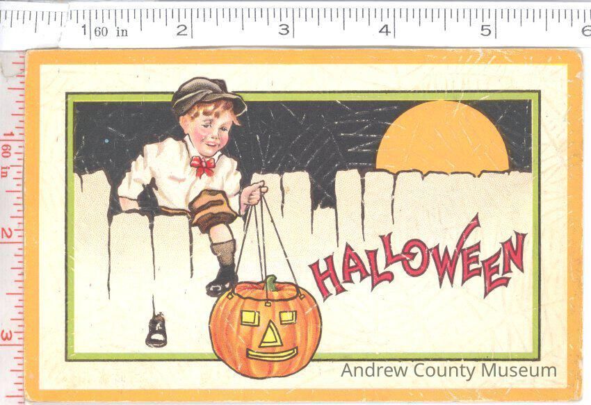 The postcard has a white background. There is an orange line border around the outer edges, then a white border, a thin black line, and a green line border. Inside the border is a black sky and yellow moon with a white fence in front of it. There is a boy in a white shirt, black cap, red bow tie, brown pants, brown socks, and black shoes. He has one arm and leg over the fence, and the viewer can see the second shoe through a crack in the fence. In his visible left hand, he is holding strings attached to a Jack-o-lantern. To the right of the boy on the fence in red is the word "Halloween." There is a raised textured spider web pattern covering the postcard. On the back center is printed "POST CARD," but nothing is written on the back of the card.Lexicon