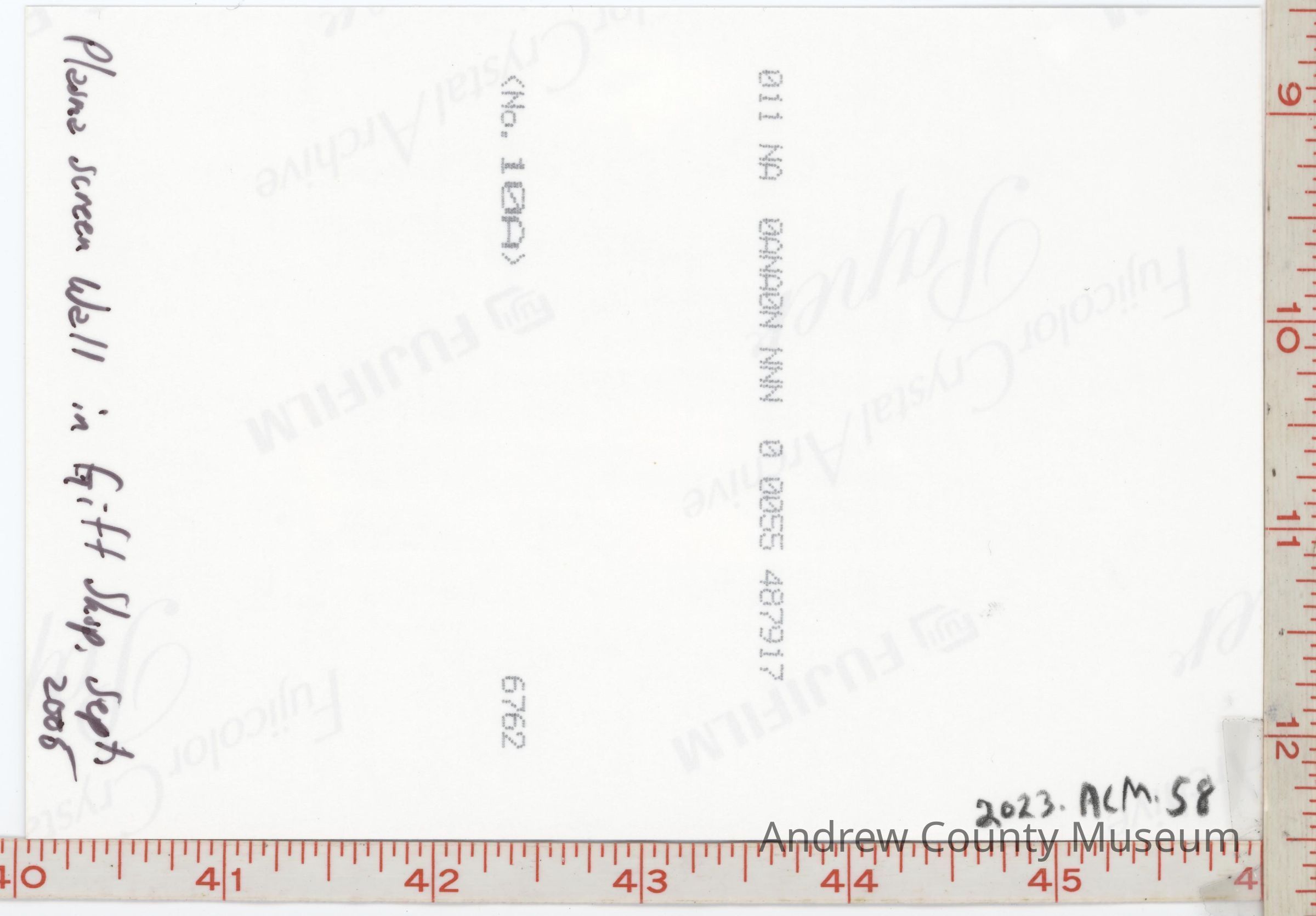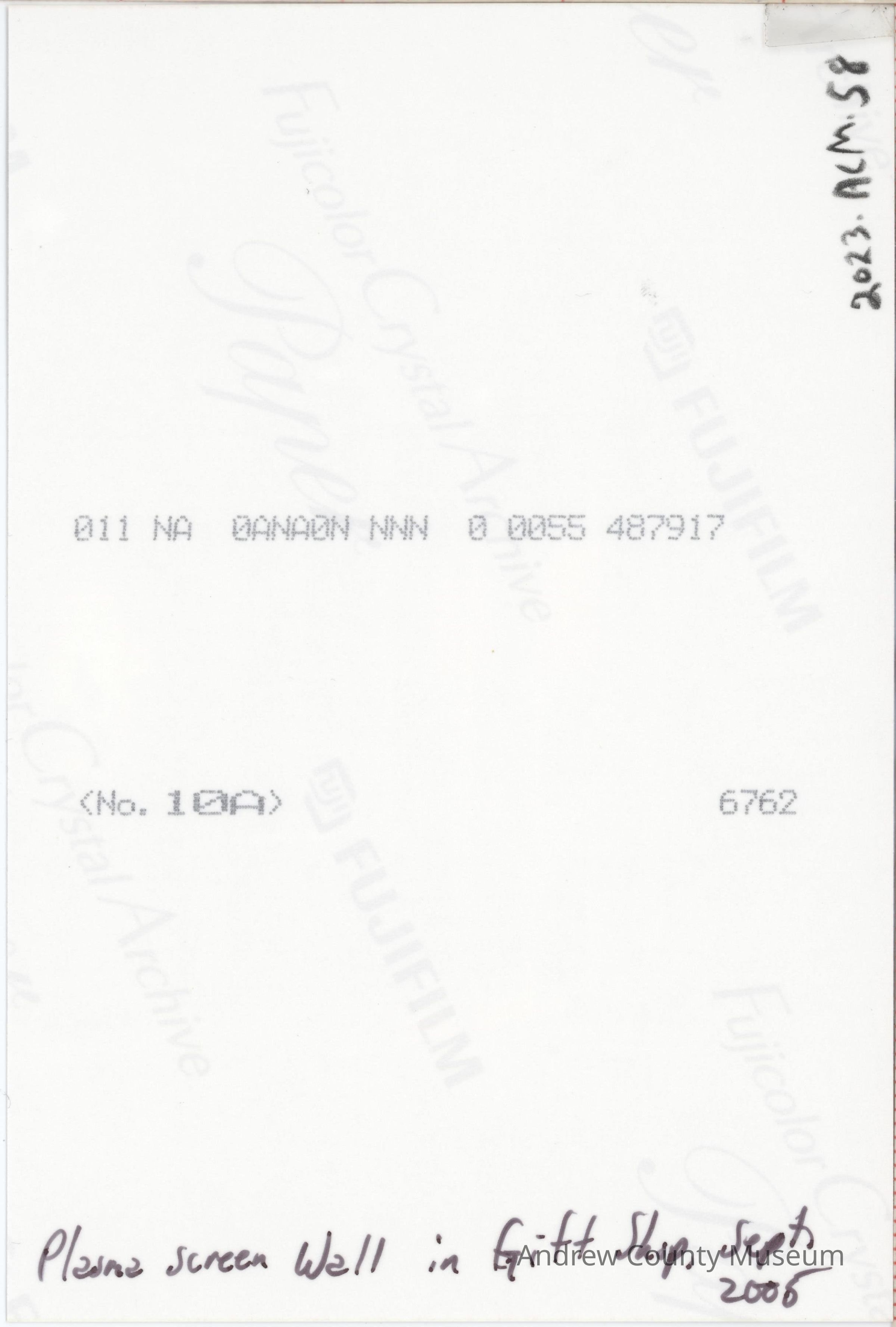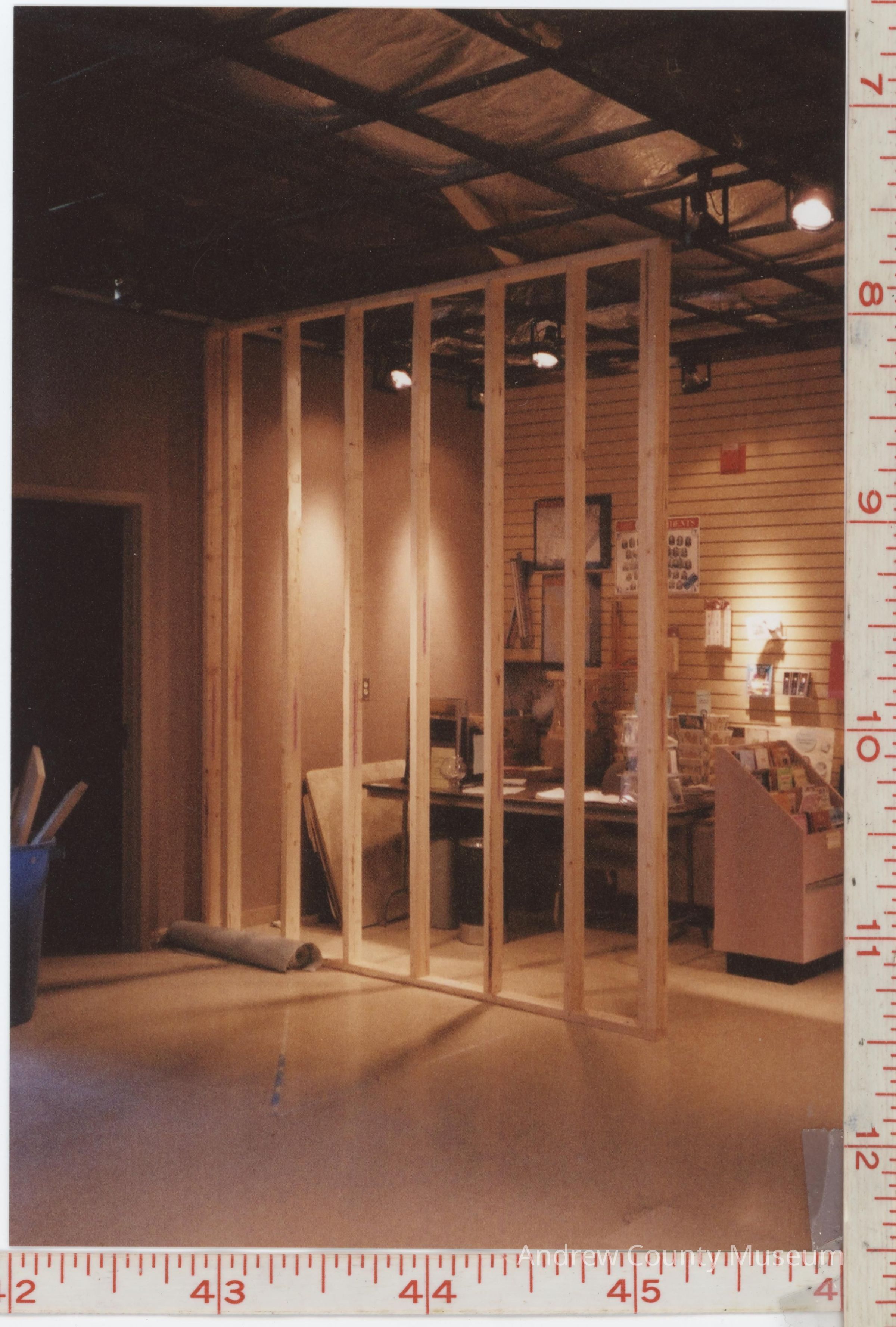 The photograph is of the orientation area of the Andrew County Museum from Sept. 2005. There is a partial wall set up. This wall will be for the Plasma screen TV at the entrance of the museum. The partial wall is only of the skeleton of the wall, with studs. On the far left of the wall is the partition, followed by studs to give the wall support. On the front end is rolled-up debris, and in front of it, on the far left of the photo, is a blue trash can with discarded wood sticking out of it. Behind the studs is the museum gift shop with items hanging on the gift shop wall, and in front of the gift shop wall is a table. To the left of the table, looking at the photograph is a rectangular shape leaning against the wall, and on the right side of the table, looking at the photograph is a gift shop display. The ceiling is incomplete, and three light fixtures are switched on, illuminating the gift shop area. On the back is a handwritten label of the photograph, “Plasma screen wall in Gift Shop. Sept. 2005.”Photograph Details