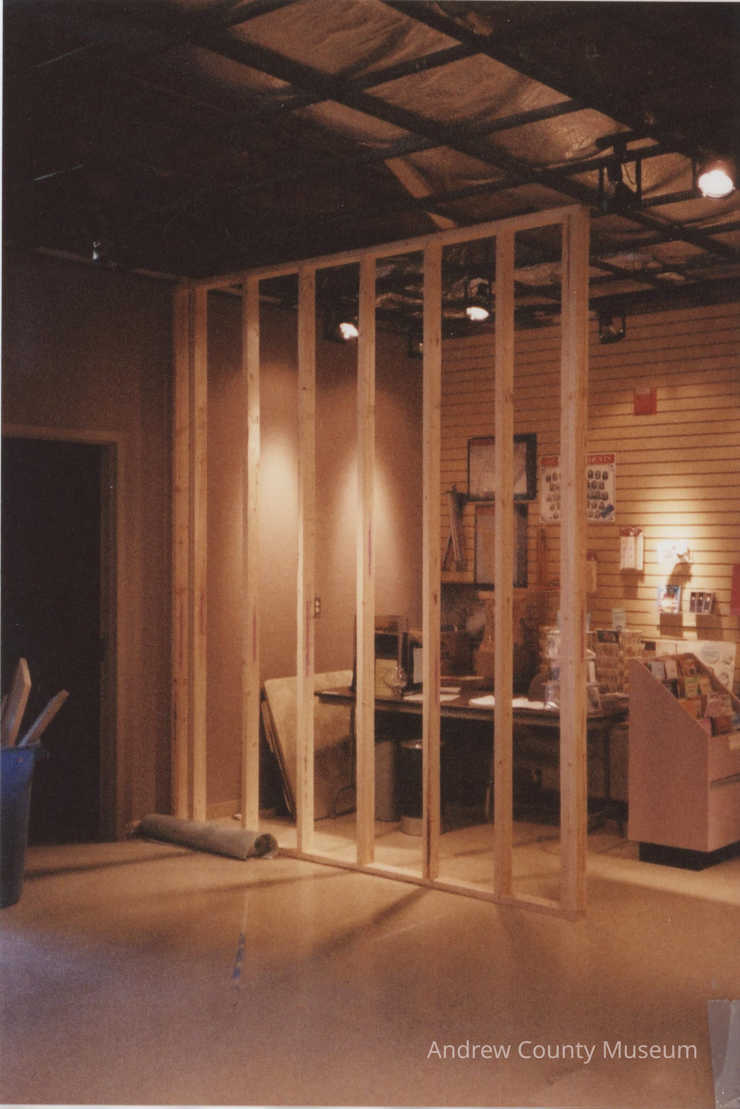 The photograph was taken during the Museum's renovation adding the Orientation Area in 2005. The Orientation Area located in the front of the museum allows guests to get familiar with the museum and to begin their journey with learning more about Andrew County's history. The Orientation Area was completed in 2006.Exhibitions