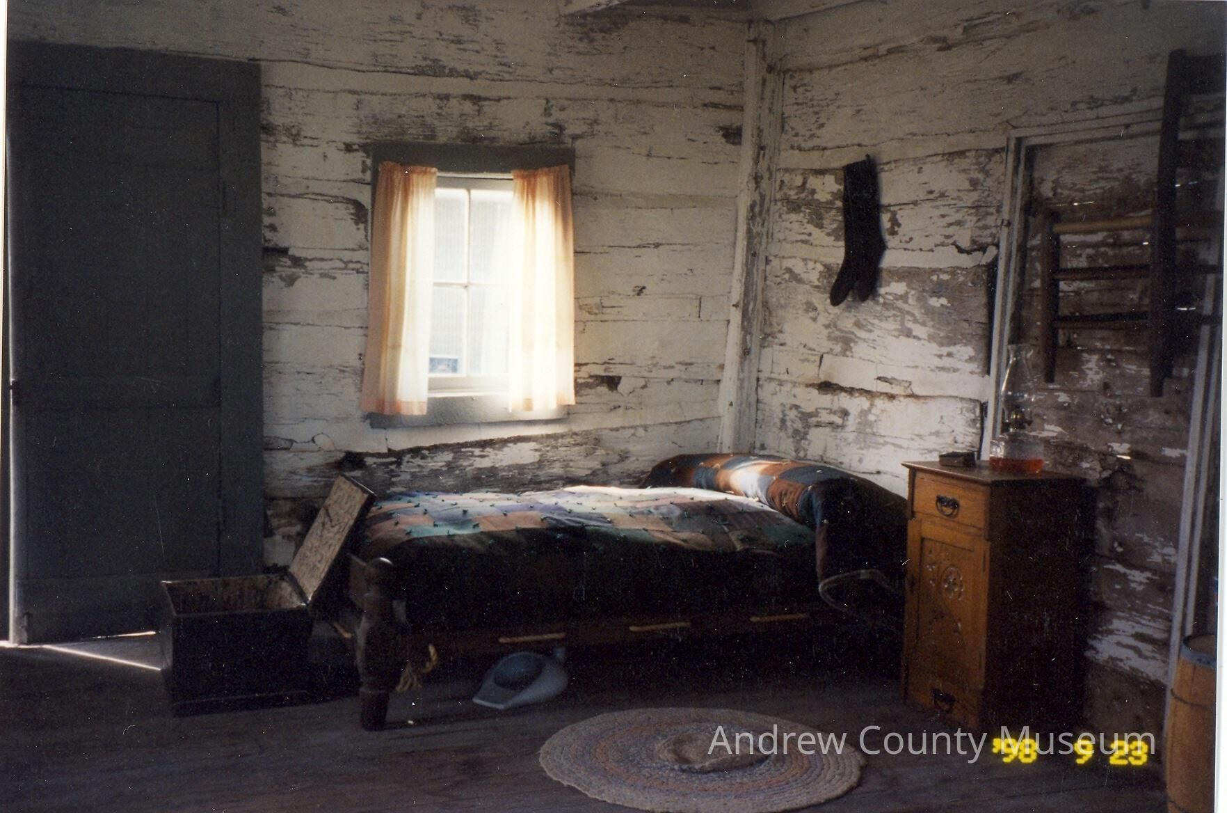 Finally, in 1980, the Marx cabin was moved next to the museum. At the time, only 3 log cabins of this age where known to exist in Andrew County. Pictured here is the Marx Cabin after being restored to what it would have looked like when Mathias Marx first moved into the cabin.
