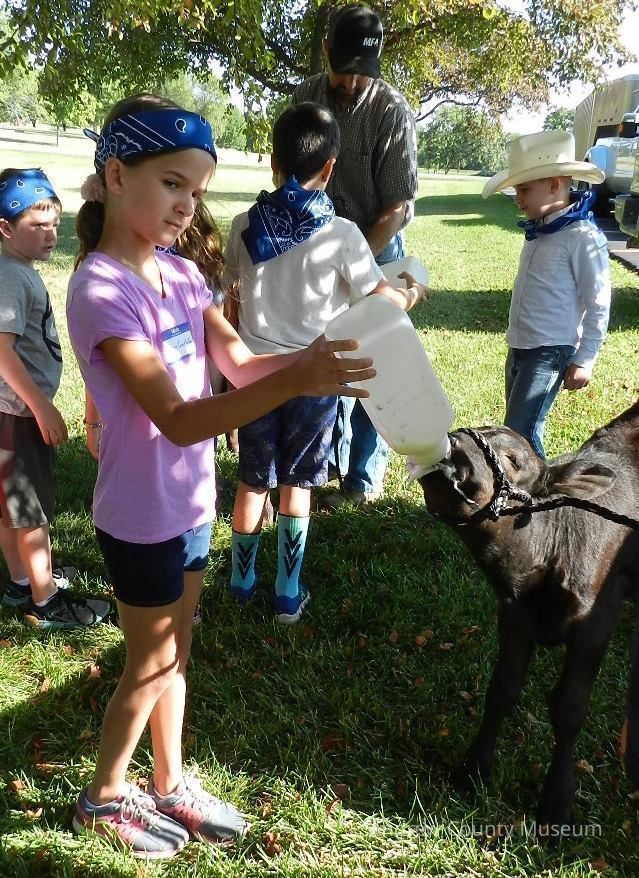 This is a photograph of a girl at Kids’ Camp in 2018, hosted by the Andrew County Museum. The girl is feeding a bottle to a calf. There are three young boys and a young girl standing directly behind her. One of the boys is feeding another bottle calf, but you cannot see the calf in the photo, only the bottle. A man is helping him feed the calf. The man is wearing an "MFA" hat. All the children are wearing blue bandanas. There is a truck with a cattle trailer in the background. They are all standing underneath a tree in the photo. They look to be standing in the side yard to the right of the museum. This photograph came from the Andrew County Museum Facebook page.Photograph Details