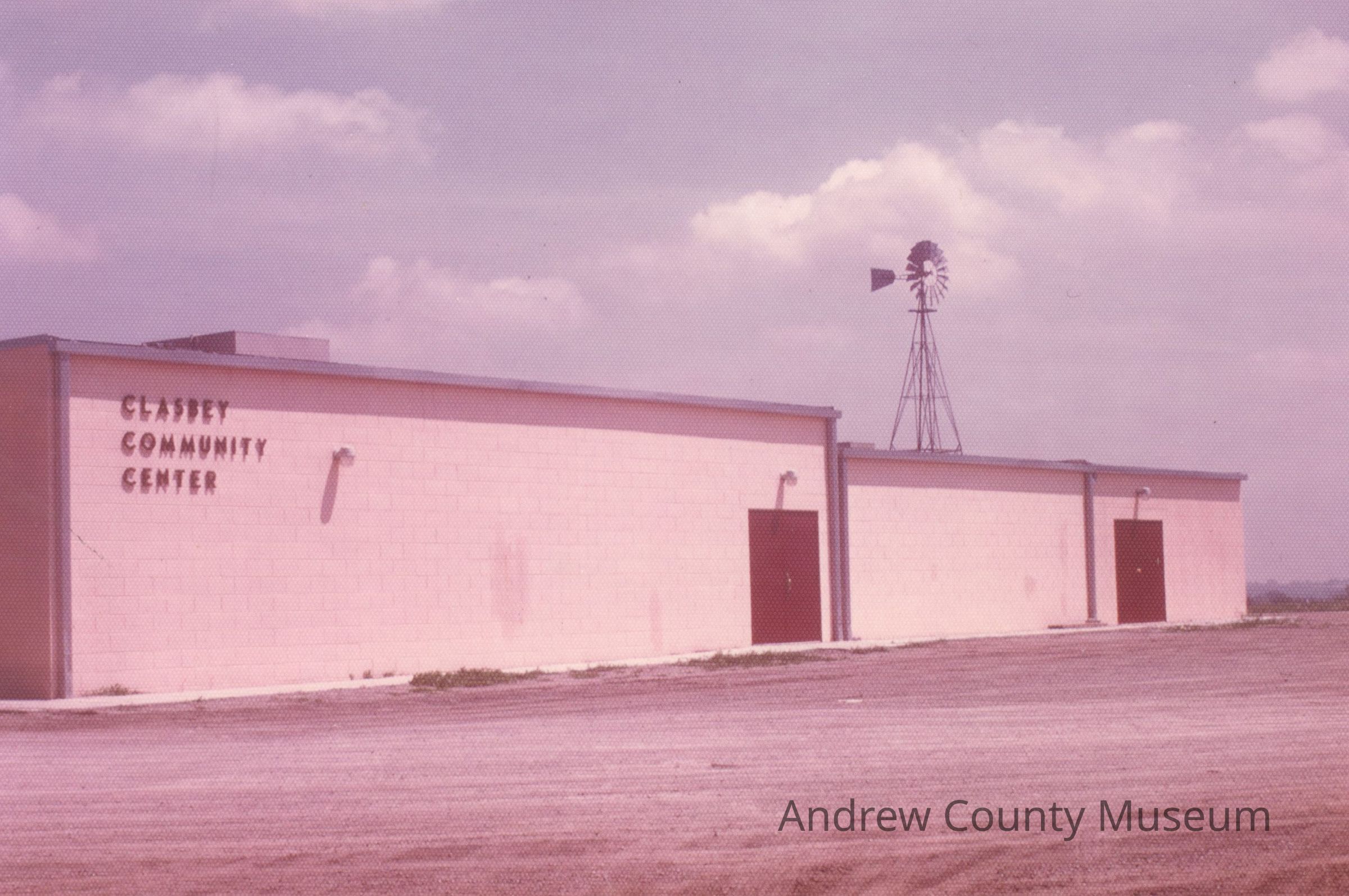 This is a picture of the Clasbey Community Center building, with two red double doors. The parking lot is a dirt and gravel lot, not paved. In the foreground, of the photo are tire marks and tracks visible in the parking lot. There are a few weeds near the sidewalk wrapped around the building. In the background, is a windmill and a distant view of some hills. A few light clouds above the building in the sky in the photo. The Clasbey Center is a light tan building with a dark colored roof and guttering. There are lights above each of the red doors and a light next to the Clasbey sign on the building.Made/Created