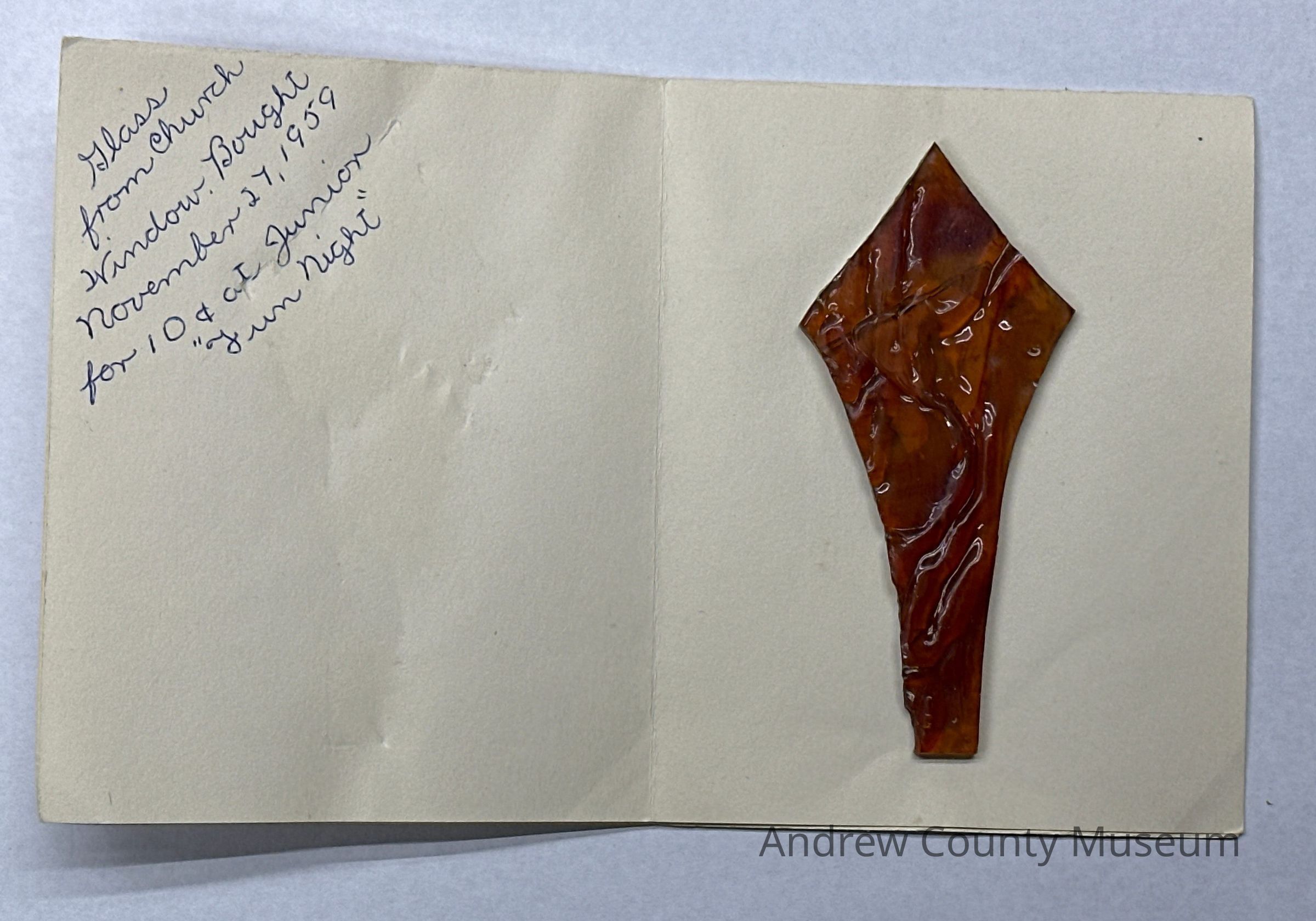 " Glass from Church window" bought November 27, 1959 for 10cents at Junior "Fun Night"Made/Created