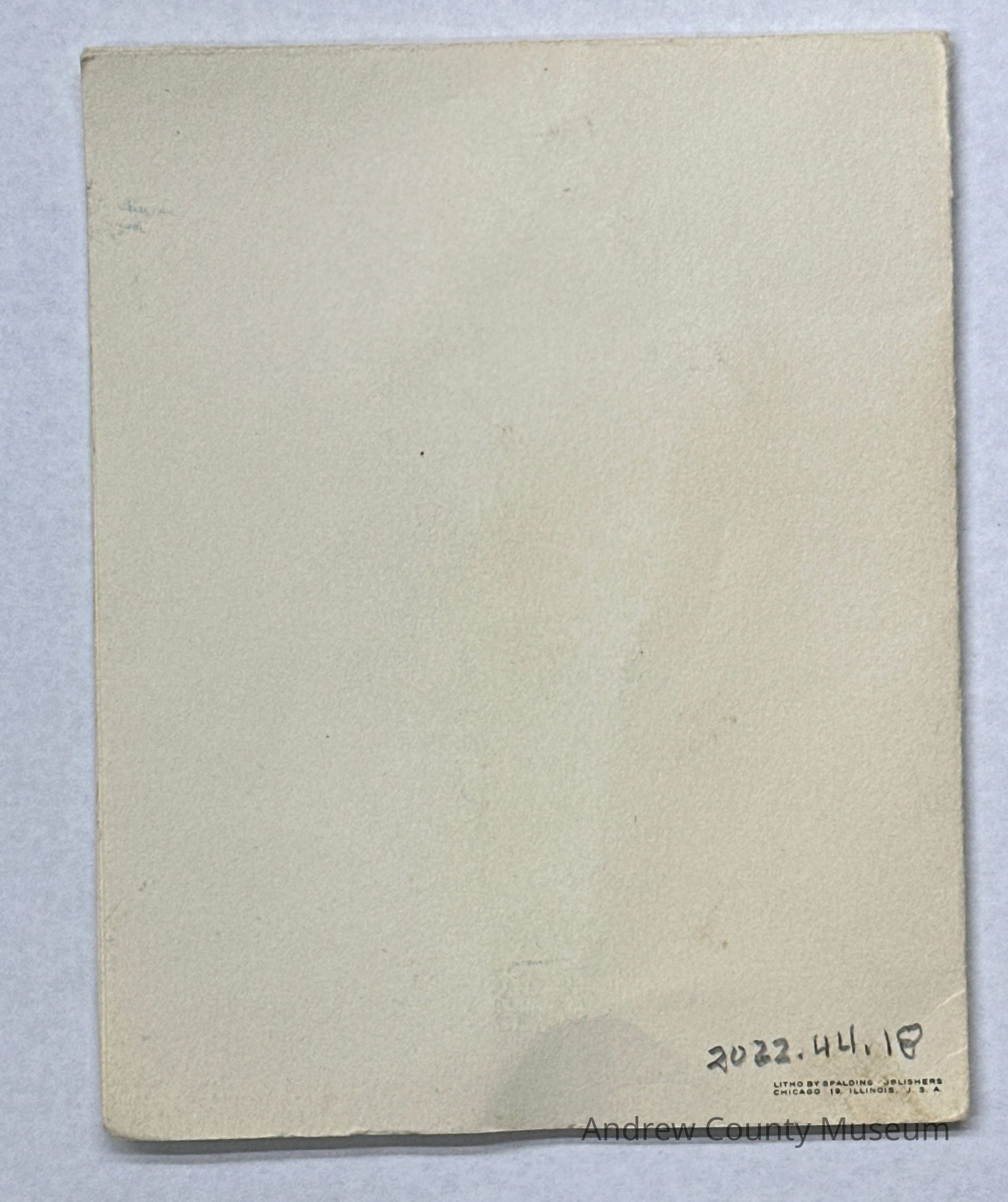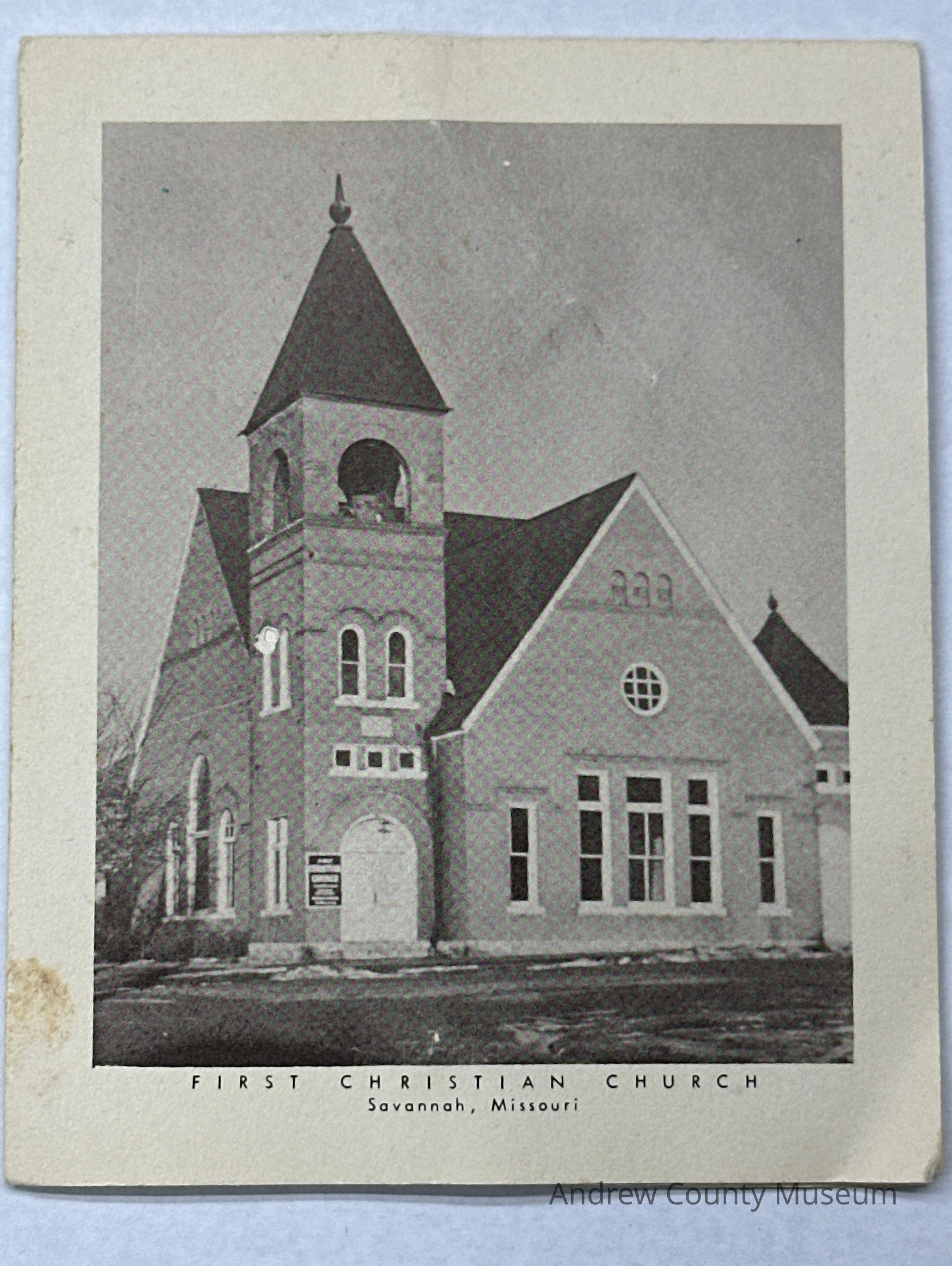The object is a card with a picture of the first Christian church on the front of Santa Savannah, Missouri. There is a Bell tower with curved white doors and a sign on the front of the church trees and shrubs on the left-hand side of the church. On the bottom of the picture, there are type words first Christian Church, Savannah, Missouri.Context