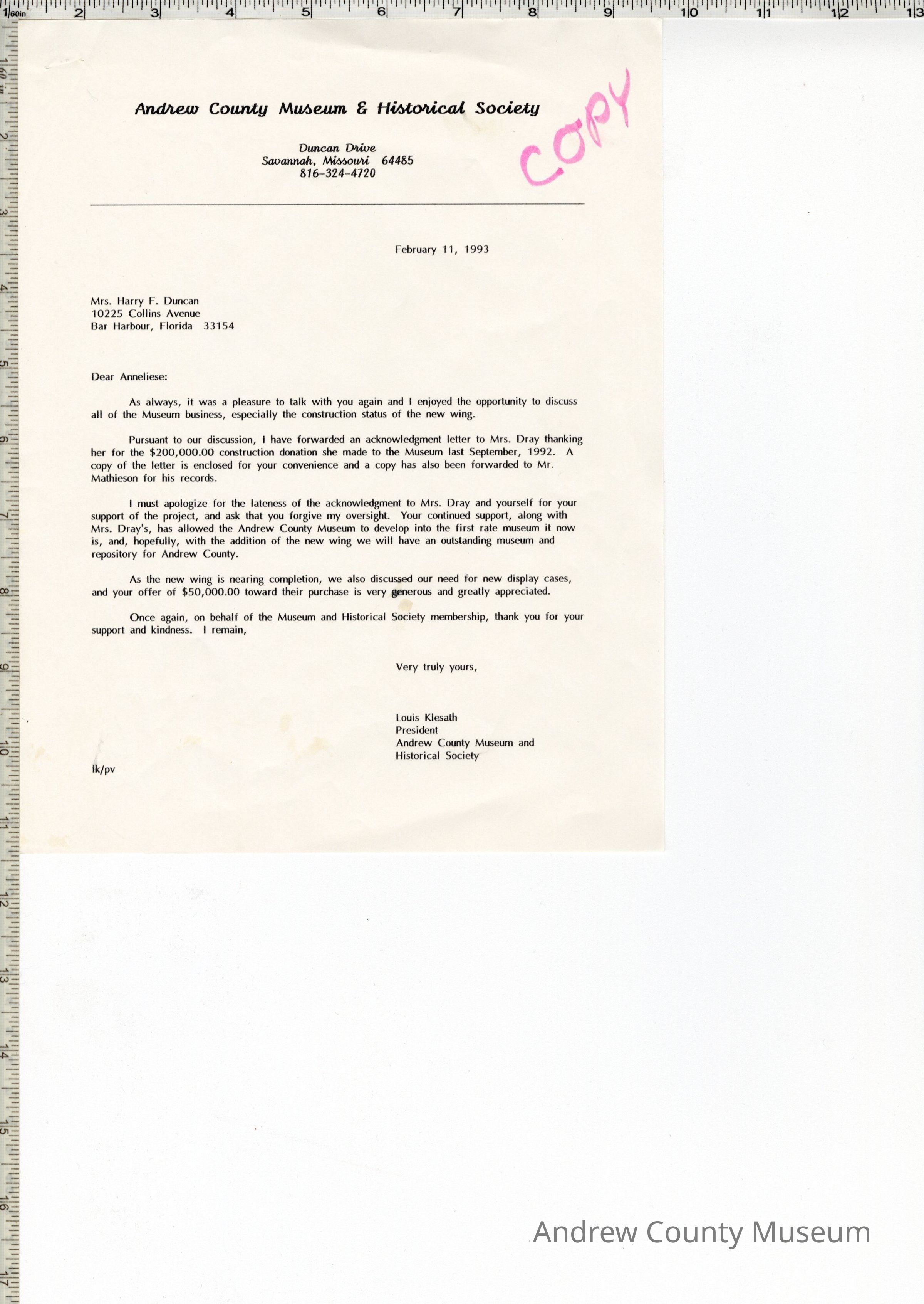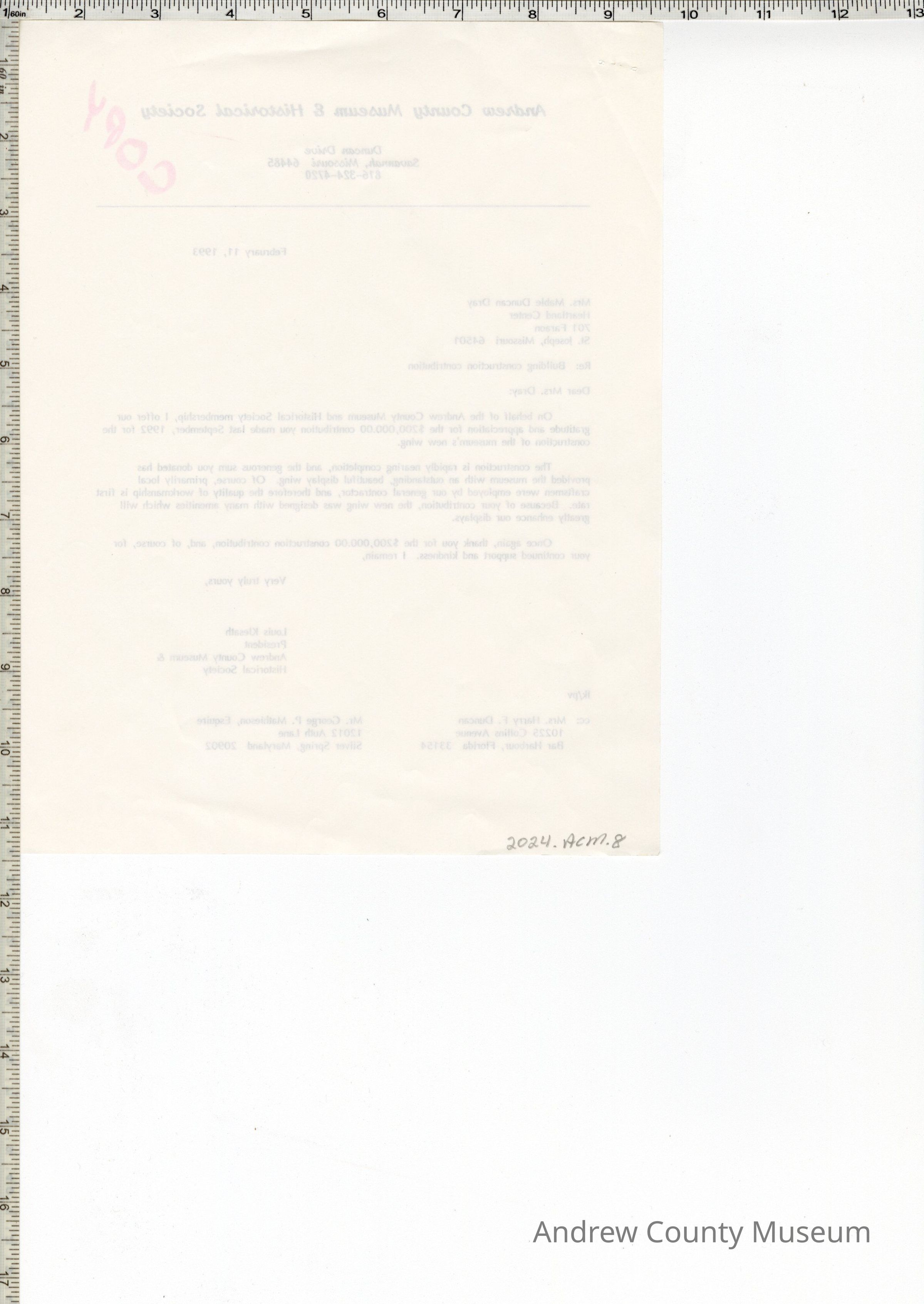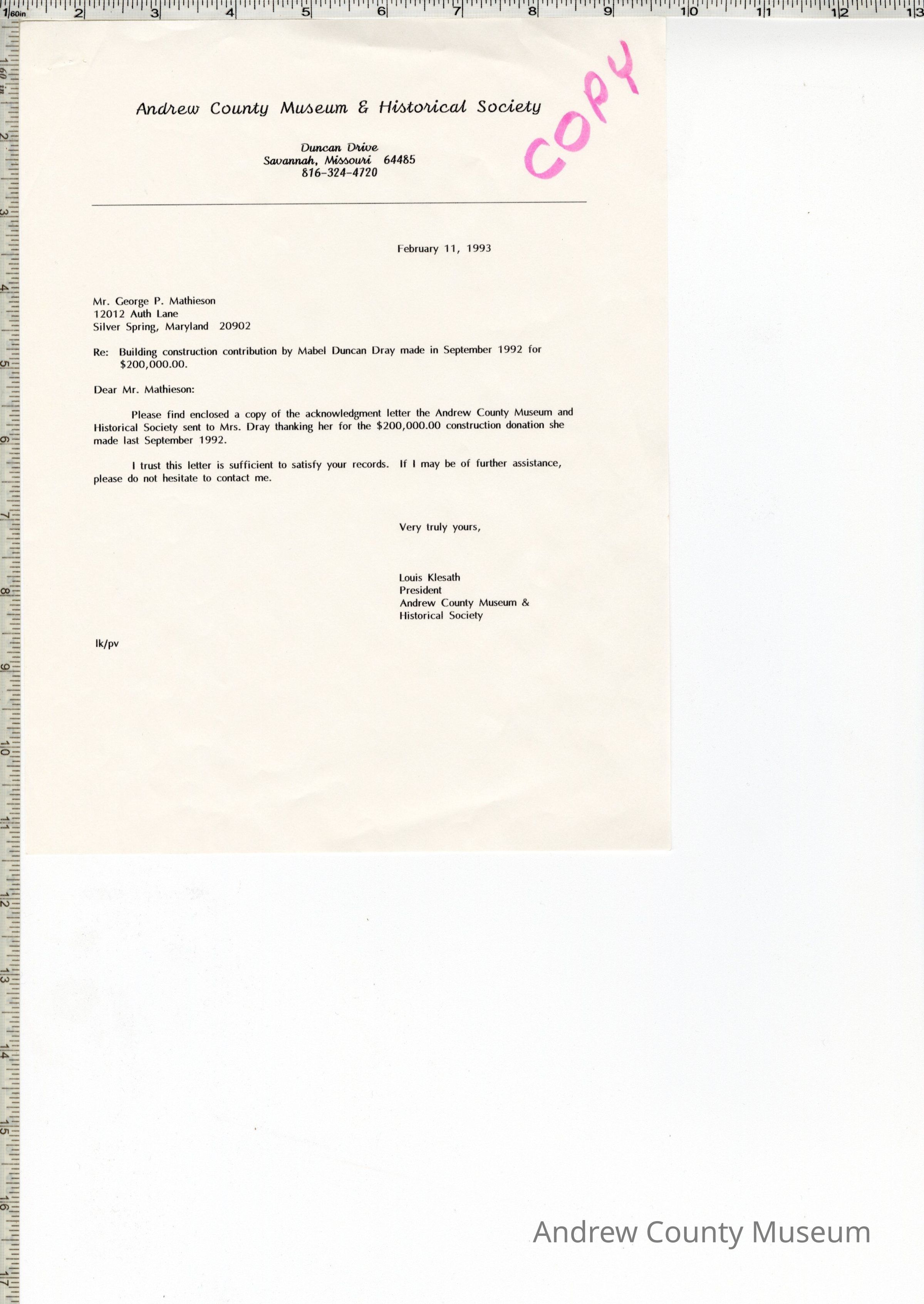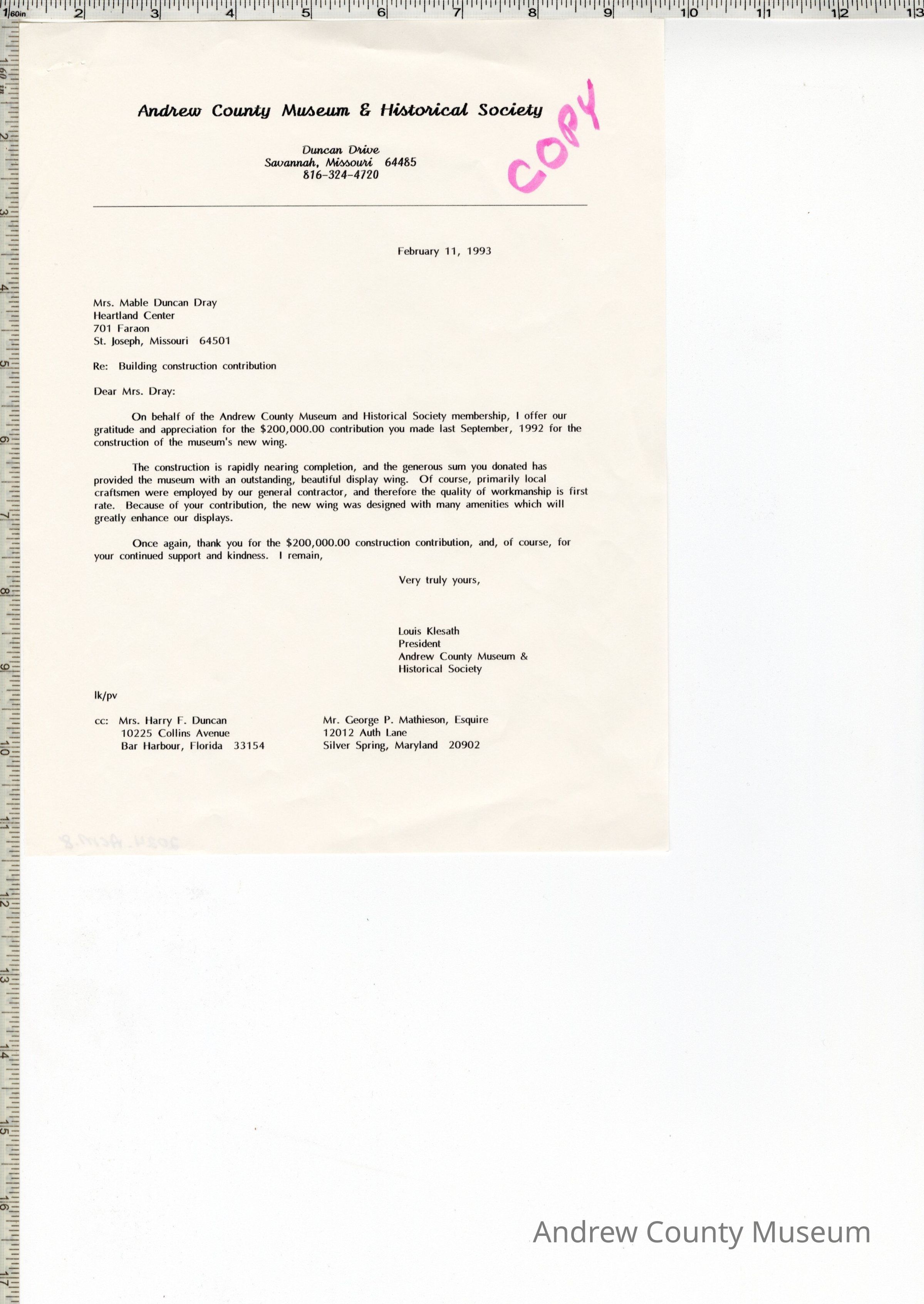 Three letters from the Andrew County Museum dated 2-11-93. The letters are on white paper and have "Copy" written on each of them in pink marker. The are typed in black ink, and are on Andrew County Museum letterhead. The letters are stapled together. All letters are regarding the $200,000 contribution made to the bu8ilding fund. First letter is to Mrs. Harry F. Duncan. The second letter is to Mr. George Mathieson and the third letter is to Mrs. Mable Duncan Dray. All of the letters are signed by Louis Klesath.