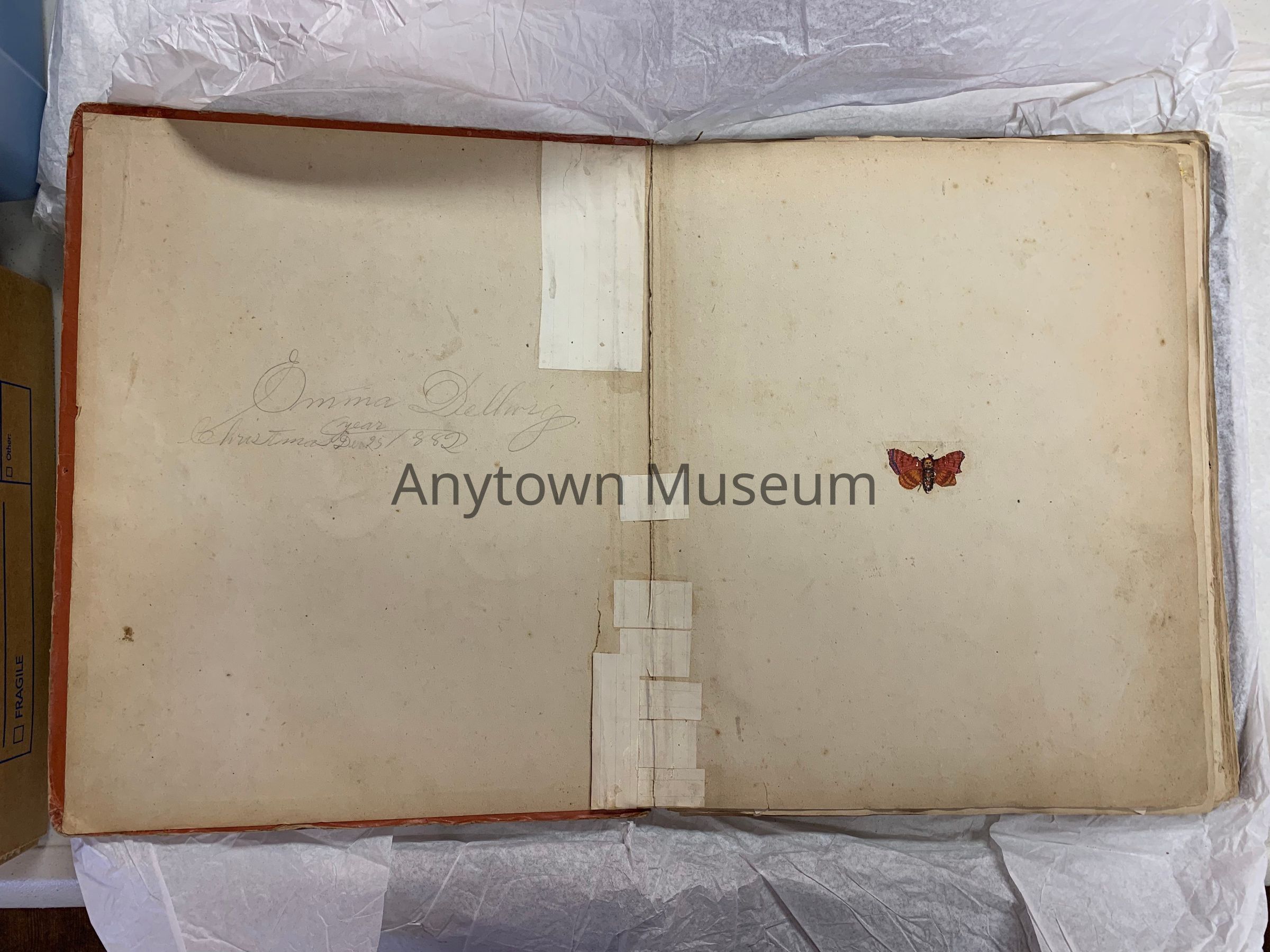 One hard-bound ephemera scrapbook. Cover is red with gold birds and floral designs embossed. Interior holds trade cards and other clipped-and-pasted paper media. Owned by Emma Dellory, 1882.
