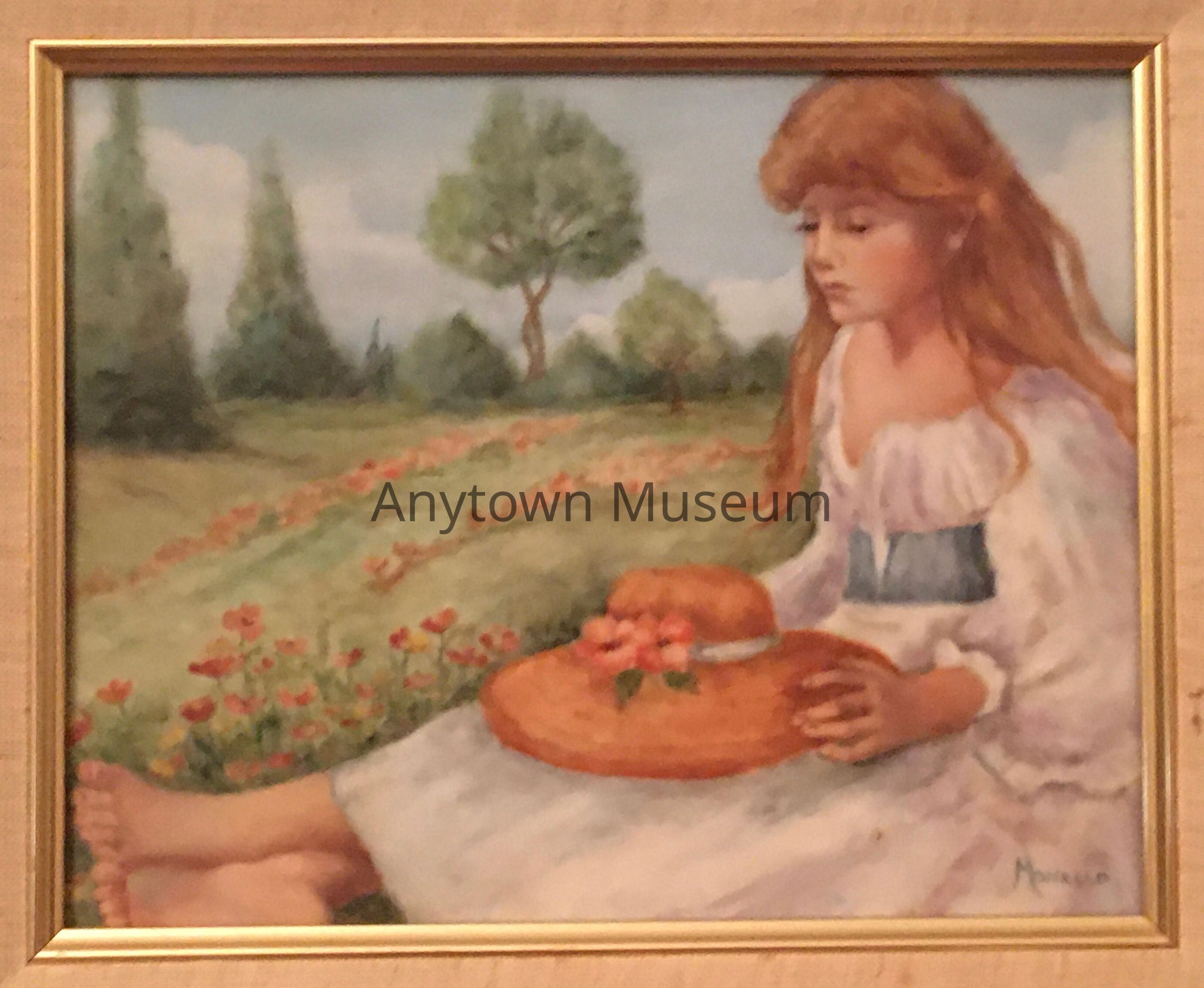 Oil on porcelain painting depicting a **young girl** (Bernice) sitting barefoot in the garden with her hat on her lap.Type of Painting