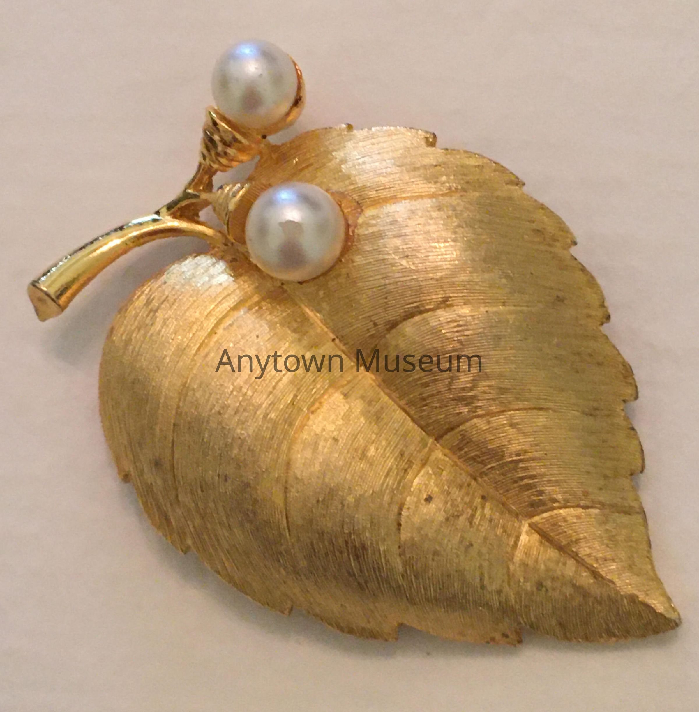 Gold brooch in the shape of a leaf with 2 pearl "berries"