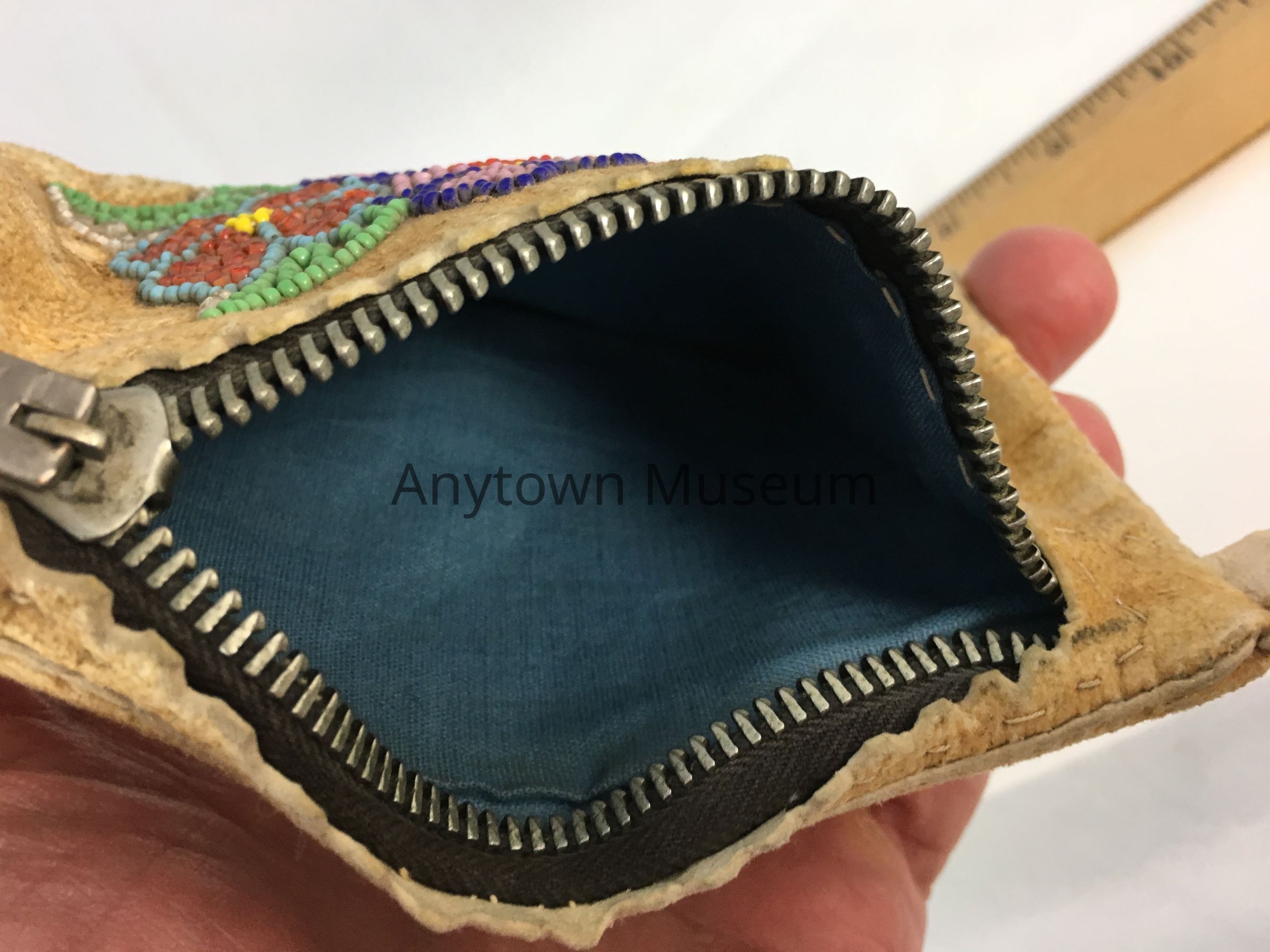 Tanned leather coin purse beaded with the flag of the Hudson Bay Company in front of floral designs. It is lined with blue cotton cloth and has a Lightning brand zipper hand-sewn in.