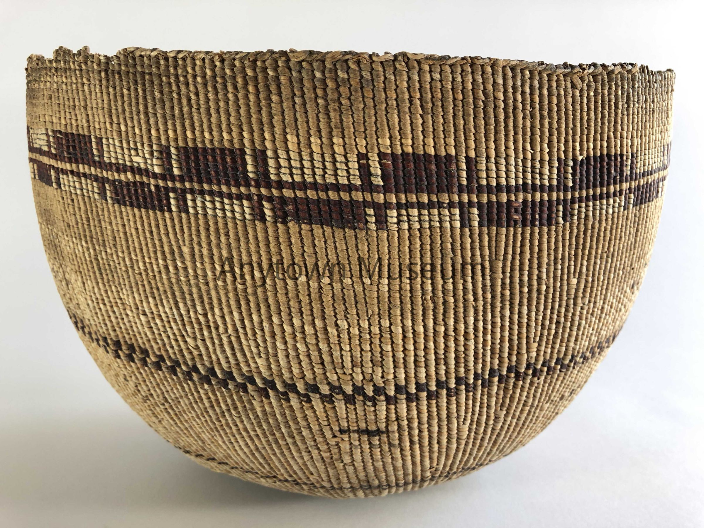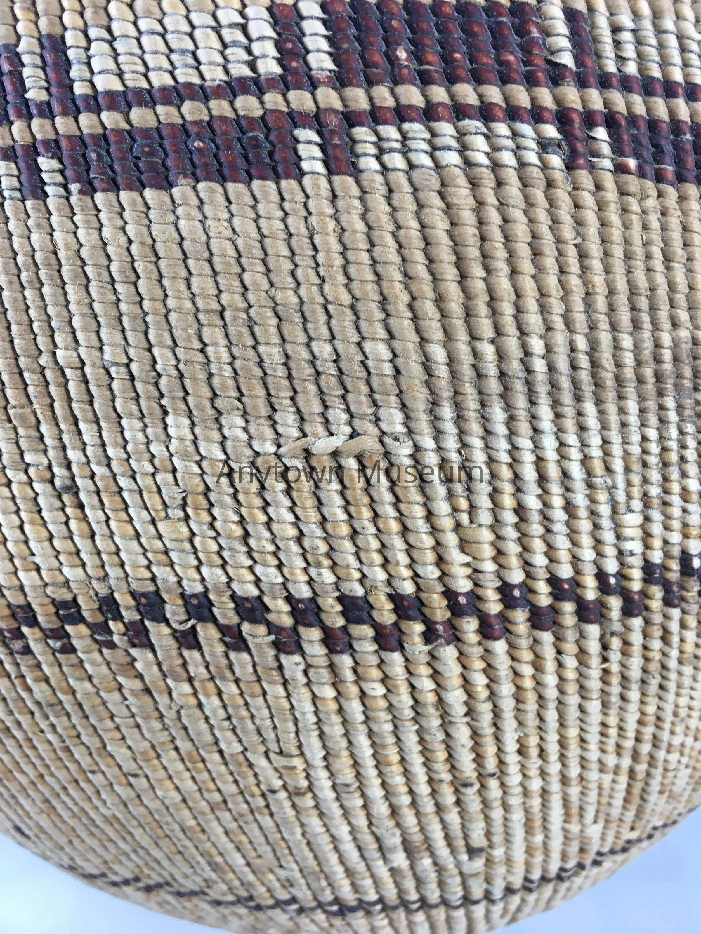 A mush bowl with much evidence of use including slight burn marks inside and a few minor burn marks on the outside. The bowl is decorated with two bands of half twist alternating red and white rectangles of peeled and unpeeled redbud approx. 1 1/2" below the rim, a non-twist "checkered" band of alternating rows of two redbud stitches about 2/3 down the basket and a second non-twist checkered band just above the shoulder.Use